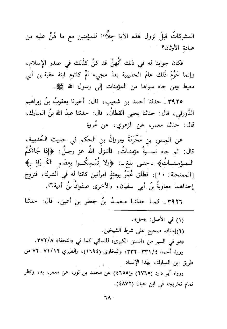 3925 - حَدَّثَنَا أَحْمَدُ بْنُ شُعَيْبٍ، قَالَ: أَخْبَرَنَا يَعْقُوبُ بْنُ إِبْرَاهِيمَ الدَّوْرَقِيُّ، قَالَ: حَدَّثَنَا يَحْيَى الْقَطَّانُ، قَالَ: حَدَّثَنَا عَبْدُ اللهِ بْنُ الْمُبَارَكِ، قَالَ: حَدَّثَنَا مَعْمَرٌ، عَنِ الزُّهْرِيِّ، عَنْ عُرْوَةَ، عَنِ الْمِسْوَرِ بْنِ مَخْرَمَةَ، وَمَرْوَانَ بْنِ الْحَكَمِ، فِي حَدِيثِ الْحُدَيْبِيَةِ، قَالَ: " ثُمَّ جَاءَ نِسْوَةٌ مُؤْمِنَاتٌ، فَأَنْزَلَ اللهُ عَزَّ وَجَلَّ: {إِذَا جَاءَكُمُ الْمُؤْمِنَاتُ} [الممتحنة: 10] حَتَّى بَلَغَ {وَلَا تُمْسِكُوا بِعِصَمِ الْكَوَافِرِ} [الممتحنة: 10] ، فَطَلَّقَ عُمَرُ يَوْمَئِذٍ امْرَأَتَيْنِ كَانَتَا لَهُ فِي الشِّرْكِ، فَتَزَوَّجَ إِحْدَاهُمَا مُعَاوِيَةُ بْنُ أَبِي سُفْيَانَ، وَالْأُخْرَى صَفْوَانُ بْنُ أُمَيَّةَ "