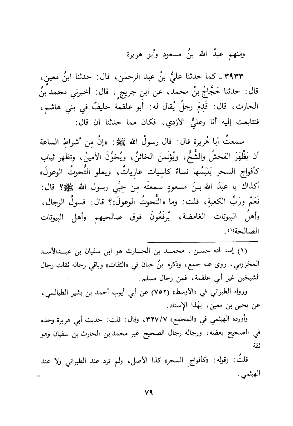 3933 - كَمَا حَدَّثَنَا عَلِيُّ بْنُ عَبْدِ الرَّحْمَنِ، قَالَ: حَدَّثَنَا ابْنُ مَعِينٍ، قَالَ: حَدَّثَنَا حَجَّاجُ بْنُ مُحَمَّدٍ، عَنِ ابْنِ جُرَيْجٍ، قَالَ: أَخْبَرَنِي مُحَمَّدُ بْنُ الْحَارِثِ، قَالَ: قَدِمَ رَجُلٌ يُقَالُ لَهُ: أَبُو عَلْقَمَةَ حَلِيفٌ فِي بَنِي هَاشِمٍ، فَتَتَابَعْتُ إِلَيْهِ أَنَا وَعَلِيٌّ الْأَزْدِيُّ، فَكَانَ مِمَّا حَدَّثَنَا أَنْ قَالَ: سَمِعْتُ أَبَا هُرَيْرَةَ، قَالَ: قَالَ رَسُولُ اللهِ صَلَّى اللَّهُ عَلَيْهِ وَسَلَّمَ: " إِنَّ مِنْ أَشْرَاطِ السَّاعَةِ أَنْ يَظْهَرَ الْفُحْشُ وَالشُّحُّ، وَيُؤْتَمَنَ الْخَائِنُ، وَيُخَوَّنَ الْأَمِينُ، وَتَظْهَرَ ثِيَابٌ كَأَفْوَاجِ السَّحَرِ، يَلْبَسُهَا نِسَاءٌ كَاسِيَاتٌ عَارِيَاتٌ، وَيَعْلُو التُّحُوتُ الْوُعُولَ " أَكَذَاكَ يَا عَبْدَ اللهِ بْنَ مَسْعُودٍ سَمِعْتَهُ مِنْ حِبِّي رَسُولِ اللهِ صَلَّى اللَّهُ عَلَيْهِ وَسَلَّمَ؟ قَالَ: نَعَمْ وَرَبِّ الْكَعْبَةِ، قُلْتُ: وَمَا التُّحُوتُ الْوُعُولَ؟ قَالَ: فُسُولُ الرِّجَالِ، وَأَهْلُ الْبُيُوتَاتِ الْغَامِضَةِ، يُرْفَعُونَ فَوْقَ صَالِحِيهِمْ وَأَهْلِ الْبُيُوتَاتِ الصَّالِحَةِ " -[80]- فَوَقَفْنَا بِذَلِكَ عَلَى جَلَالَةِ مِقْدَارِ أَبِي عَلْقَمَةَ هَذَا، وَأَنَّهُ مِنْ جِلَّةِ التَّابِعِينَ، وَأَنَّهُ قَدْ رَوَى عَنْهُ مِنْ أَهْلِ الْعِلْمِ صَالِحٌ أَبُو الْخَلِيلِ، وَعَبْدُ اللهِ بْنُ عُبَيْدِ بْنِ عُمَيْرٍ، وَقَدْ رَوَى عَنْهُ أَيْضًا يَعْلَى بْنُ عَطَاءٍ