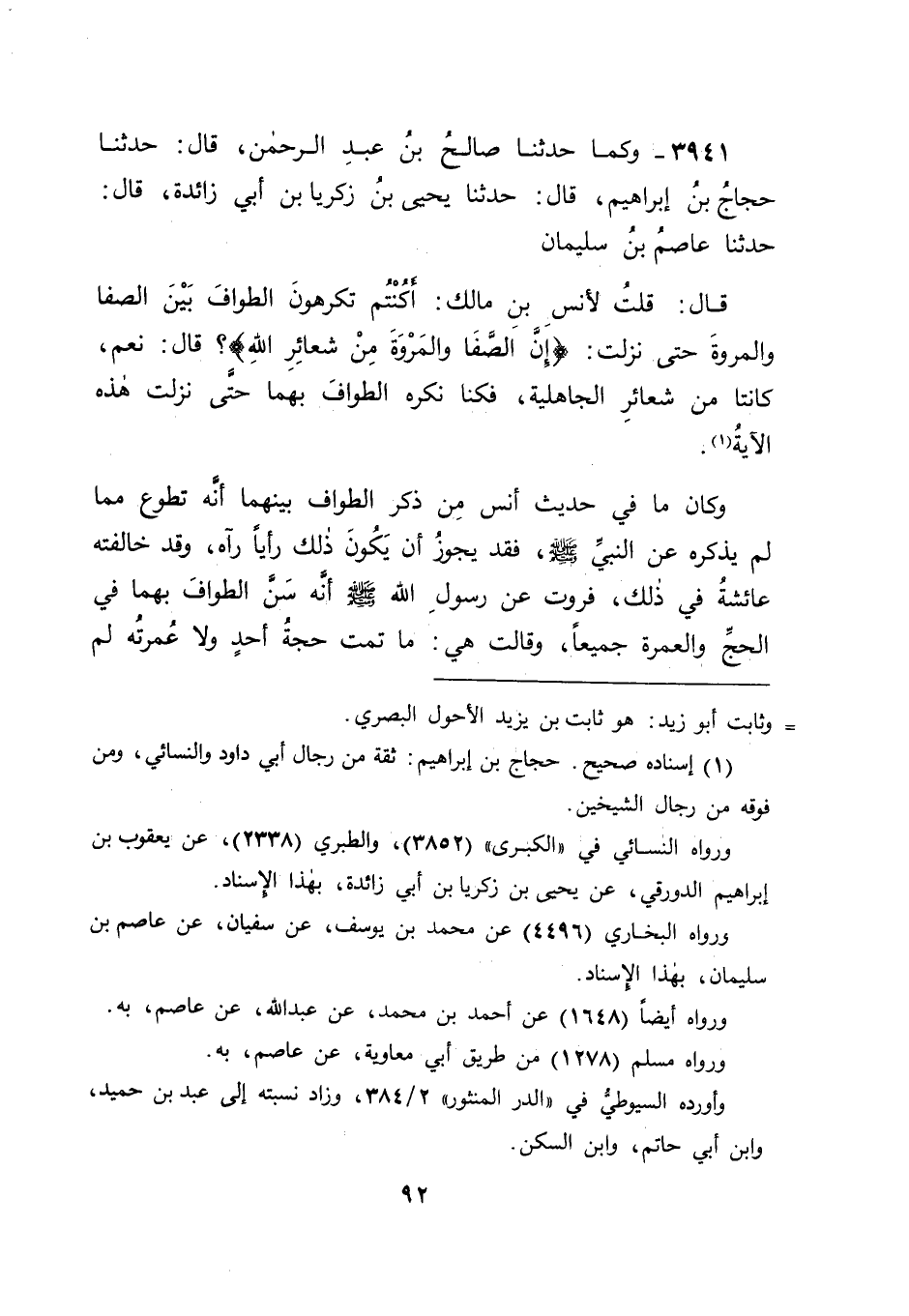3941 - وَكَمَا حَدَّثَنَا صَالِحُ بْنُ عَبْدِ الرَّحْمَنِ، قَالَ: حَدَّثَنَا حَجَّاجُ بْنُ إِبْرَاهِيمَ، قَالَ: حَدَّثَنَا يَحْيَى بْنُ زَكَرِيَّا بْنِ أَبِي زَائِدَةَ، قَالَ: حَدَّثَنَا عَاصِمُ بْنُ سُلَيْمَانَ، قَالَ: قُلْتُ لِأَنَسِ بْنِ مَالِكٍ: " أَكُنْتُمْ تَكْرَهُونَ الطَّوَافَ بَيْنَ الصَّفَا وَالْمَرْوَةِ حَتَّى نَزَلَتْ: {إِنَّ الصَّفَا وَالْمَرْوَةَ مِنْ شَعَائِرِ اللهِ} [البقرة: 158] ؟ قَالَ: نَعَمْ، كَانَتَا مِنْ شَعَائِرِ الْجَاهِلِيَّةِ، فَكُنَّا نَكْرَهُ الطَّوَافَ بِهِمَا حَتَّى نَزَلَتْ هَذِهِ الْآيَةُ " وَكَانَ مَا فِي حَدِيثِ أَنَسٍ مِنْ ذِكْرِ الطَّوَافِ بَيْنَهُمَا أَنَّهُ تَطَوُّعٌ مِمَّا لَمْ يَذْكُرْهُ عَنِ النَّبِيِّ صَلَّى اللَّهُ عَلَيْهِ وَسَلَّمَ، فَقَدْ يَجُوزُ أَنْ يَكُونَ ذَلِكَ رَأَيًا رَآهُ، وَقَدْ خَالَفَتْهُ عَائِشَةُ فِي ذَلِكَ، فَرَوَتْ عَنْ رَسُولِ اللهِ صَلَّى اللَّهُ عَلَيْهِ وَسَلَّمَ أَنَّهُ سَنَّ الطَّوَافَ بِهِمَا فِي الْحَجِّ وَالْعُمْرَةِ جَمِيعًا، وَقَالَتْ هِيَ: مَا تَمَّتْ حَجَّةُ أَحَدٍ وَلَا عُمْرَتُهُ لَمْ -[93]- يَطُفْ بَيْنَ الصَّفَا وَالْمَرْوَةِ، فَكَانَ ذَلِكَ عِنْدَنَا أَوْلَى مِنْ قَوْلِ أَنَسٍ لَا سِيَّمَا وَفُقَهَاءُ الْأَمْصَارِ عَلَيْهِ لَا يَخْتَلِفُونَ فِيهِ، وَلَمْ يَقُولُوا ذَلِكَ كَابِرًا عَنْ كَابِرٍ إِلَّا بِمَا وَجَبَ أَنْ يَقُولُوهُ بِهِ، وَكَانَ مَا خَالَفَ مَا هُمْ عَلَيْهِ مِنْ ذَلِكَ مِمَّا لَا مَعْنَى لَهُ، وَلَا يَصْلُحُ الْقَوْلُ بِهِ، وَاللهَ عَزَّ وَجَلَّ نَسْأَلُهُ التَّوْفِيقَ