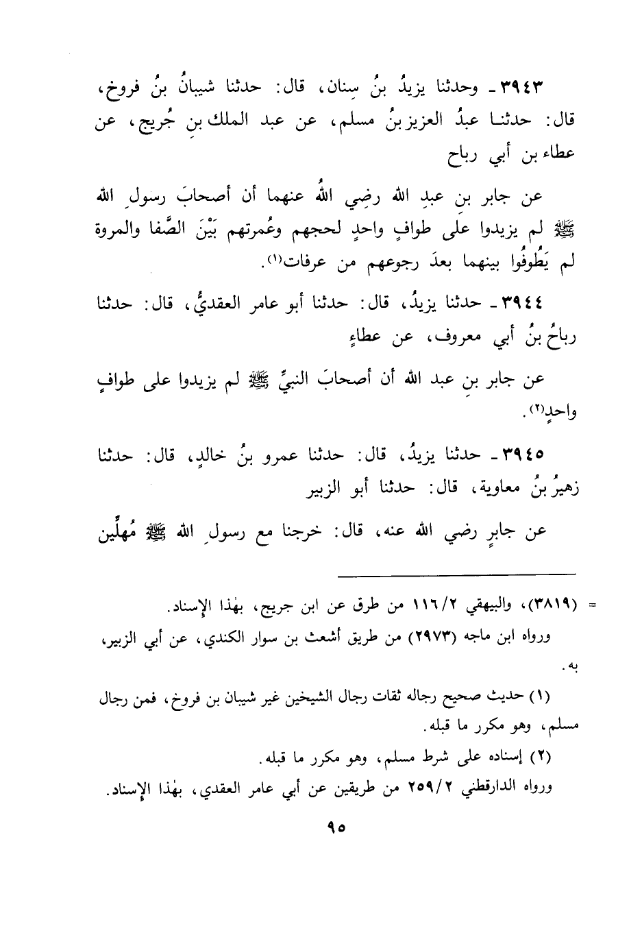 3943 - وَحَدَّثَنَا يَزِيدُ بْنُ سِنَانٍ، قَالَ: حَدَّثَنَا شَيْبَانُ بْنُ فَرُّوخَ، قَالَ: حَدَّثَنَا عَبْدُ الْعَزِيزِ بْنُ مُسْلِمٍ، عَنْ عَبْدِ الْمَلِكِ بْنِ جُرَيْجٍ، عَنْ عَطَاءِ بْنِ أَبِي رَبَاحٍ، عَنْ جَابِرِ بْنِ عَبْدِ اللهِ رَضِيَ اللهُ عَنْهُمَا: " أَنَّ أَصْحَابَ رَسُولِ اللهِ صَلَّى اللَّهُ عَلَيْهِ وَسَلَّمَ لَمْ يَزِيدُوا عَلَى طَوَافٍ وَاحِدٍ لِحَجِّهِمْ وَعُمْرَتِهِمْ بَيْنَ الصَّفَا وَالْمَرْوَةِ، لَمْ يَطُوفُوا بَيْنَهُمَا بَعْدَ رُجُوعِهِمْ مِنْ عَرَفَاتٍ "