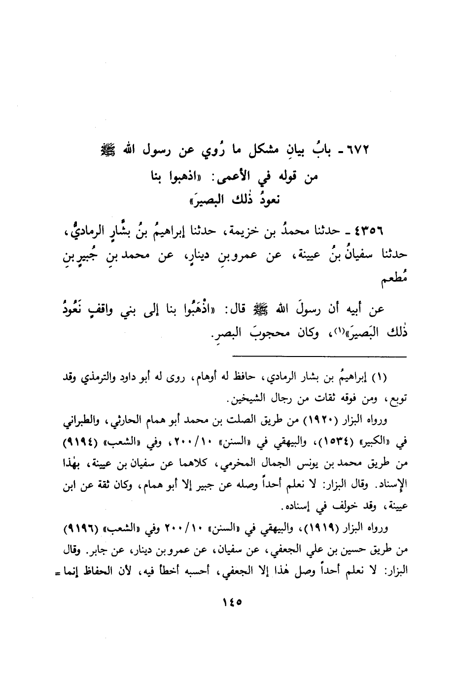 4356 - حَدَّثَنَا مُحَمَّدُ بْنُ خُزَيْمَةَ، حَدَّثَنَا إِبْرَاهِيمُ بْنُ بَشَّارِ الرَّمَادِيُّ، حَدَّثَنَا سُفْيَانُ بْنُ عُيَيْنَةَ، عَنْ عَمْرِو بْنِ دِينَارٍ، عَنْ مُحَمَّدِ بْنِ جُبَيْرِ بْنِ مُطْعِمٍ، عَنْ أَبِيهِ: أَنَّ رَسُولَ اللهِ صَلَّى اللَّهُ عَلَيْهِ وَسَلَّمَ قَالَ: " اذْهَبُوا بِنَا إِلَى بَنِي وَاقِفٍ نَعُودُ ذَلِكَ الْبَصِيرَ " وَكَانَ مَحْجُوبَ الْبَصَرِ -[146]- فَتَأَمَّلْنَا هَذَا الْحَدِيثَ لِنَقِفَ عَلَى الْمَعْنَى الَّذِي مِنْ أَجْلِهِ ذَكَرَ رَسُولُ اللهِ صَلَّى اللَّهُ عَلَيْهِ وَسَلَّمَ ذَلِكَ الرَّجُلَ الْبَصِيرَ وَهُوَ مَحْجُوبُ الْبَصَرِ، وَقَدْ ذَكَرَ اللهُ عَزَّ وَجَلَّ مَنْ هُوَ مِثْلَهُ فِي كِتَابِهِ بِالْعَمَى، فَمِنْ ذَلِكَ قَوْلُهُ تَعَالَى: {لَيْسَ عَلَى الْأَعْمَى حَرَجٌ} [الفتح: 17] وَقَوْلُهُ: {عَبَسَ وَتَوَلَّى أَنْ جَاءَهُ الْأَعْمَى} [عبس: 2] وَقَوْلُهُ: {وَمَا أَنْتَ بِهَادِي الْعُمْيِ عَنْ ضَلَالَتِهِمْ} [النمل: 81] وَقَوْلُهُ: {أَفَأَنْتَ تَهْدِي الْعُمْيَ وَلَوْ كَانُوا لَا يُبْصِرُونَ} [يونس: 43] . فَوَجَدْنَا اللهَ تَعَالَى قَدْ ذَكَرَ مَنْ بِهِ الْعَمَى بِغَيْرِ ذَلِكَ، فَقَالَ: {فَإِنَّهَا لَا تَعْمَى الْأَبْصَارُ وَلَكِنْ تَعْمَى الْقُلُوبُ الَّتِي فِي الصُّدُورِ} [الحج: 46] فَكَانَ فِي ذَلِكَ مَا قَدْ دَلَّ عَلَى أَنَّ الْأَعْمَى قَدْ يُقَالُ لَهُ: بَصِيرٌ لِبَصَرِهِ بِقَلْبِهِ مَا يُبْصِرُهُ بِهِ، وَإِنْ كَانَ مَحْجُوبَ الْبَصَرِ، فَدَلَّ ذَلِكَ أَنَّهُ جَائِزٌ أَنْ يُوصَفَ بِالْعَمَى الَّذِي يُبْصِرُ، وَجَائِزٌ أَنْ يُوصَفَ بِالْبَصَرِ الَّذِي فِي قَلْبِهِ، فَذَكَرَ رَسُولُ اللهِ صَلَّى اللَّهُ عَلَيْهِ وَسَلَّمَ ذَلِكَ الرَّجُلَ بِأَحْسَنِ أَمْرَيْهِ، وَإِنْ كَانَ لَهُ أَنْ يَذْكُرَهُ بِالْآخَرِ مِنْهُمَا، وَاللهَ نَسْأَلُهُ التَّوْفِيقَ.