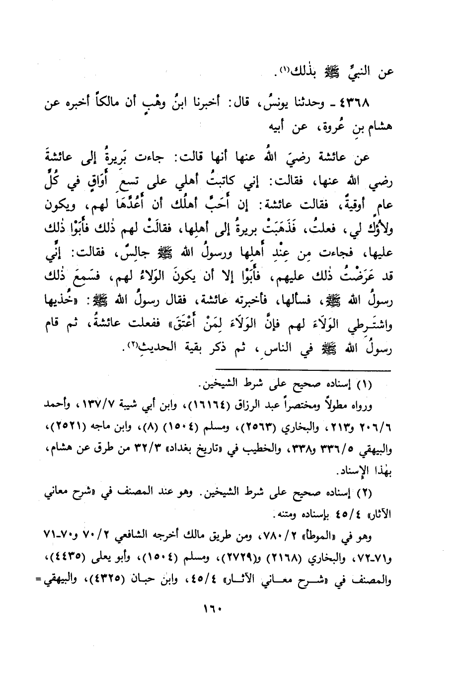 4368 - وَحَدَّثَنَا يُونُسُ، قَالَ: أَخْبَرَنَا ابْنُ وَهْبٍ، أَنَّ مَالِكًا أَخْبَرَهُ، عَنْ هِشَامِ بْنِ عُرْوَةَ، عَنْ أَبِيهِ، عَنْ عَائِشَةَ رَضِيَ اللهُ عَنْهَا أَنَّهَا قَالَتْ: جَاءَتْ بَرِيرَةُ إِلَى عَائِشَةَ رَضِيَ اللهُ عَنْهَا، فَقَالَتْ: إِنِّي كَاتَبْتُ أَهْلِي عَلَى تِسْعِ أَوَاقٍ فِي كُلِّ عَامٍ أُوقِيَّةٌ، فَقَالَتْ عَائِشَةُ: إِنْ أَحَبَّ أَهْلُكِ أَنْ أَعُدَّهَا لَهُمْ، وَيَكُونُ وَلَاؤُكِ لِي، فَعَلْتُ، فَذَهَبَتْ بَرِيرَةُ إِلَى أَهْلِهَا، فَقَالَتْ لَهُمْ ذَلِكَ فَأَبَوْا ذَلِكَ عَلَيْهَا، فَجَاءَتْ مِنْ عِنْدِ أَهْلِهَا وَرَسُولُ اللهِ صَلَّى اللَّهُ عَلَيْهِ وَسَلَّمَ جَالِسٌ، فَقَالَتْ: إِنِّي قَدْ عَرَضْتُ ذَلِكَ عَلَيْهِمْ، فَأَبَوْا إِلَّا أَنْ يَكُونَ الْوَلَاءُ لَهُمْ، فَسَمِعَ ذَلِكَ رَسُولُ اللهِ صَلَّى اللَّهُ عَلَيْهِ وَسَلَّمَ، فَسَأَلَهَا، فَأَخْبَرَتْهُ عَائِشَةُ، فَقَالَ رَسُولُ اللهِ صَلَّى اللَّهُ عَلَيْهِ وَسَلَّمَ: " خُذِيهَا وَاشْتَرِطِي الْوَلَاءَ لَهُمْ، فَإِنَّ الْوَلَاءَ لِمَنْ أَعْتَقَ " فَفَعَلَتْ عَائِشَةُ، ثُمَّ قَامَ رَسُولُ اللهِ صَلَّى اللَّهُ عَلَيْهِ وَسَلَّمَ فِي النَّاسِ ثُمَّ ذَكَرَ بَقِيَّةَ الْحَدِيثِ -[161]- قَالَ أَبُو جَعْفَرٍ: فَفِي هَذَيْنِ الْحَدِيثَيْنِ مَا قَدْ دَلَّ عَلَى أَنَّهُ لَا يَجِبُ عَلَى مَنْ كَاتَبَ عَبْدَهُ وَضْعُ شَيْءٍ مِنْ كِتَابَتِهِ عَنْهُ، وَأَنَّ قَوْلَ اللهِ تَعَالَى: {وَآتُوهُمْ مِنْ مَالِ اللهِ الَّذِي آتَاكُمْ} [النور: 33] عَلَى الْحَثِّ وَالْحَضِّ عَلَى الْخَيْرِ مِنْ مَعُونَةِ الْمُكَاتَبِينَ مِمَّنْ كَاتَبَهُمْ وَمِمَّنْ سِوَاهُمْ مِنْ أَمْوَالِهِمْ حَتَّى يُعْتِقُوا بِخُرُوجِهِمْ مِنْ مُكَاتَبَاتِهِمْ، كَمَا قَالَ هَذَا الْقَوْلَ مَنْ قَالَهُ مِنْ أَهْلِ الْعِلْمِ، مِنْهُمْ أَبُو حَنِيفَةَ، وَمَالِكٌ، وَالثَّوْرِيُّ، وَزُفَرُ، وَأَبُو يُوسُفَ، وَمُحَمَّدٌ، وَخِلَافُ مَا قَالَهُ مَنْ سِوَاهُمْ مِنْ أَهْلِ الْعِلْمِ، مِنْهُمُ الشَّافِعِيُّ، وَذَهَبُوا إِلَى أَنَّ تَأْوِيلَ قَوْلِهِ عَزَّ وَجَلَّ: {وَآتُوهُمْ مِنْ مَالِ اللهِ الَّذِي آتَاكُمْ} [النور: 33] عَلَى الْوُجُوبِ وَالْحَتْمِ، لَا عَلَى النَّدْبِ وَالْحَضِّ، وَعَلَى أَنَّ ذَلِكَ مِنَ الْمُكَاتَبَةِ الَّتِي يُكَاتِبُونَهُمْ عَلَيْهَا. وَفِي الْحَدِيثَيْنِ اللَّذَيْنِ رَوَيْنَا وُقُوفُ رَسُولِ اللهِ صَلَّى اللَّهُ عَلَيْهِ وَسَلَّمَ عَلَى أَنَّ بَرِيرَةَ لَمْ تَكُنْ قَضَتْ مِنْ كِتَابَتِهَا شَيْئًا، وَعَلَى قَوْلِ عَائِشَةَ لَهَا: ارْجِعِي إِلَى أَهْلِكِ، فَإِنْ أَحَبُّوا أَنْ أُعْطِيَهُمْ ذَلِكَ جَمِيعًا، أَوْ أَعُدَّهَا لَهُمْ جَمِيعًا، وَيَكُونُ وَلَاؤُكِ لِي، فَعَلْتُ، وَتَرَكَ رَسُولُ اللهِ صَلَّى اللَّهُ عَلَيْهِ وَسَلَّمَ إِنْكَارَ ذَلِكَ عَلَيْهَا، فَدَلَّ ذَلِكَ عَلَى وُجُوبِ الْمُكَاتَبَةِ كُلِّهَا لِلْمُكَاتِبِينَ عَلَى الْمُكَاتَبِينَ؛ لِأَنَّهُ لَوْ كَانَ الْوَضْعُ وَاجِبًا عَلَيْهِمْ مِنْهَا لِمَنْ يُكَاتِبُوهُ، لَقَالَ لِعَائِشَةَ: وَلِمَ تَدْفَعِينَ إِلَيْهِمْ عَنْهَا مَا لَا يَجِبُ لَهُمْ عَلَيْهَا، وَمَا قَدْ أَوْجَبَ اللهُ عَزَّ وَجَلَّ لَهَا عَلَيْهِمْ إِسْقَاطُهُ عَنْهَا، وَمِثْلُ ذَلِكَ أَيْضًا مَا قَدْ رُوِيَ عَنْهُ صَلَّى اللَّهُ عَلَيْهِ وَسَلَّمَ فِيمَا كَانَ مِنْهُ فِي جُوَيْرِيَةَ ابْنَةِ الْحَارِثِ بْنِ أَبِي ضِرَارٍ