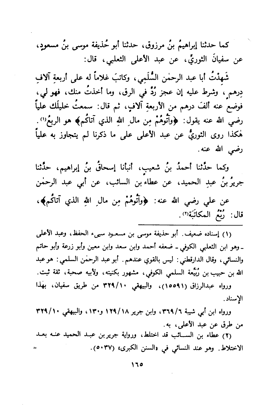 كَمَا حَدَّثَنَا إِبْرَاهِيمُ بْنُ مَرْزُوقٍ، حَدَّثَنَا أَبُو حُذَيْفَةَ مُوسَى بْنُ مَسْعُودٍ، عَنْ سُفْيَانَ الثَّوْرِيِّ، عَنِ عَبْدِ الْأَعْلَى الثَّعْلَبِيِّ، قَالَ: شَهِدْتُ أَبَا عَبْدِ الرَّحْمَنِ السُّلَمِيَّ وَكَاتَبَ غُلَامًا لَهُ عَلَى أَرْبَعَةِ آلَافِ دِرْهَمٍ، وَشَرَطَ عَلَيْهِ إِنْ عَجَزَ رُدَّ فِي الرِّقِّ، وَمَا أَخَذْتُ مِنْكَ فَهُوَ لِي، فَوَضَعَ عَنْهُ أَلْفَ دِرْهَمٍ مِنَ الْأَرْبَعَةِ آلَافٍ، ثُمَّ قَالَ: سَمِعْتُ خَلِيلَكَ عَلِيًّا رَضِيَ اللهُ عَنْهُ يَقُولُ: " {وَآتُوهُمْ مِنْ مَالِ اللهِ الَّذِي آتَاكُمْ} [النور: 33] هُوَ الرُّبُعُ " هَكَذَا رَوَى الثَّوْرِيُّ، عَنْ عَبْدِ الْأَعْلَى عَلَى مَا ذَكَرْنَا لَمْ يَتَجَاوَزْ بِهِ عَلِيًّا رَضِيَ اللهُ عَنْهُ.