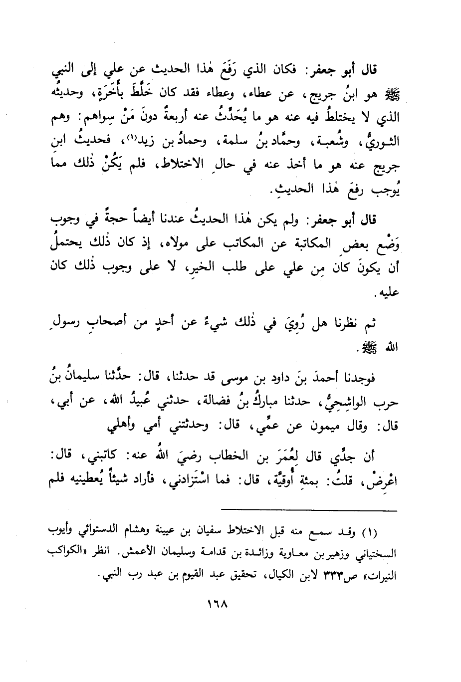 فَوَجَدْنَا أَحْمَدَ بْنَ دَاوُدَ بْنِ مُوسَى قَدْ حَدَّثَنَا، قَالَ: حَدَّثَنَا سُلَيْمَانُ بْنُ حَرْبٍ الْوَاشِحِيُّ، حَدَّثَنَا مُبَارَكُ بْنُ فَضَالَةَ، حَدَّثَنِي عُبَيْدُ اللهِ، عَنْ أَبِي، قَالَ: وَقَالَ مَيْمُونٌ: عَنْ عَمِّي، قَالَ: وَحَدَّثَتْنِي أُمِّي وَأَهْلِي: أَنَّ جَدِّي قَالَ لِعُمَرَ بْنِ الْخَطَّابِ رَضِيَ اللهُ عَنْهُ: كَاتِبْنِي، قَالَ: " اعْرِضْ " قُلْتُ: بِمِائَةِ أُوقِيَّةٍ، قَالَ: " فَمَا اسْتَزَادَنِي، فَأَرَادَ شَيْئًا يُعْطِينِيهِ فَلَمْ -[169]- يَجِدْ "، فَأَرْسَلَ إِلَى حَفْصَةَ، فَقَالَ: " إِنِّي قَدْ كَاتَبْتُ غُلَامِي، وَأَنَا أُرِيدُ أَنْ أُعْطِيَهُ شَيْئًا، فَابْعَثِي إِلَيَّ بِدَرَاهِمَ "، فَأَرْسَلَتْ إِلَيْهِ بِمِائَتَيْ دِرْهَمٍ، فَقَالَ: " خُذْهَا بَارَكَ اللهُ لَكَ فِيهَا "، فَبَارَكَ اللهُ عَزَّ وَجَلَّ لِي فِيهَا، قَدْ أَعْتَقْتُ غَيْرَ وَاحِدٍ مِنْهَا، فَاسْتَأْذَنْتُهُ، فَقُلْتُ: يَا أَمِيرَ الْمُؤْمِنِينَ، إِنِّي أُرِيدُ أَنْ تَأْذَنَ لِي أَنْ آتِيَ الْعِرَاقَ، قَالَ: " أَمَّا إِذَا كَاتَبْتُكَ فَاذْهَبْ حَيْثُ شِئْتَ "، فَأَرَادَ مَوَالٍ لِبَنِي غِفَارٍ أَنْ يَصْحَبُونِي، فَقَالُوا: كَلِّمْ أَمِيرَ الْمُؤْمِنِينَ أَنْ يَكْتُبَ لَنَا كِتَابًا نُكْرَمُ بِهِ، قَالَ: وَقَدْ عَلِمْتُ أَنَّهُ سَيَكْرَهُ ذَلِكَ، فَكَلَّمَتْهُ، فَانْتَهَزَنِي وَمَا انْتَهَزَنِي قَبْلَهَا، فَقَالَ: " أَتُرِيدُ أَنْ تَظْلِمَ النَّاسَ؟ أَنْتَ أُسْوَةُ الْمُسْلِمِينَ " فَخَرَجْتُ، فَلَمَّا قَدِمْنَا جِئْتُ مَعِي بِنَمَطٍ وَطُنْفُسَةٍ، فَقُلْتُ: يَا أَمِيرَ الْمُؤْمِنِينَ، هَذَانِ هَدِيَّةٌ لَكَ، فَنَظَرَ إِلَيْهِمَا فَأَعْجَبَاهُ، ثُمَّ رَدَّهُمَا عَلَيَّ وَقَالَ: " إِنَّهُ قَدْ بَقِيَتْ بَقِيَّةٌ مِنْ مُكَاتَبَتِكَ، فَاسْتَعِنْ بِهِمَا فِي مُكَاتَبَتِكَ " -[170]- قَالَ أَبُو جَعْفَرٍ: فَكَانَ فِي هَذَا الْحَدِيثِ عَنْ عُمَرَ مَا قَدْ دَلَّ عَلَى أَنَّهُ لَمْ يَضَعْ عَنْهُ مِنْ مُكَاتَبَتِهِ شَيْئًا