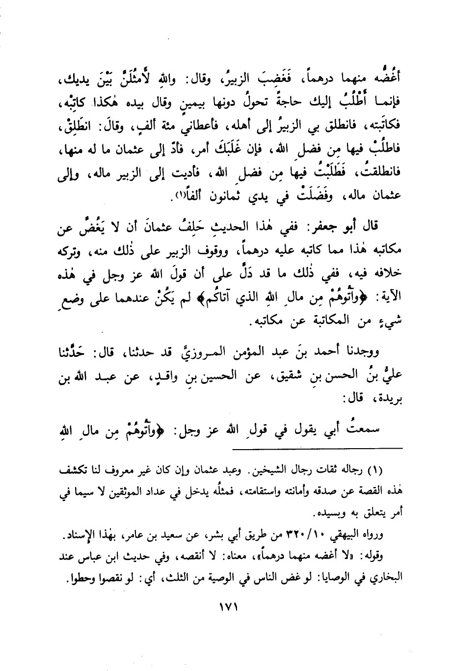 وَوَجَدْنَا أَحْمَدَ بْنَ عَبْدِ الْمُؤْمِنِ الْمَرْوَزِيَّ قَدْ حَدَّثَنَا، قَالَ: حَدَّثَنَا عَلِيُّ بْنُ الْحَسَنِ بْنِ شَقِيقٍ، عَنِ الْحُسَيْنِ بْنِ وَاقِدٍ، عَنْ عَبْدِ اللهِ بْنِ بُرَيْدَةَ، قَالَ: سَمِعْتُ أَبِي يَقُولُ فِي قَوْلِ اللهُ عَزَّ وَجَلَّ: {وَآتُوهُمْ مِنْ مَالِ اللهِ -[172]- الَّذِي آتَاكُمْ} [النور: 33] ، قَالَ: " حَثَّ النَّاسَ عَلَى ذَلِكَ " قَالَ أَبُو جَعْفَرٍ: وَفِي ذَلِكَ مَا قَدْ دَلَّ عَلَى مَا ذَكَرْنَاهُ فِي هَذَا الْبَابِ أَنَّ ذَلِكَ عَلَى الْحَضِّ، لَا عَلَى الْوُجُوبِ؛ لِأَنَّهُ لَمَّا كَانَ النَّاسُ غَيْرُ الْمُتَكَاتِبِينَ قَدْ أُرِيدَ ذَلِكَ مِنْهُمْ لَا عَلَى أَنَّهُ وَاجِبٌ عَلَيْهِمْ، كَانَ كَذَلِكَ الْمُكَاتَبُونَ أُرِيدَ ذَلِكَ مِنْهُمْ، لَا عَلَى الْوُجُوبِ عَلَيْهِمْ، وَلَمَّا اخْتُلِفَ فِي ذَلِكَ عَلَى مَا ذَكَرْنَا، كَانَ الْأَوْلَى مِمَّا قَدْ قِيلَ فِيهِ مَا قَدْ وَافَقَ مَا قَدْ رُوِيَ عَنْ رَسُولِ اللهِ صَلَّى اللَّهُ عَلَيْهِ وَسَلَّمَ، ثُمَّ عَمَّنْ قَدْ ذَكَرْنَا مِنْ أَصْحَابِهِ، وَاللهَ نَسْأَلُهُ التَّوْفِيقَ.