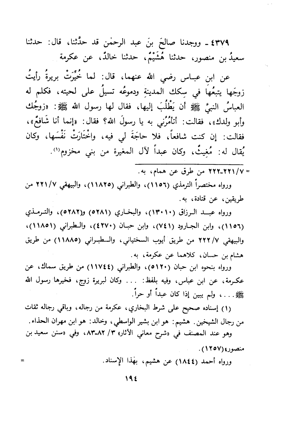 4379 - وَوَجَدْنَا صَالِحَ بْنَ عَبْدِ الرَّحْمَنِ قَدْ حَدَّثَنَا، قَالَ: حَدَّثَنَا سَعِيدُ بْنُ مَنْصُورٍ، حَدَّثَنَا هُشَيْمٌ، حَدَّثَنَا خَالِدٌ، عَنْ عِكْرِمَةَ، عَنِ ابْنِ عَبَّاسٍ، رَضِيَ اللهُ عَنْهُمَا، قَالَ: لَمَّا خُيِّرَتْ بَرِيرَةُ رَأَيْتُ زَوْجَهَا يَتْبَعُهَا فِي سِكَكِ الْمَدِينَةِ وَدُمُوعُهُ تَسِيلُ عَلَى لِحْيَتِهِ، فَكَلَّمَ لَهُ الْعَبَّاسُ النَّبِيَّ صَلَّى اللَّهُ عَلَيْهِ وَسَلَّمَ أَنْ يَطْلُبَ إِلَيْهَا، فَقَالَ لَهَا رَسُولُ اللهِ صَلَّى اللَّهُ عَلَيْهِ وَسَلَّمَ: " زَوْجُكِ، وَأَبُو وَلَدِكِ " فَقَالَتْ: أَتَأْمُرُنِي بِهِ يَا رَسُولَ اللهِ؟ فَقَالَ: " إِنَّمَا أَنَا شَافِعٌ " فَقَالَتْ: إِنْ كُنْتَ شَافِعًا، فَلَا حَاجَةَ لِي فِيهِ، وَاخْتَارَتْ نَفْسَهَا، وَكَانَ يُقَالُ لَهُ مُغِيثٌ، وَكَانَ عَبْدًا لِآلِ الْمُغِيرَةِ مِنْ بَنِي مَخْزُومٍ " -[195]- قَالَ أَبُو جَعْفَرٍ: فَفِي هَذَا عَنِ ابْنِ عَبَّاسٍ بِلَا اخْتِلَافٍ عَنْهُ أَنَّهُ كَانَ عَبْدًا، وَلَمَّا وَقَعَ هَذَا الِاخْتِلَافُ فِي هَذَا الْمَعْنَى وَجَبَ تَصْحِيحُ مَا رُوِيَ فِيهِ إِذْ كُنَّا نَجِدُ السَّبِيلَ إِلَى ذَلِكَ، فَوَجَبَ أَنْ يَكُونَ قَدْ كَانَ عَبْدًا فِي حَالٍ، وَكَانَ حُرًّا فِي حَالٍ آخَرَ، فَكَانَتْ حَالُ الْعُبُودِيَّةِ قَدْ تَكُونَ بَعْدَهَا الْحُرِّيَّةُ، وَحَالُ الْحُرِّيَّةِ لَا يَكُونُ بَعْدَهَا الْعُبُودِيَّةُ، فَجَعَلْنَاهُ قَدْ كَانَ عَبْدًا فِي الْبَدْءِ، ثُمَّ صَارَ حُرًّا بَعْدَ ذَلِكَ فِي الْحَالِ الَّتِي خُيِّرَتْ زَوْجَتُهُ بَيْنَ الْمُقَامِ عِنْدَهُ وَبَيْنَ فِرَاقِهِ، ثُمَّ رَجَعْنَا إِلَى مَا يُوجِبُهُ النَّظَرُ فِي ذَلِكَ، فَوَجَدْنَا الْأَمَةَ لِمَوْلَاهَا أَنْ يُزَوِّجَهَا فِي حَالِ مِلْكِهِ لَهَا مِمَّنْ رَأَى مِنَ الْأَحْرَارِ وَمِنَ الْمَمَالِيكِ، وَوَجَدْنَاهُ إِذَا أَعْتَقَهَا وَلَهَا زَوْجٌ مَمْلُوكٌ قَدْ كَانَ زَوَّجَهَا إِيَّاهُ أَنَّ لَهَا الْخِيَارَ فِي فِرَاقِهِ، وَفِي الْمُقَامِ عِنْدَهُ، وَاخْتَلَفُوا إِذَا كَانَ حُرًّا، فَقَالَ بَعْضُهُمْ: هُوَ كَذَلِكَ أَيْضًا، وَمِمَّنْ قَالَ ذَلِكَ مِنْهُمْ أَبُو حَنِيفَةَ، وَالثَّوْرِيُّ وَأَصْحَابُهُمَا جَمِيعًا. وَقَالَ بَعْضُهُمْ: لَا خِيَارَ لَهَا فِي فِرَاقِهِ، وَمِمَّنْ قَالَ ذَلِكَ مِنْهُمْ مَالِكٌ وَعَامَّةُ أَهْلِ الْحِجَازِ. وَاعْتَلَّ لَهُمْ مُعْتَلٌّ، فَقَالَ: إِنَّمَا جُعِلَ لَهَا الْخِيَارُ إِذَا كَانَ زَوْجُهَا عَبْدًا؛ لِأَنَّهُ لَا يَسْتَطِيعُ تَزْوِيجَ بَنَاتِهَا وَلَا تَحْصِينَهَا كَمَا يُحْصِنُهَا الْحُرُّ، فَجَعَلَ لَهَا الْخِيَارَ لِذَلِكَ بَيْنَ فِرَاقِهِ وَبَيْنَ الْمُقَامِ مَعَهُ، فَكَانَ لِمُخَالِفِيهِمْ عَلَيْهِمْ فِي ذَلِكَ مِنْ رَدِّ الْأَمْرِ الَّذِي لَهُ خُيِّرَتْ فِي ذَلِكَ أَنَّهُ إِنَّمَا هُوَ -[196]- لِمِلْكِهَا نَفْسَهَا، فُجِعَلَ لَهَا إِمْضَاءُ مَا قَدْ عَقَدَهُ مَوْلَاهَا عَلَيْهَا وَرَفْعُهُ عَنْ نَفْسِهَا، وَخُولِفَ فِي ذَلِكَ بَيْنَهَا وَبَيْنَ الصِّبْيَةِ إِذَا زَوَّجَهَا أَبُوهَا قَبْلَ بُلُوغِهَا ثُمَّ بَلَغَتْ، فَلَمْ يُجْعَلْ لَهَا خِيَارٌ فِي فِرَاقِ مَنْ كَانَ أَبُوهَا زَوَجَّهَا إِيَّاهُ، حُرًّا كَانَ أَوْ عَبْدًا، وَلَمَّا اسْتَوَى الْحُكْمُ فِيمَنْ كَانَ أَبُوهَا زَوَّجَهَا إِيَّاهُ حُرًّا كَانَ أَوْ عَبْدًا فِي حَالِ وِلَايَتِهِ عَلَيْهَا مِنَ الْأَحْرَارِ وَمِنَ الْمَمَالِيكِ فِي أَنْ لَا خِيَارَ لَهَا فِي فِرَاقِهِ، كَانَ كَذَلِكَ الْأَمَةُ إِذَا أُعْتِقَتْ، فَرَجَعَ أَمْرُهَا إِلَيْهَا يَسْتَوِي حُكْمُهَا فِيمَا كَانَ مَوْلَاهَا عَقَدَهُ عَلَيْهَا فِي حَالِ مِلْكِهِ لَهَا مِنَ الْأَحْرَارِ وَمِنَ الْمَمَالِيكِ، فَكَمَا كَا