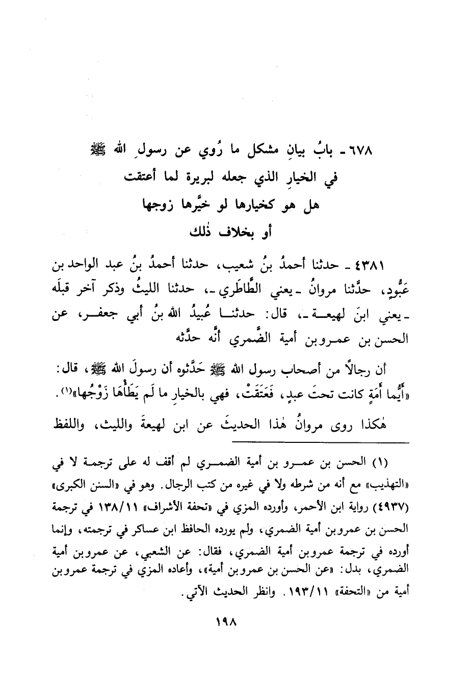 4381 - حَدَّثَنَا أَحْمَدُ بْنُ شُعَيْبٍ، حَدَّثَنَا أَحْمَدُ بْنُ عَبْدِ الْوَاحِدِ بْنِ عَبُّودٍ، حَدَّثَنَا مَرْوَانُ يَعْنِي الطَّاطَرِيَّ، حَدَّثَنَا اللَّيْثُ، وَذَكَرَ آخَرَ قَبْلَهُ يَعْنِي ابْنَ لَهِيعَةَ قَالَ: حَدَّثَنَا عُبَيْدُ اللهِ بْنُ أَبِي جَعْفَرٍ، عَنِ الْحَسَنِ بْنِ عَمْرِو بْنِ أُمَيَّةَ الضَّمْرِيِّ، أَنَّهُ حَدَّثَهُ أَنَّ رِجَالًا مِنْ أَصْحَابِ رَسُولِ اللهِ صَلَّى اللَّهُ عَلَيْهِ وَسَلَّمَ حَدَّثُوهُ: أَنَّ رَسُولَ اللهِ صَلَّى اللَّهُ عَلَيْهِ وَسَلَّمَ، قَالَ: " أَيُّمَا أَمَةٍ كَانَتْ تَحْتَ عَبْدٍ فَعُتِقَتْ، فَهِيَ بِالْخِيَارِ مَا لَمْ يَطَأْهَا زَوْجُهَا ". هَكَذَا رَوَى مَرْوَانُ هَذَا الْحَدِيثَ، عَنِ ابْنِ لَهِيعَةَ وَاللَّيْثِ، وَاللَّفْظُ -[199]- وَاحِدٌ، وَقَدْ رَوَاهُ ابْنُ وَهْبٍ عَنْهُمَا بِأَلْفَاظٍ مُخْتَلِفَةٍ