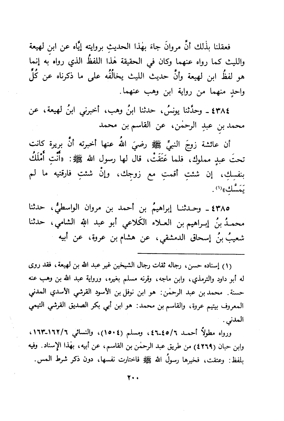 4384 - وَحَدَّثَنَا يُونُسُ، حَدَّثَنَا ابْنُ وَهْبٍ، أَخْبَرَنِي ابْنُ لَهِيعَةَ، عَنْ مُحَمَّدِ بْنِ عَبْدِ الرَّحْمَنِ، عَنِ الْقَاسِمِ بْنِ مُحَمَّدٍ، أَنَّ عَائِشَةَ، زَوْجَ النَّبِيِّ صَلَّى اللَّهُ عَلَيْهِ وَسَلَّمَ، رَضِيَ اللهُ عَنْهَا أَخْبَرَتْهُ: أَنَّ بَرِيرَةَ كَانَتْ تَحْتَ عَبْدٍ مَمْلُوكٍ، فَلَمَّا عَتَقَتْ، قَالَ لَهَا رَسُولُ اللهِ صَلَّى اللَّهُ عَلَيْهِ وَسَلَّمَ: " أَنْتِ أَمْلَكُ بِنَفْسِكِ، إِنْ شِئْتِ أَقَمْتِ مَعَ زَوْجِكِ، وَإِنْ شِئْتِ فَارَقْتِيهِ مَا لَمْ يَمَسَّكِ "