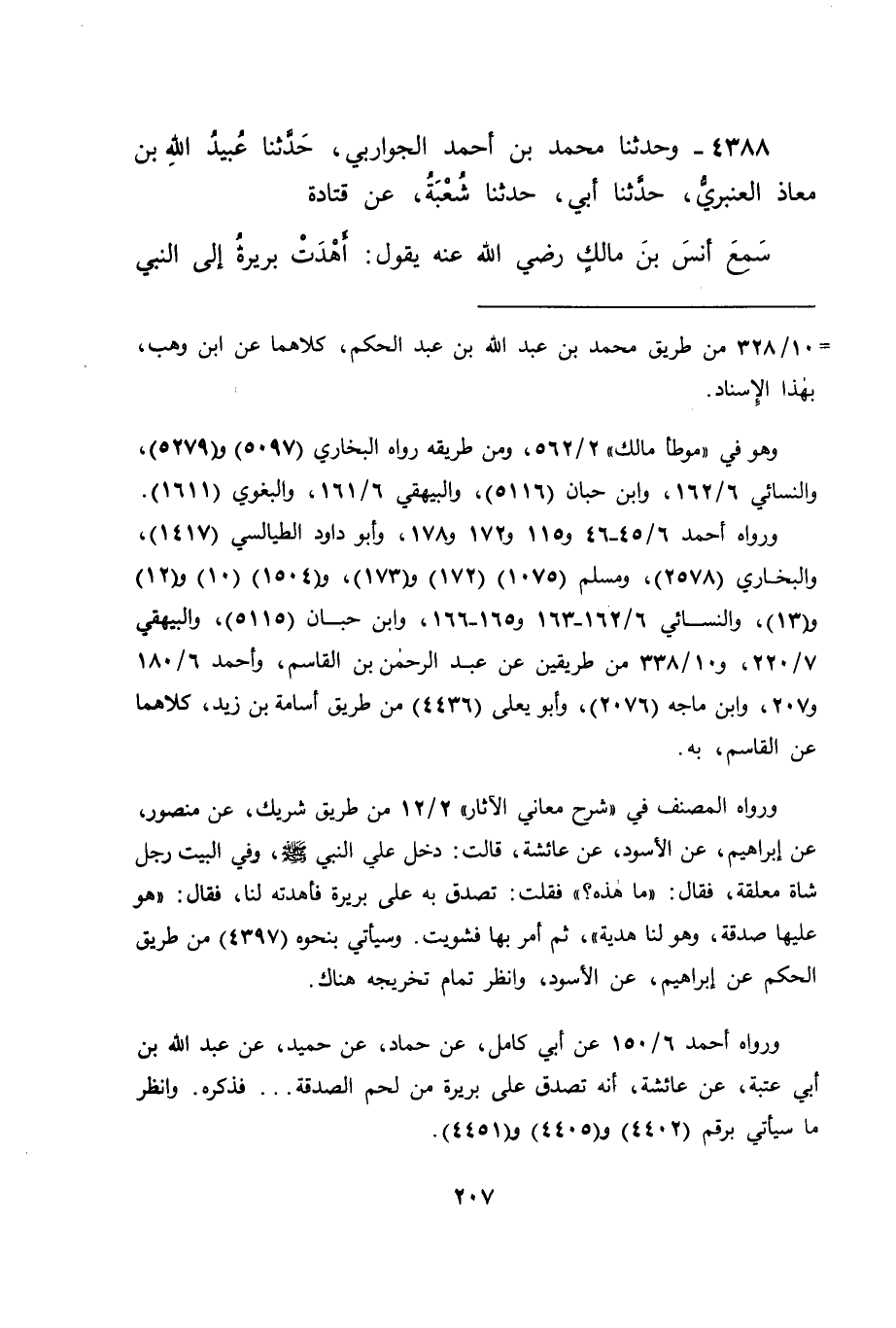 4388 - وَحَدَّثَنَا مُحَمَّدُ بْنُ أَحْمَدَ الْجَوَارِبِيُّ، حَدَّثَنَا عُبَيْدُ اللهِ بْنُ مُعَاذٍ الْعَنْبَرِيُّ، حَدَّثَنَا أَبِي، حَدَّثَنَا شُعْبَةُ، عَنْ قَتَادَةَ، سَمِعَ أَنَسَ بْنَ مَالِكٍ، رَضِيَ اللهُ عَنْهُ يَقُولُ: أَهْدَتْ بَرِيرَةُ إِلَى النَّبِيِّ صَلَّى اللَّهُ عَلَيْهِ وَسَلَّمَ -[208]- لَحْمًا تُصُدِّقَ بِهِ عَلَيْهَا، فَقَالَ رَسُولُ اللهِ صَلَّى اللَّهُ عَلَيْهِ وَسَلَّمَ: " هُوَ لَنَا هَدِيَّةٌ، وَعَلَيْهَا صَدَقَةٌ " قَالَ أَبُو جَعْفَرٍ: وَفِي هَذَا الْبَابِ أَحَادِيثُ سِوَى هَذِهِ قَدْ أَتَيْنَا بِبَعْضِهَا فِيمَا تَقَدَّمَ مِنَّا فِي هَذِهِ الْأَبْوَابِ، وَمِمَّا سَنَأْتِي بِهَا فِي بَقِيَّةِ هَذِهِ الْأَبْوَابِ، وَهَذَا عِنْدَنَا وَاللهُ أَعْلَمُ لِأَنَّ تِلْكَ الصَّدَقَةَ خَرَجَتْ مِنْ مِلْكِ مَنْ تَصَدَّقَ بِهَا عَلَى بَرِيرَةَ إِلَى مِلْكِ بَرِيرَةَ إِيَّاهَا، وَخَرَجَتْ بَعْدَ ذَلِكَ مِنْ مِلْكِهَا إِيَّاهَا إِلَى مِلْكِ مَنْ أَهْدَتْهَا إِلَيْهِ مِمَّنْ تَحْرُمُ عَلَيْهِ الصَّدَقَةُ إِمَّا لِنَسَبِهِ، وَإِمَّا لِمَا سِوَى ذَلِكَ مِنْ يَسَارِهِ، وَكَانَتْ لَهُ حَلَالًا إِذْ كَانَ إِنَّمَا مَلَكَهَا بِالْهَدِيَّةِ لَا بِالصَّدَقَةِ، وَقَدِ اسْتَدَلَّ قَوْمٌ بِهَذَا عَلَى إِبَاحَةِ الْهَاشِمِيِّ الْعَمَلَ عَلَى الصَّدَقَةِ، وَالِاجْتِعَالَ مِنْهَا، وَإِنْ كَانَتِ الصَّدَقَةُ عَلَيْهِ حَرَامًا؛ لِأَنَّهُ يَأْخُذُ مَا يَأْخُذُ بِعَمَلِهِ عَلَيْهَا لَا بِصَدَقَةِ أَهْلِهَا بِهِ عَلَيْهِ، وَمِمَّنْ قَالَ ذَلِكَ مِنْهُمْ أَبُو يُوسُفَ، وَكَرِهَ ذَلِكَ آخَرُونَ؛ لِأَنَّ الصَّدَقَةَ إِنَّمَا تَخْرُجُ مِنْ مِلْكِ رَبِّهَا إِلَى مُسْتَحِقِّيهَا، وَفِيهِمُ الْعَامِلُونَ عَلَيْهَا، فَإِذَا كَانَتْ لَا تَحِلُّ لَهُمْ لَمْ يَحِلُّ لَهُمْ أَنْ يَأْخُذُوهَا جُعْلًا عَلَى عَمَلِهِمْ عَلَيْهَا؛ لِأَنَّهُمْ يَأْخُذُونَ مَا هُوَ حَرَامٌ عَلَيْهِمْ، -[209]- فَقَالَ قَائِلٌ: فَقَدْ رَأَيْنَا الْغَنِيَّ جَائِزًا لَهُ أَنْ يَعْمَلَ عَلَيْهَا، وَأَنْ يَأْخُذَ عُمَالَتَهُ مِنْهَا، وَلَمْ تُحَرَّمْ عَلَيْهِ بِخُرُوجِهَا مِنْ مِلْكِ الْمُتَصَدِّقِ بِهَا إِلَى مِلْكِهِ، قَالَ: فَمِثْلُ ذَلِكَ ذُو النَّسَبِ الَّذِي تَحْرُمُ عَلَيْهِ الصَّدَقَةُ بِنَسَبِهِ فِي عَمَلِهِ عَلَى الصَّدَقَةِ، وَفِي أَخْذِهِ مَا يَأْخُذُهُ مِنْهَا بِعُمَالَتِهِ عَلَيْهَا، كَذَلِكَ أَيْضًا لَا تَحْرُمُ عَلَيْهِ، وَإِنْ كَانَ إِنَّمَا يَخْرُجُ مِنْ مِلْكِ الْمُتَصَدِّقِ بِهَا إِلَى مِلْكِهِ، فَكَانَ جَوَابَنَا لَهُ فِي ذَلِكَ: أَنَّا لَوْ خُلِّينَا وَالْقِيَاسَ، لَكَانَ هُوَ مَا قَدْ ذُكِرَ، وَلَكِنَّ رَسُولَ اللهِ صَلَّى اللَّهُ عَلَيْهِ وَسَلَّمَ كَانَ مِنْهُ فِي ذَلِكَ مَا قَدْ دَلَّ عَلَى خِلَافِ هَذَا الْمَعْنَى
