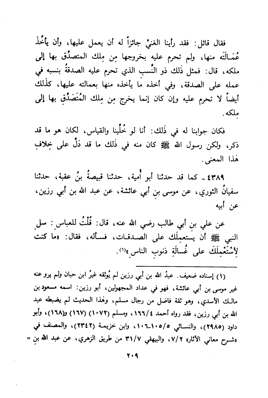 4389 - كَمَا قَدْ حَدَّثَنَا أَبُو أُمَيَّةَ، حَدَّثَنَا قَبِيصَةُ بْنُ عُقْبَةَ، حَدَّثَنَا سُفْيَانُ الثَّوْرِيُّ، عَنْ مُوسَى بْنِ أَبِي عَائِشَةَ، عَنْ عَبْدِ اللهِ بْنِ أَبِي رَزِينٍ، عَنْ أَبِيهِ، عَنْ عَلِيِّ بْنِ أَبِي طَالِبٍ رَضِيَ اللهُ عَنْهُ، قَالَ: قُلْتُ لِلْعَبَّاسِ: سَلِ النَّبِيَّ صَلَّى اللَّهُ عَلَيْهِ وَسَلَّمَ أَنْ يَسْتَعْمِلَكَ عَلَى الصَّدَقَاتِ، فَسَأَلَهُ، فَقَالَ: " مَا كُنْتُ لِأَسْتَعْمِلَكَ عَلَى غُسَالَةِ ذُنُوبِ النَّاسِ " -[210]- فَعَقَلْنَا بِذَلِكَ أَنَّ رَسُولَ اللهِ صَلَّى اللَّهُ عَلَيْهِ وَسَلَّمَ إِنَّمَا كَرِهَ لِلْعَبَّاسِ اسْتِعْمَالَهُ عَلَى الصَّدَقَةِ لِرِفْعَتِهِ إِيَّاهُ أَنْ يَكُونَ عَامِلًا عَلَى غُسَالَةِ ذُنُوبِ النَّاسِ، لَا لِمَا سِوَى ذَلِكَ مِنْ حِلِّهَا لَهُ لَوْ عَمِلَ عَلَيْهَا، وَمِثْلُ ذَلِكَ مَا قَدْ رُوِيَ عَنْهُ فِي أَبِي رَافِعٍ لِلْوَلَاءِ الَّذِي لَهُ فِي بَنِي هَاشِمٍ