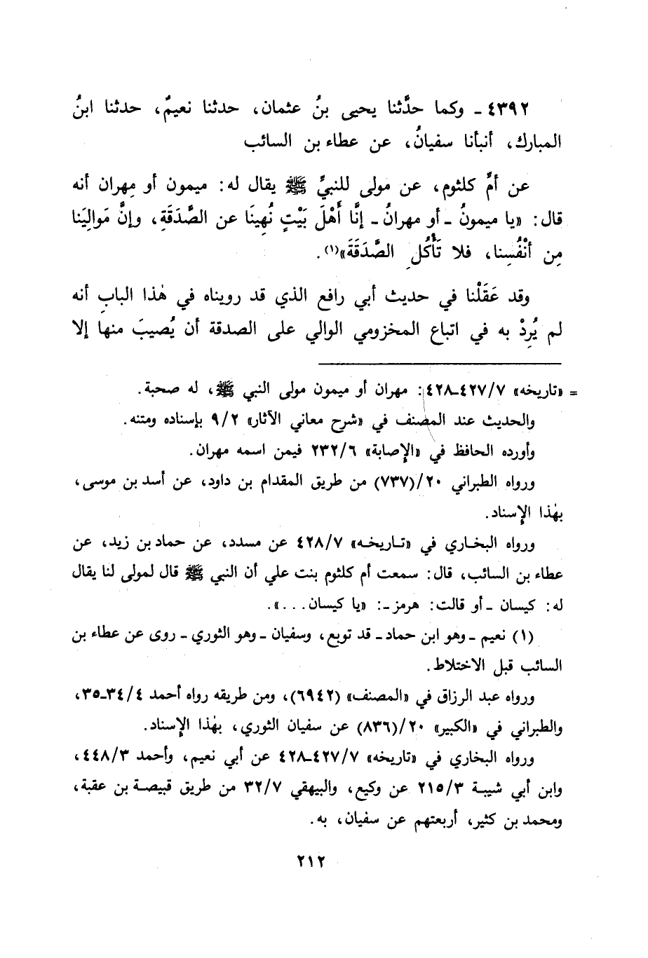 4392 - وَكَمَا حَدَّثَنَا يَحْيَى بْنُ عُثْمَانَ، حَدَّثَنَا نُعَيْمٌ، حَدَّثَنَا ابْنُ الْمُبَارَكِ، أَنْبَأَنَا سُفْيَانُ، عَنْ عَطَاءِ بْنِ السَّائِبِ، عَنْ أُمِّ كُلْثُومٍ، عَنْ مَوْلًى لِلنَّبِيِّ صَلَّى اللَّهُ عَلَيْهِ وَسَلَّمَ يُقَالُ لَهُ: مَيْمُونٌ أَوْ مِهْرَانُ أَنَّهُ قَالَ: " يَا مَيْمُونُ أَوْ مِهْرَانُ، إِنَّا أَهْلَ بَيْتٍ نُهِينَا عَنِ الصَّدَقَةِ، وَإِنَّ مَوَالِيَنَا مِنْ أَنْفُسِنَا، فَلَا تَأْكُلِ الصَّدَقَةَ " وَقَدْ عَقَلْنَا فِي حَدِيثِ أَبِي رَافِعٍ الَّذِي قَدْ رُوِّينَاهُ فِي هَذَا الْبَابِ أَنَّهُ لَمْ يُرِدْ بِهِ فِي اتِّبَاعِ الْمَخْزُومِيِّ الْوَالِيَ عَلَى الصَّدَقَةِ أَنْ يُصِيبَ مِنْهَا إِلَّا -[213]- مَا يَكُونُ عُمَالَةً لَهُ، لَا لِمَا سِوَى ذَلِكَ مِنْهَا، فَقَالَ لَهُ رَسُولُ اللهِ صَلَّى اللَّهُ عَلَيْهِ وَسَلَّمَ فِي ذَلِكَ مَا قَالَ لَهُ فِيهِ، وَكَانَ ذَلِكَ عِنْدَنَا وَاللهُ أَعْلَمُ، كَمَا قَالَ مِثْلَهُ لِلْعَبَّاسِ لَمَّا سَأَلَهُ أَنْ يَسْتَعْمِلَهُ عَلَى الصَّدَقَةِ الَّتِي هِيَ غُسَالَةُ ذُنُوبِ النَّاسِ، لَا عَلَى أَنَّهُمْ لَوْ عَمِلُوا عَلَيْهَا لَمْ يَحْرُمْ عَلَيْهِمْ مَا يَأْخُذُونَهُ مِنْهَا بِعَمَالَتِهِمْ عَلَيْهَا، كَمَا لَا يَحْرُمُ ذَلِكَ عَلَى الْغَنِيِّ إِذَا عَمِلَ عَلَيْهَا بِالْغِنَى الَّذِي يَحْرُمُ بِهِ عَلَيْهِ مِثْلُهَا، فَهَذَا وَجْهُ الْآثَارِ، وَاللهُ أَعْلَمُ بِمُرَادِ رَسُولِ اللهِ صَلَّى اللَّهُ عَلَيْهِ وَسَلَّمَ، وَاللهَ نَسْأَلُهُ التَّوْفِيقَ.