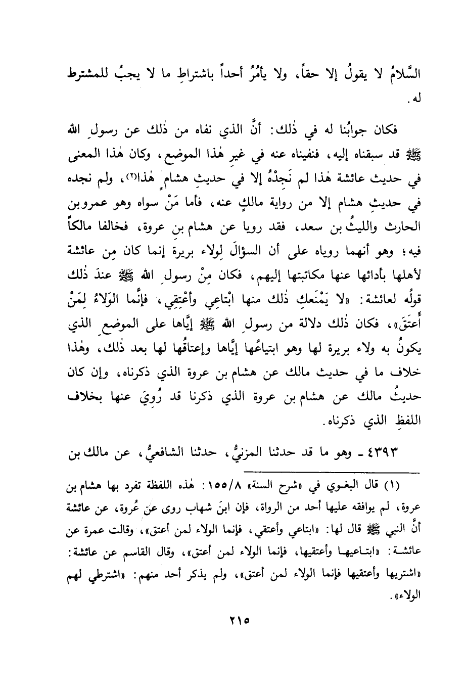 السَّلَامُ لَا يَقُولُ إِلَّا حَقًّا، وَلَا يَأْمُرُ أَحَدًا بِاشْتِرَاطِ مَا لَا يَجِبُ لِلْمُشْتَرِطِ لَهُ. فَكَانَ جَوَابَنَا لَهُ فِي ذَلِكَ: أَنَّ الَّذِيَ نَفَاهُ مِنْ ذَلِكَ عَنْ رَسُولِ اللهِ صَلَّى اللَّهُ عَلَيْهِ وَسَلَّمَ قَدْ سَبَقْنَاهُ إِلَيْهِ، فَنَفَيْنَاهُ عَنْهُ فِي غَيْرِ هَذَا الْمَوْضِعِ، وَكَانَ هَذَا الْمَعْنَى فِي حَدِيثِ عَائِشَةَ هَذَا لَمْ نَجِدْهُ إِلَّا فِي حَدِيثِ هِشَامٍ هَذَا، وَلَمْ نَجِدْهُ فِي حَدِيثِ هِشَامٍ إِلَّا مِنْ رِوَايَةِ مَالِكٍ عَنْهُ، فَأَمَّا مَنْ سِوَاهُ وَهُوَ عَمْرُو بْنُ الْحَارِثِ وَاللَّيْثُ بْنُ سَعْدٍ، فَقَدْ رَوَيَا عَنْ هِشَامِ بْنِ عُرْوَةَ، فَخَالَفَا مَالِكًا فِيهِ، وَهُوَ أَنَّهُمَا رَوَيَاهُ عَلَى أَنَّ السُّؤَالَ لِوَلَاءِ بَرِيرَةَ إِنَّمَا كَانَ مِنْ عَائِشَةَ لِأَهْلِهَا بِأَدَائِهَا عَنْهَا مُكَاتَبَتَهَا إِلَيْهِمْ، فَكَانَ مِنْ رَسُولِ اللهِ صَلَّى اللَّهُ عَلَيْهِ وَسَلَّمَ عِنْدَ ذَلِكَ قَوْلُهُ لِعَائِشَةَ: " لَا يَمْنَعْكِ ذَلِكَ مِنْهَا ابْتَاعِي وَأَعْتِقِي، فَإِنَّمَا الْوَلَاءُ لِمَنْ أَعْتَقَ "، فَكَانَ ذَلِكَ دَلَالَةً مِنْ رَسُولِ اللهِ صَلَّى اللَّهُ عَلَيْهِ وَسَلَّمَ إِيَّاهَا عَلَى الْمَوْضِعِ الَّذِي يَكُونُ بِهِ وَلَاءُ بَرِيرَةَ لَهَا وَهُوَ ابْتِيَاعُهَا إِيَّاهَا وَإِعْتَاقُهَا لَهَا بَعْدَ ذَلِكَ، وَهَذَا خِلَافُ مَا فِي حَدِيثِ مَالِكٍ عَنْ هِشَامِ بْنِ عُرْوَةَ الَّذِي ذَكَرْنَاهُ، وَإِنْ كَانَ حَدِيثُ مَالِكٍ، عَنْ هِشَامِ بْنِ عُرْوَةَ الَّذِي ذَكَرْنَا قَدْ رُوِيَ عَنْهَا بِخِلَافِ اللَّفْظِ الَّذِي ذَكَرْنَاهُ.