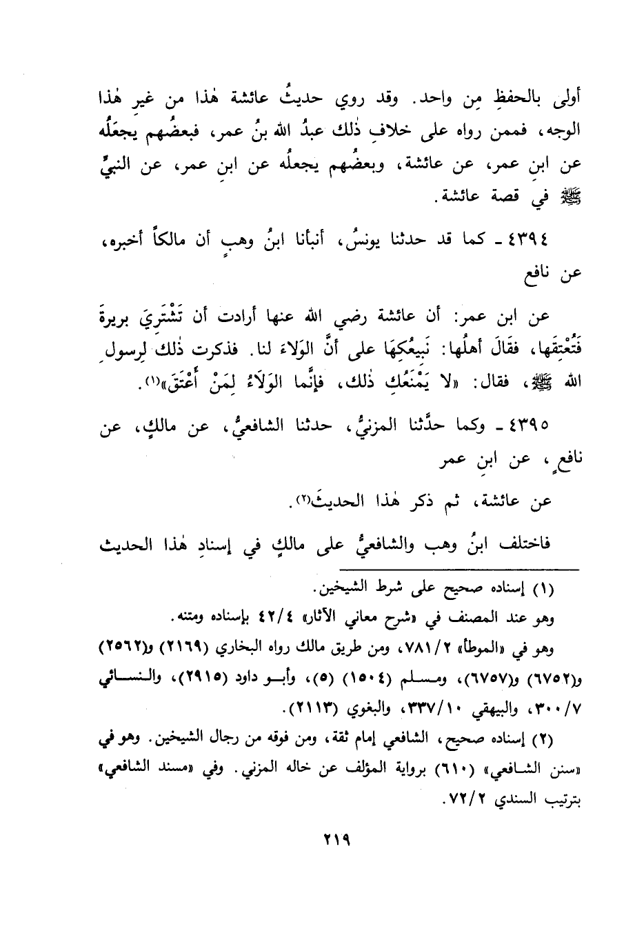 4394 - كَمَا قَدْ حَدَّثَنَا يُونُسُ، أَنْبَأَنَا ابْنُ وَهْبٍ، أَنَّ مَالِكًا، أَخْبَرَهُ، عَنْ نَافِعٍ، عَنِ ابْنِ عُمَرَ: أَنَّ عَائِشَةَ، رَضِيَ اللهُ عَنْهَا، أَرَادَتْ أَنْ تَشْتَرِيَ بَرِيرَةَ فَتُعْتِقَهَا، فَقَالَ أَهْلُهَا: نَبِيعُكِهَا عَلَى أَنَّ الْوَلَاءَ لَنَا، فَذَكَرَتْ ذَلِكَ لِرَسُولِ اللهِ صَلَّى اللَّهُ عَلَيْهِ وَسَلَّمَ، فَقَالَ: " لَا يَمْنَعُكِ ذَلِكَ، فَإِنَّمَا الْوَلَاءُ لِمَنْ أَعْتَقَ "