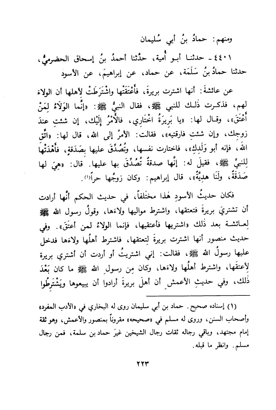 4401 - حَدَّثَنَا أَبُو أُمَيَّةَ، حَدَّثَنَا أَحْمَدُ بْنُ إِسْحَاقَ الْحَضْرَمِيُّ، حَدَّثَنَا حَمَّادُ بْنُ سَلَمَةَ، عَنْ حَمَّادٍ، عَنْ إِبْرَاهِيمَ، عَنِ الْأَسْوَدِ، عَنْ عَائِشَةَ: أَنَّهَا اشْتَرَتْ بَرِيرَةَ، فَأَعْتَقَتْهَا وَاشْتَرَطَتْ لِأَهْلِهَا أَنَّ الْوَلَاءَ لَهُمْ، فَذَكَرَتْ ذَلِكَ لِلنَّبِيِّ صَلَّى اللَّهُ عَلَيْهِ وَسَلَّمَ، فَقَالَ النَّبِيُّ صَلَّى اللَّهُ عَلَيْهِ وَسَلَّمَ: " إِنَّمَا الْوَلَاءُ لِمَنْ أَعْتَقَ " وَقَالَ لَهَا: " يَا بَرِيرَةُ، اخْتَارِي، فَالْأَمْرُ إِلَيْكِ، إِنْ شِئْتِ عِنْدَ زَوْجِكِ، وَإِنْ شِئْتِ فَارَقْتِيهِ " فَقَالَتِ: الْأَمْرُ إِلَى اللهِ، قَالَ لَهَا: " اتَّقِ اللهَ، فَإِنَّهُ أَبُو وَلَدِكِ " فَاخْتَارَتْ نَفْسَهَا. وَتُصُدِّقَ عَلَيْهَا بِصَدَقَةٍ، فَأَهْدَتْهَا لِلنَّبِيِّ صَلَّى اللَّهُ عَلَيْهِ وَسَلَّمَ، فَقِيلَ لَهُ: إِنَّهَا صَدَقَةٌ تُصُدِّقَ بِهَا عَلَيْهَا، قَالَ: " هِيَ لَهَا صَدَقَةٌ، وَلَنَا هَدِيَّةٌ ". قَالَ إِبْرَاهِيمُ: وَكَانَ زَوْجُهَا حُرًّا. فَكَانَ حَدِيثُ الْأَسْوَدِ هَذَا مُخْتَلِفًا، فِي حَدِيثِ الْحَكَمِ أَنَّهَا أَرَادَتْ أَنْ تَشْتَرِيَ بَرِيرَةَ فَتُعْتِقَهَا، وَاشْتَرَطَ مَوَالِيهَا وَلَاءَهَا، قَوْلُ رَسُولِ اللهِ صَلَّى اللَّهُ عَلَيْهِ وَسَلَّمَ لِعَائِشَةَ بَعْدَ ذَلِكَ: " اشْتَرِيهَا فَأَعْتِقِيهَا، فَإِنَّمَا الْوَلَاءُ لِمَنْ أَعْتَقَ "، وَفِي حَدِيثِ مَنْصُورٍ أَنَّهَا اشْتَرَتْ بَرِيرَةَ لِتُعْتِقَهَا، فَاشْتَرَطَ أَهْلُهَا وَلَاءَهَا فَدَخَلَ عَلَيْهَا رَسُولُ اللهِ صَلَّى اللَّهُ عَلَيْهِ وَسَلَّمَ، فَقَالَتْ: " إِنِّي اشْتَرَيْتُ أَوْ أَرَدْتُ أَنْ أَشْتَرِيَ بَرِيرَةَ لِأُعْتِقَهَا، وَاشْتَرَطَ أَهْلُهَا وَلَاءَهَا " وَكَانَ مِنْ رَسُولِ اللهِ صَلَّى اللَّهُ عَلَيْهِ وَسَلَّمَ مَا كَانَ بَعْدَ ذَلِكَ. وَفِي حَدِيثِ الْأَعْمَشِ أَنَّ أَهْلَ بَرِيرَةَ أَرَادُوا أَنْ يَبِيعُوهَا وَيَشْتَرِطُوا -[224]- الْوَلَاءَ، وَأَنَّ رَسُولَ اللهِ صَلَّى اللَّهُ عَلَيْهِ وَسَلَّمَ قَالَ لِعَائِشَةَ بَعْدَ ذَلِكَ: " اشْتَرِيهَا وَأَعْتِقِيهَا، فَإِنَّمَا الْوَلَاءُ لِمَنْ أَعْتَقَ ". وَفِي حَدِيثِ حَمَّادٍ: أَنَّهَا اشْتَرَتْ بَرِيرَةَ وَأَعْتَقَتْهَا، وَاشْتَرَطَتْ لِأَهْلِهَا الْوَلَاءَ، وَأَنَّ الَّذِي كَانَ مِنْ رَسُولِ اللهِ صَلَّى اللَّهُ عَلَيْهِ وَسَلَّمَ مِنْ قَوْلِهِ: " إِنَّ الْوَلَاءَ لِمَنْ أَعْتَقَ " كَانَ بَعْدَ ذَلِكَ كُلِّهِ، وَهَذَا اخْتِلَافٌ شَدِيدٌ غَيْرَ أَنَّهُ لَا شَيْءَ فِيهِ مِنْ إِطْلَاقِ رَسُولِ اللهِ صَلَّى اللَّهُ عَلَيْهِ وَسَلَّمَ لِأَهْلِ بَرِيرَةَ مَا كَانَ مِنْهُمْ مِنَ اشْتِرَاطِ الْوَلَاءِ، وَلَا إِطْلَاقِهِ لِعَائِشَةَ ذَلِكَ لَهُمْ. وَمِمَّنْ رَوَاهُ عَنْهَا أَيْضًا: الْقَاسِمُ بْنُ مُحَمَّدٍ.