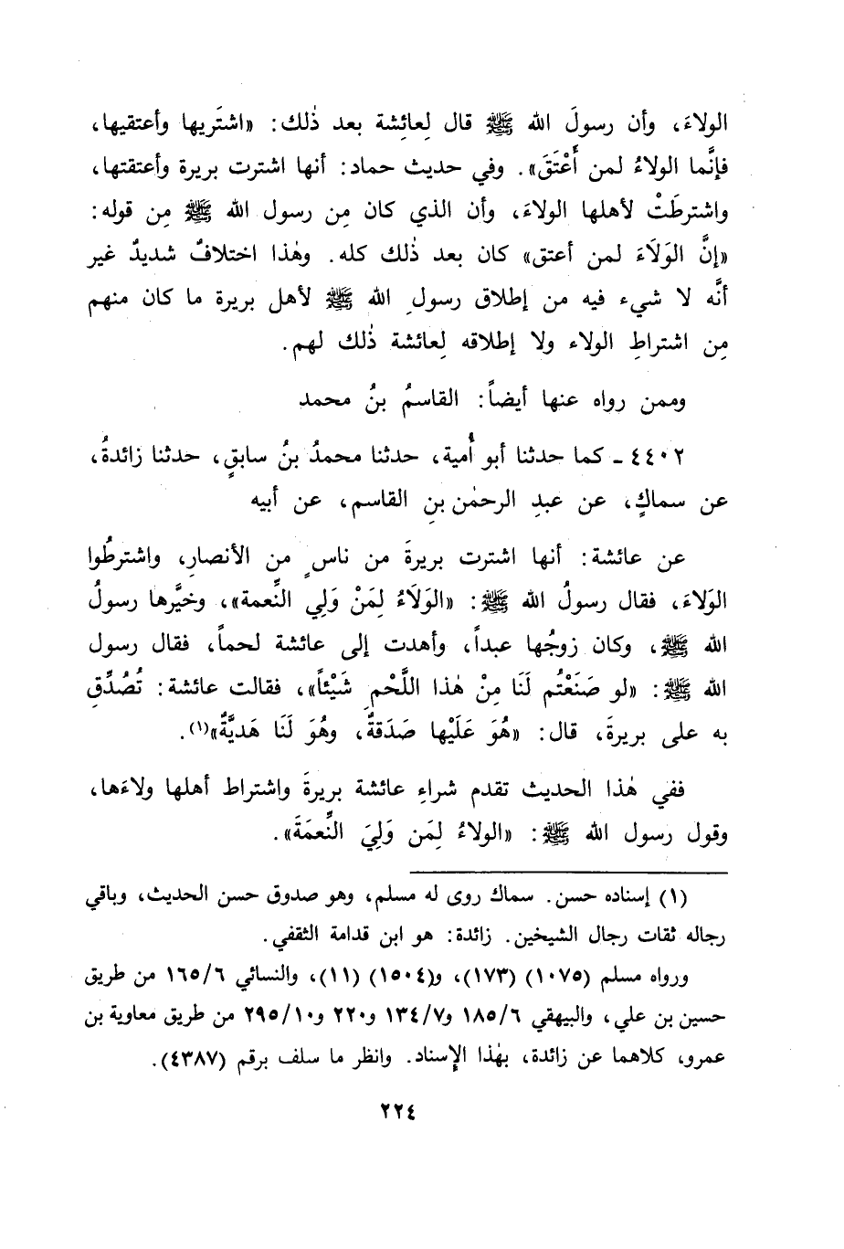 4402 - كَمَا حَدَّثَنَا أَبُو أُمَيَّةَ، حَدَّثَنَا مُحَمَّدُ بْنُ سَابِقٍ، حَدَّثَنَا زَائِدَةُ، عَنْ سِمَاكٍ، عَنْ عَبْدِ الرَّحْمَنِ بْنِ الْقَاسِمِ، عَنْ أَبِيهِ، عَنْ عَائِشَةَ: أَنَّهَا اشْتَرَتْ بَرِيرَةَ مِنْ نَاسٍ مِنَ الْأَنْصَارِ، وَاشْتَرَطُوا الْوَلَاءَ، فَقَالَ رَسُولُ اللهِ صَلَّى اللَّهُ عَلَيْهِ وَسَلَّمَ: " الْوَلَاءُ لِمَنْ وَلِيَ النِّعْمَةَ " وَخَيَّرَهَا رَسُولُ اللهِ صَلَّى اللَّهُ عَلَيْهِ وَسَلَّمَ، وَكَانَ زَوْجُهَا عَبْدًا، وَأَهْدَتْ إِلَى عَائِشَةَ لَحْمًا، فَقَالَ رَسُولُ اللهِ صَلَّى اللَّهُ عَلَيْهِ وَسَلَّمَ: " لَوْ صَنَعْتُمْ لَنَا مِنْ هَذَا اللَّحْمِ شَيْئًا " فَقَالَتْ عَائِشَةُ: تُصُدِّقَ بِهِ عَلَى بَرِيرَةَ، قَالَ: " هُوَ عَلَيْهَا صَدَقَةٌ، وَهُوَ لَنَا هَدِيَّةٌ " فَفِي هَذَا الْحَدِيثِ تَقَدَّمَ شِرَاءُ عَائِشَةَ بَرِيرَةَ وَاشْتِرَاطُ أَهْلِهَا وَلَاءَهَا، وَقَوْلُ رَسُولِ اللهِ صَلَّى اللَّهُ عَلَيْهِ وَسَلَّمَ: " الْوَلَاءُ لِمَنْ وَلِيَ النِّعْمَةَ ". -[225]- وَمِنْهُمْ: عَمْرَةُ بِنْتُ عَبْدِ الرَّحْمَنِ، فَرَوَتْهُ عَنْ عَائِشَةَ رَضِيَ اللهُ عَنْهَا.