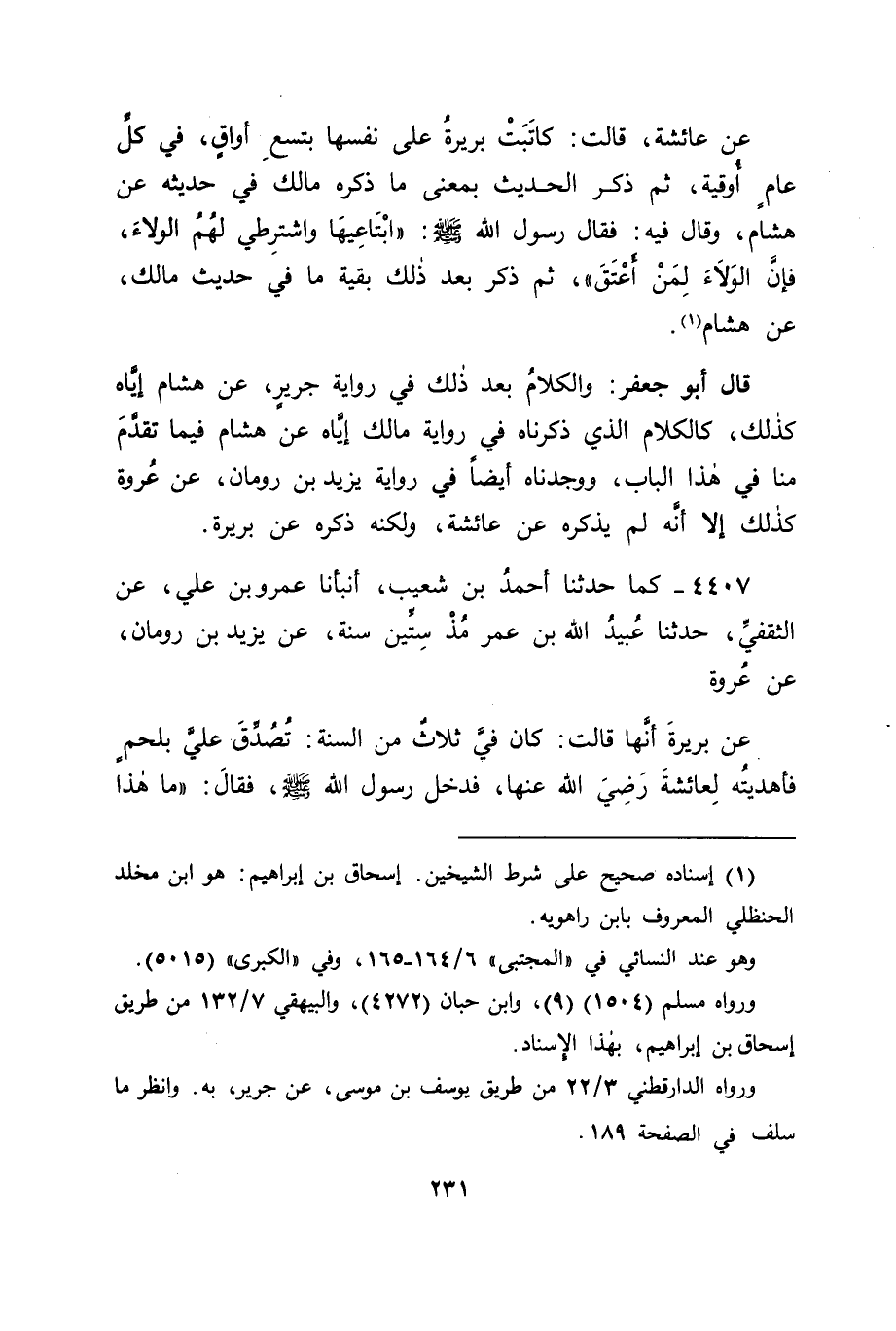 4407 - كَمَا حَدَّثَنَا أَحْمَدُ بْنُ شُعَيْبٍ، أَنْبَأَنَا عَمْرُو بْنُ عَلِيٍّ، عَنِ الثَّقَفِيِّ، حَدَّثَنَا عُبَيْدُ اللهِ بْنُ عُمَرَ مُذْ سِتِّينَ سَنَةً، عَنْ يَزِيدَ بْنِ رُومَانَ، عَنْ عُرْوَةَ، عَنْ بَرِيرَةَ أَنَّهَا قَالَتْ: كَانَ فِيَّ ثَلَاثٌ مِنَ السُّنَّةِ: تُصُدِّقَ عَلَيَّ بِلَحْمٍ فَأَهْدَيْتُهُ لِعَائِشَةَ رَضِيَ اللهُ عَنْهَا، فَدَخَلَ رَسُولُ اللهِ صَلَّى اللَّهُ عَلَيْهِ وَسَلَّمَ، فَقَالَ: " مَا هَذَا -[232]- اللَّحْمُ؟ " فَقَالَتْ: لَحْمٌ تُصُدِّقَ بِهِ عَلَى بَرِيرَةَ، فَأَهْدَتْهُ لَنَا، فَقَالَ: " هُوَ عَلَى بَرِيرَةَ صَدَقَةٌ، وَهُوَ لَنَا هَدِيَّةٌ " وَكَاتَبْتُ عَلَى تِسْعِ أَوَاقٍ، فَقَالَتْ عَائِشَةُ: إِنْ شَاءَ مَوَالِيكِ عَدَدْتُ ثَمَنَكِ عَدَّةً وَاحِدَةً، فَقَالَتْ: إِنَّهُمْ يَقُولُونَ: إِلَّا أَنْ تَشْتَرِطِي لَهُمُ الْوَلَاءَ، فَذَكَرَتْ ذَلِكَ لِلنَّبِيِّ صَلَّى اللَّهُ عَلَيْهِ وَسَلَّمَ، فَقَالَ: " اشْتَرِيهَا وَاشْتَرِطِي لَهُمْ، فَإِنَّمَا الْوَلَاءُ لِمَنْ أَعْتَقَ " قَالَتْ: وَأَعْتَقَتْنِي فَكَانَ لِيَ الْخِيَارُ قَالَ أَبُو جَعْفَرٍ: فَالْكَلَامُ فِي هَذَا كَالْكَلَامِ فِيمَا ذَكَرْنَا فِي حَدِيثِ هِشَامٍ فِي ذَلِكَ الْمَعْنَى فِي هَذَا الْبَابِ، وَبِاللهِ التَّوْفِيقُ.