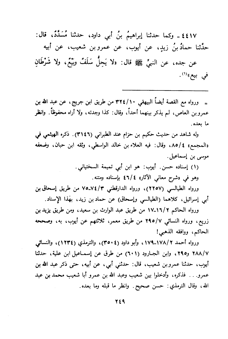 4417 - وَكَمَا حَدَّثَنَا إِبْرَاهِيمُ بْنُ أَبِي دَاوُدَ، حَدَّثَنَا مُسَدَّدٌ، قَالَ: حَدَّثَنَا حَمَّادُ بْنُ زَيْدٍ، عَنْ أَيُّوبَ، عَنْ عَمْرِو بْنِ شُعَيْبٍ، عَنْ أَبِيهِ، عَنْ جَدِّهِ: عَنِ النَّبِيِّ صَلَّى اللَّهُ عَلَيْهِ وَسَلَّمَ قَالَ: " لَا يَحِلُّ سَلَفٌ وَبَيْعٌ، وَلَا شَرْطَانِ فِي بَيْعٍ " -[250]-