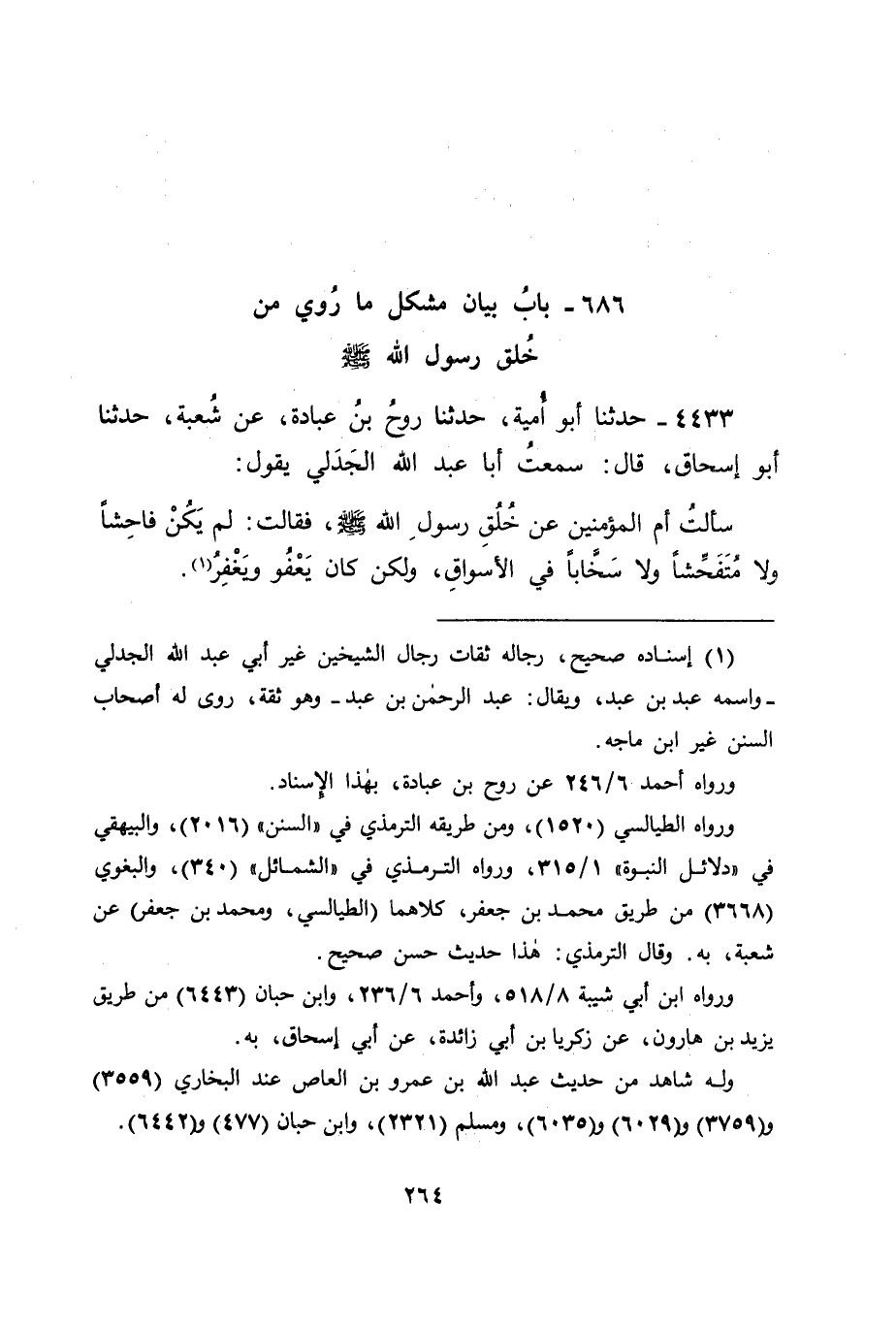 4433 - حَدَّثَنَا أَبُو أُمَيَّةَ، حَدَّثَنَا رَوْحُ بْنُ عُبَادَةَ، عَنْ شُعْبَةَ، حَدَّثَنَا أَبُو إِسْحَاقَ، قَالَ: سَمِعْتُ أَبَا عَبْدِ اللهِ الْجَدَلِيَّ، يَقُولُ: سَأَلْتُ أُمَّ الْمُؤْمِنِينَ عَنْ خُلُقِ رَسُولِ اللهِ صَلَّى اللَّهُ عَلَيْهِ وَسَلَّمَ، فَقَالَتْ: " لَمْ يَكُنْ فَاحِشًا، وَلَا مُتَفَحِّشًا، وَلَا سَخَّابًا فِي الْأَسْوَاقِ، وَلَكِنْ كَانَ يَعْفُو وَيَغْفِرُ " -[265]- قَالَ أَبُو جَعْفَرٍ: وَهَذِهِ أَحْسَنُ الصِّفَاتِ مِنَ الْأَخْلَاقِ الَّتِي هِيَ السَّجِيَّةُ الَّتِي يَكُونُ عَلَيْهَا مِنْ تُحْمَدُ سَجِيَّتُهُ.