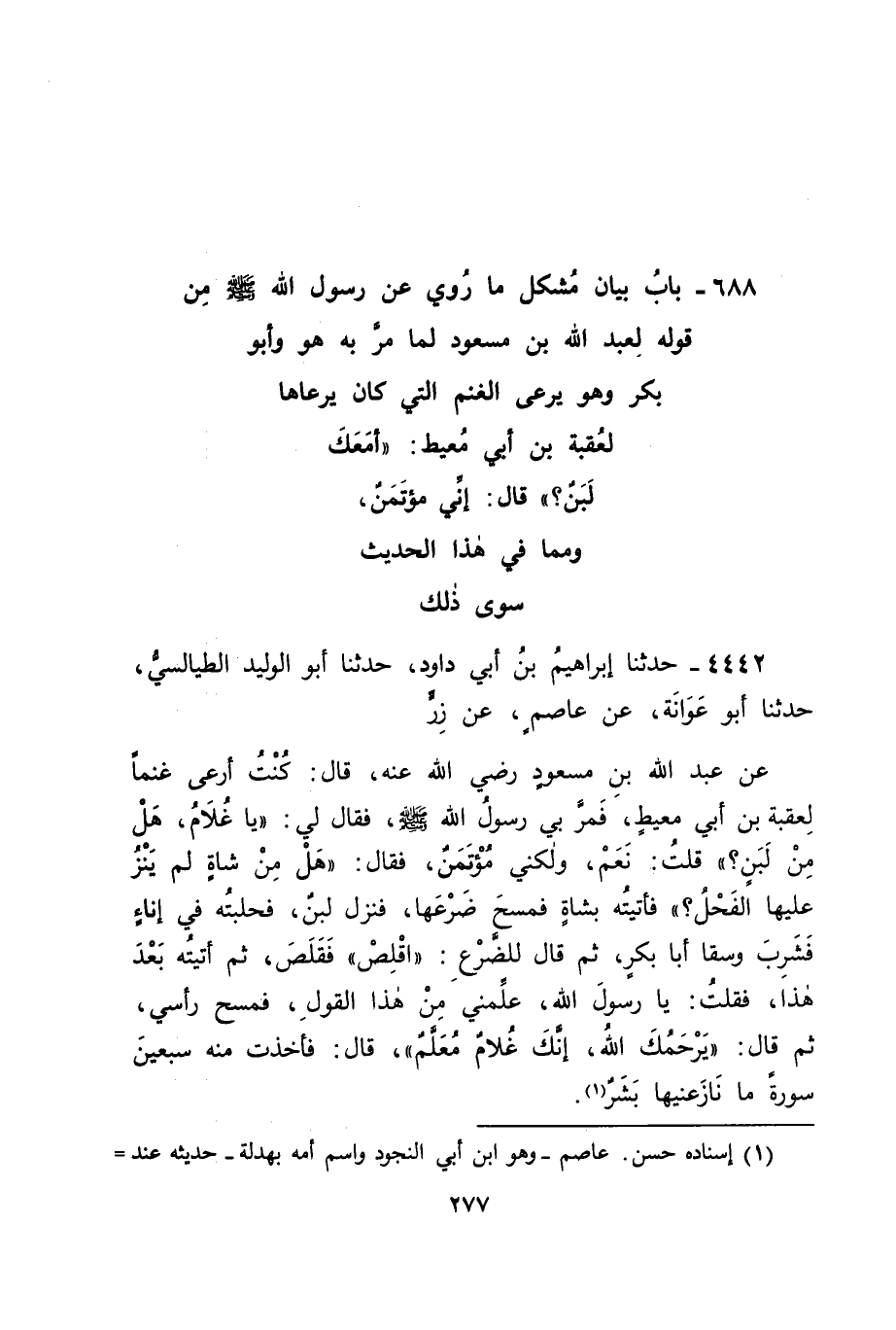 4442 - حَدَّثَنَا إِبْرَاهِيمُ بْنُ أَبِي دَاوُدَ، حَدَّثَنَا أَبُو الْوَلِيدِ الطَّيَالِسِيُّ، حَدَّثَنَا أَبُو عَوَانَةَ، عَنْ عَاصِمٍ، عَنْ زِرٍّ، عَنْ عَبْدِ اللهِ بْنِ مَسْعُودٍ، رَضِيَ اللهُ عَنْهُ، قَالَ: كُنْتُ أَرْعَى غَنَمًا لِعُقْبَةَ بْنِ أَبِي مُعَيْطٍ، فَمَرَّ بِي رَسُولُ اللهِ صَلَّى اللَّهُ عَلَيْهِ وَسَلَّمَ، فَقَالَ لِي: " يَا غُلَامُ، هَلْ مِنْ لَبَنٍ؟ " قُلْتُ: نَعَمْ، وَلَكِنِّي مُؤْتَمَنٌ، فَقَالَ: " هَلْ مِنْ شَاةٍ لَمْ يَنْزُ عَلَيْهَا الْفَحْلُ؟ " فَأَتَيْتُهُ بِشَاةٍ فَمَسَحَ ضَرْعَهَا، فَنَزَلَ لَبَنٌ، فَحَلَبْتُهُ فِي إِنَاءٍ، فَشَرِبَ وَسَقَى أَبَا بَكْرٍ، ثُمَّ قَالَ لِلضَّرْعِ: " اقْلِصْ " فَقَلَصَ، ثُمَّ أَتَيْتُهُ بَعْدَ هَذَا، فَقُلْتُ: يَا رَسُولَ اللهِ، عَلِّمْنِي مِنْ هَذَا الْقَوْلِ، فَمَسَحَ رَأْسِي، ثُمَّ قَالَ: " يَرْحَمُكَ اللهُ، إِنَّكَ غُلَامٌ مُعَلَّمٌ " قَالَ: فَأَخَذْتُ مِنْهُ سَبْعِينَ سُورَةً مَا نَازَعَنِيهَا بَشَرٌ -[278]-