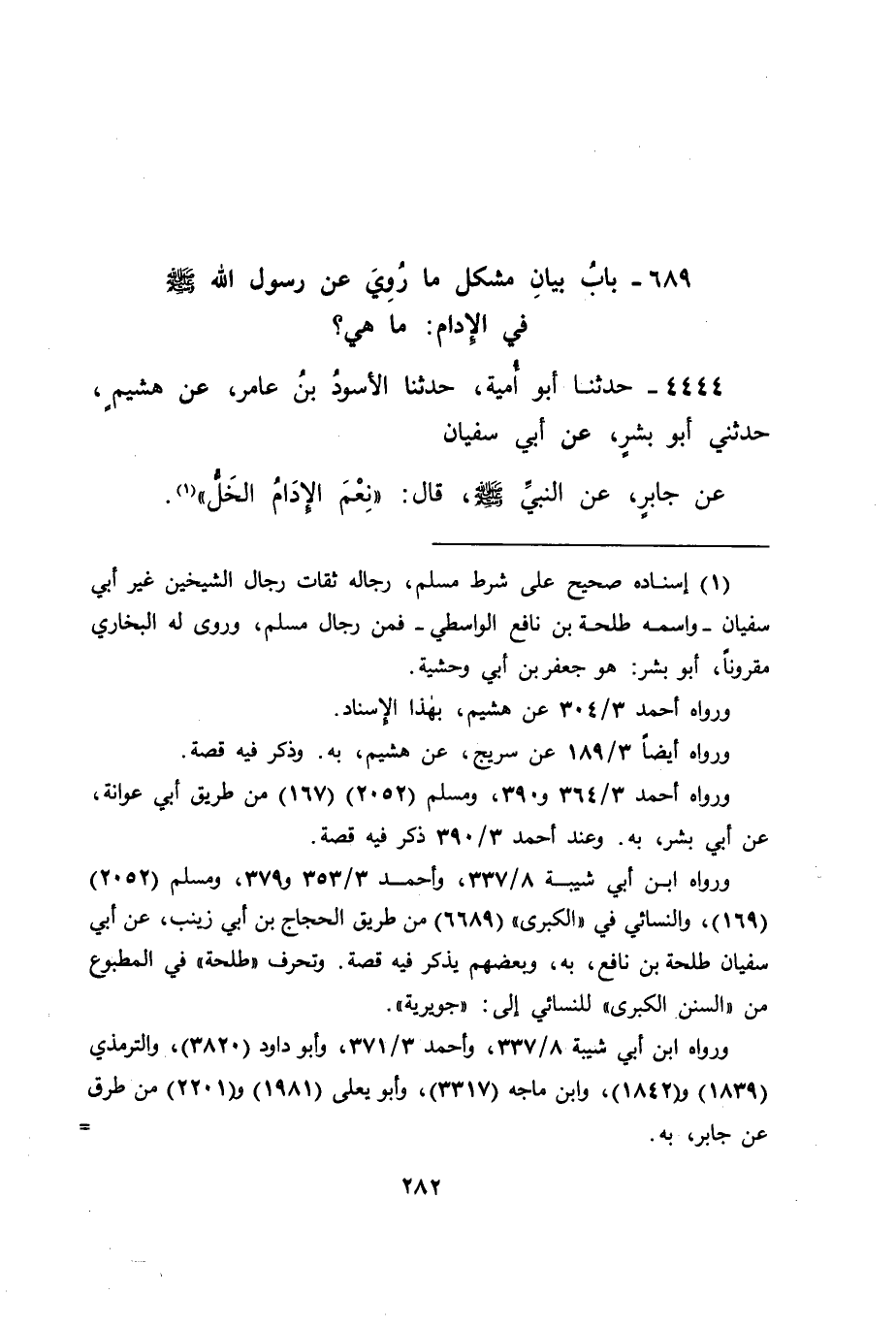 4444 - حَدَّثَنَا أَبُو أُمَيَّةَ، حَدَّثَنَا الْأَسْوَدُ بْنُ عَامِرٍ، عَنْ هُشَيْمٍ، حَدَّثَنِي أَبُو بِشْرٍ، عَنْ أَبِي سُفْيَانَ، عَنْ جَابِرٍ، عَنِ النَّبِيِّ صَلَّى اللَّهُ عَلَيْهِ وَسَلَّمَ قَالَ: " نِعْمَ الْإِدَامُ الْخَلُّ " -[283]-
