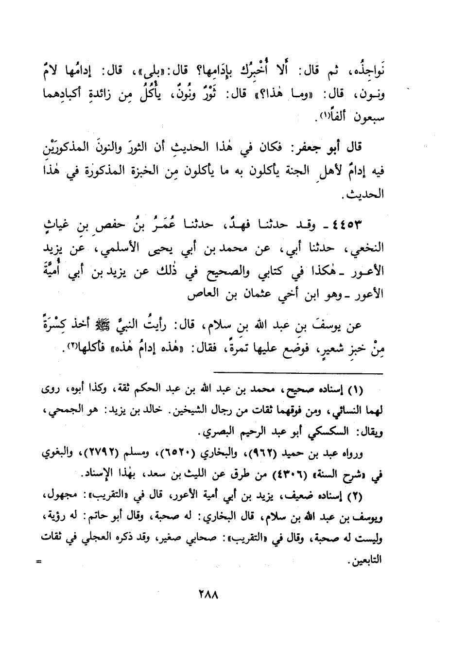 4453 - وَقَدْ حَدَّثَنَا فَهْدٌ، حَدَّثَنَا عُمَرُ بْنُ حَفْصِ بْنِ غِيَاثٍ النَّخَعِيُّ، حَدَّثَنَا أَبِي، عَنْ مُحَمَّدِ بْنِ أَبِي يَحْيَى الْأَسْلَمِيِّ، عَنْ يَزِيدَ الْأَعْوَرِ، هَكَذَا فِي كِتَابِي، وَالصَّحِيحُ فِي ذَلِكَ، عَنْ يَزِيدَ بْنِ أَبِي أُمَيَّةَ الْأَعْوَرِ وَهُوَ ابْنُ أَخِي عُثْمَانَ بْنِ الْعَاصِ، عَنْ يُوسُفَ بْنِ عَبْدِ اللهِ بْنِ سَلَامٍ، قَالَ: رَأَيْتُ النَّبِيَّ صَلَّى اللَّهُ عَلَيْهِ وَسَلَّمَ أَخَذَ كِسْرَةً مِنْ خُبْزٍ شَعِيرٍ، فَوَضَعَ عَلَيْهَا تَمْرَةً، فَقَالَ: " هَذِهِ إِدَامُ هَذِهِ " فَأَكَلَهَا -[289]- فَفِي حَدِيثَيْ مُحَمَّدِ بْنِ عَبْدِ اللهِ بْنِ عَبْدِ الْحَكَمِ، وَفَهْدِ بْنِ سُلَيْمَانَ هَذَيْنِ مَا قَدْ دَلَّ أَنَّ مَا يُؤْكَلُ بِهِ الْخُبْزُ وَإِنْ لَمْ يَصْطَبِغْ بِهِ فِيهِ أُدْمٌ كَمَا الْخَلُّ أُدْمٌ، وَكَمَا الزَّيْتُ أُدْمٌ، وَهَذَا الْقَوْلُ هُوَ أَوْلَى الْقَوْلَيْنِ اللَّذَيْنِ ذَكَرْنَاهُمَا فِي هَذَا الْبَابِ، وَكَلَامُ الْعَرَبِ يَدُلُّ عَلَيْهِ؛ لِأَنَّهُمْ يَقُولُونَ: آدَمَ اللهُ بَيْنَهُمَا، يَعْنُونَ: الزَّوْجَيْنِ، أَيْ: جَعَلَ بَيْنَهُمَا الْمَحَبَّةَ وَالِاتِّفَاقَ، حَتَّى تَعَالَى ذَلِكَ إِلَى رَسُولِ اللهِ صَلَّى اللَّهُ عَلَيْهِ وَسَلَّمَ فِي قَوْلِهِ لِلْمُغِيرَةِ بْنِ شُعْبَةَ لِمَا أَخْبَرَهُ أَنَّهُ خَطَبَ امْرَأَةً، فَقَالَ لَهُ: " هَلْ نَظَرْتَ إِلَيْهَا؟ " فَقَالَ: لَا، فَقَالَ النَّبِيُّ صَلَّى اللَّهُ عَلَيْهِ وَسَلَّمَ: " انْظُرْ إِلَيْهَا، فَإِنَّهُ أَحْرَى أَنْ يُؤْدَمَ بَيْنَكُمَا ". -[290]- وَلَمَّا كَانَ ذَلِكَ كَذَلِكَ فِي بَنِي آدَمَ، كَانَ مِثْلَهُ مَا يُطَيَّبُ بِهِ الطَّعَامُ لِيُؤْكَلَ، لِيَكُونَ بِذَلِكَ أُدْمًا لَهُ، كَمَا قَالَ مُحَمَّدُ بْنُ الْحَسَنِ، وَبِاللهِ التَّوْفِيقُ.