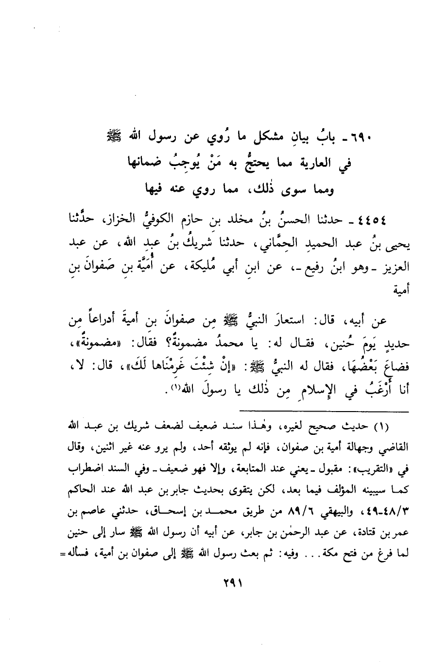 4454 - حَدَّثَنَا الْحَسَنُ بْنُ مَخْلَدِ بْنِ حَازِمٍ الْكُوفِيُّ الْخَزَّازُ، حَدَّثَنَا يَحْيَى بْنُ عَبْدِ الْحَمِيدِ الْحِمَّانِيُّ، حَدَّثَنَا شَرِيكُ بْنُ عَبْدِ اللهِ، عَنْ عَبْدِ الْعَزِيزِ وَهُوَ ابْنُ رُفَيْعٍ، عَنِ ابْنِ أَبِي مُلَيْكَةَ، عَنْ أُمَيَّةَ بْنِ صَفْوَانَ بْنِ أُمَيَّةَ، عَنْ أَبِيهِ، قَالَ: اسْتَعَارَ النَّبِيُّ صَلَّى اللَّهُ عَلَيْهِ وَسَلَّمَ مِنْ صَفْوَانَ بْنِ أُمَيَّةَ أَدْرَاعًا مِنْ حَدِيدٍ يَوْمَ حُنَيْنٍ، فَقَالَ لَهُ: يَا مُحَمَّدُ، مَضْمُونَةٌ؟ فَقَالَ: " مَضْمُونَةٌ " فَضَاعَ بَعْضُهَا، فَقَالَ لَهُ النَّبِيُّ صَلَّى اللَّهُ عَلَيْهِ وَسَلَّمَ: " إِنْ شِئْتَ غَرِمْنَاهَا لَكَ " قَالَ: لَا، أَنَا أَرْغَبُ فِي الْإِسْلَامِ مِنْ ذَلِكَ يَا رَسُولَ اللهِ -[292]- قَالَ: فَفِي هَذَا الْحَدِيثِ اشْتِرَاطُ رَسُولِ اللهِ صَلَّى اللَّهُ عَلَيْهِ وَسَلَّمَ لِصَفْوَانَ فِيمَا كَانَ أَعَارَهُ إِيَّاهُ مِنْ تِلْكَ الْأَدْرَاعِ الضَّمَانَ، فَتَأَمَّلْنَا هَذَا الْحَدِيثَ فِي إِسْنَادِهِ كَيْفَ هُوَ.