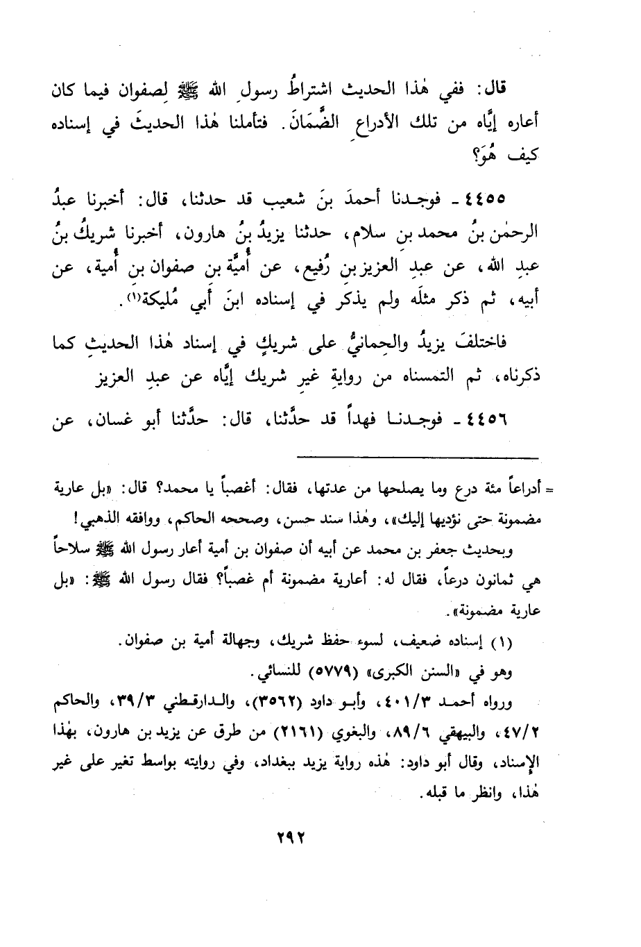 4456 - فَوَجَدْنَا فَهْدًا قَدْ حَدَّثَنَا، قَالَ: حَدَّثَنَا أَبُو غَسَّانَ، عَنْ -[293]- إِسْرَائِيلَ بْنِ يُونُسَ، عَنْ عَبْدِ الْعَزِيزِ بْنِ رُفَيْعٍ، عَنِ ابْنِ أَبِي مُلَيْكَةَ، عَنِ ابْنِ صَفْوَانَ بْنِ أُمَيَّةَ، وَلَمْ يَتَجَاوَزْهُ فِي إِسْنَادِهِ إِلَى أَبِيهِ وَلَا إِلَى غَيْرِهِ، قَالَ: اسْتَعَارَ رَسُولُ اللهِ صَلَّى اللَّهُ عَلَيْهِ وَسَلَّمَ مِنْ صَفْوَانَ بْنِ أُمَيَّةَ أَدْرَاعًا، فَضَاعَ بَعْضُهَا، فَقَالَ: " إِنْ شِئْتَ غَرِمْنَاهَا لَكَ " قَالَ: لَا يَا رَسُولَ اللهِ فَقَوِيَ فِي قُلُوبِنَا دُخُولُ ابْنِ أَبِي مُلَيْكَةَ فِي إِسْنَادِ هَذَا الْحَدِيثِ، وَالْقَضَاءُ فِي ذَلِكَ لِلْحِمَّانِيِّ عَلَى يَزِيدَ، ثُمَّ وَجَدْنَا شَرِيكًا وَإِسْرَائِيلَ قَدِ اخْتَلَفَا فِيمَنْ بَعْدَ ابْنِ أَبِي مُلَيْكَةَ فِي إِسْنَادِ هَذَا الْحَدِيثِ، فَكَانَ فِي إِسْنَادِ شَرِيكٍ أَنَّهُ عَنْ أُمَيَّةَ بْنِ صَفْوَانَ، عَنْ أَبِيهِ، وَفِي حَدِيثِ إِسْرَائِيلَ، عَنِ ابْنِ صَفْوَانَ وَهُوَ أُمَيَّةُ، وَلَيْسَ فِيهِ ذِكْرُهُ إِيَّاهُ عَنْ أَبِيهِ ثُمَّ نَظَرْنَا فِي هَذَا الْحَدِيثِ أَيْضًا هَلْ نَجِدُهُ فِي غَيْرِ رِوَايَتَيْ شَرِيكٍ وَإِسْرَائِيلَ فَنَقِفَ عَلَى حَقِيقَتِهِ كَيْفَ هُوَ فِي ذَلِكَ؟