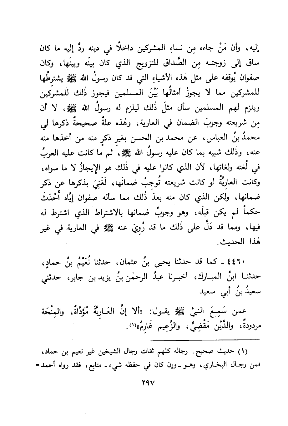 4460 - كَمَا قَدْ حَدَّثَنَا يَحْيَى بْنُ عُثْمَانَ، حَدَّثَنَا نُعَيْمُ بْنُ حَمَّادٍ، حَدَّثَنَا ابْنُ الْمُبَارَكِ، أَخْبَرَنَا عَبْدُ الرَّحْمَنِ بْنُ يَزِيدَ بْنِ جَابِرٍ، حَدَّثَنِي سَعِيدُ بْنُ أَبِي سَعِيدٍ، عَمَّنْ سَمِعَ النَّبِيَّ صَلَّى اللَّهُ عَلَيْهِ وَسَلَّمَ يَقُولُ: " أَلَا إِنَّ الْعَارِيَةَ مُؤَدَّاةٌ، وَالْمِنْحَةَ مَرْدُودَةٌ، وَالدَّيْنَ مَقْضِيٌّ، وَالزَّعِيمَ غَارِمٌ " -[298]-