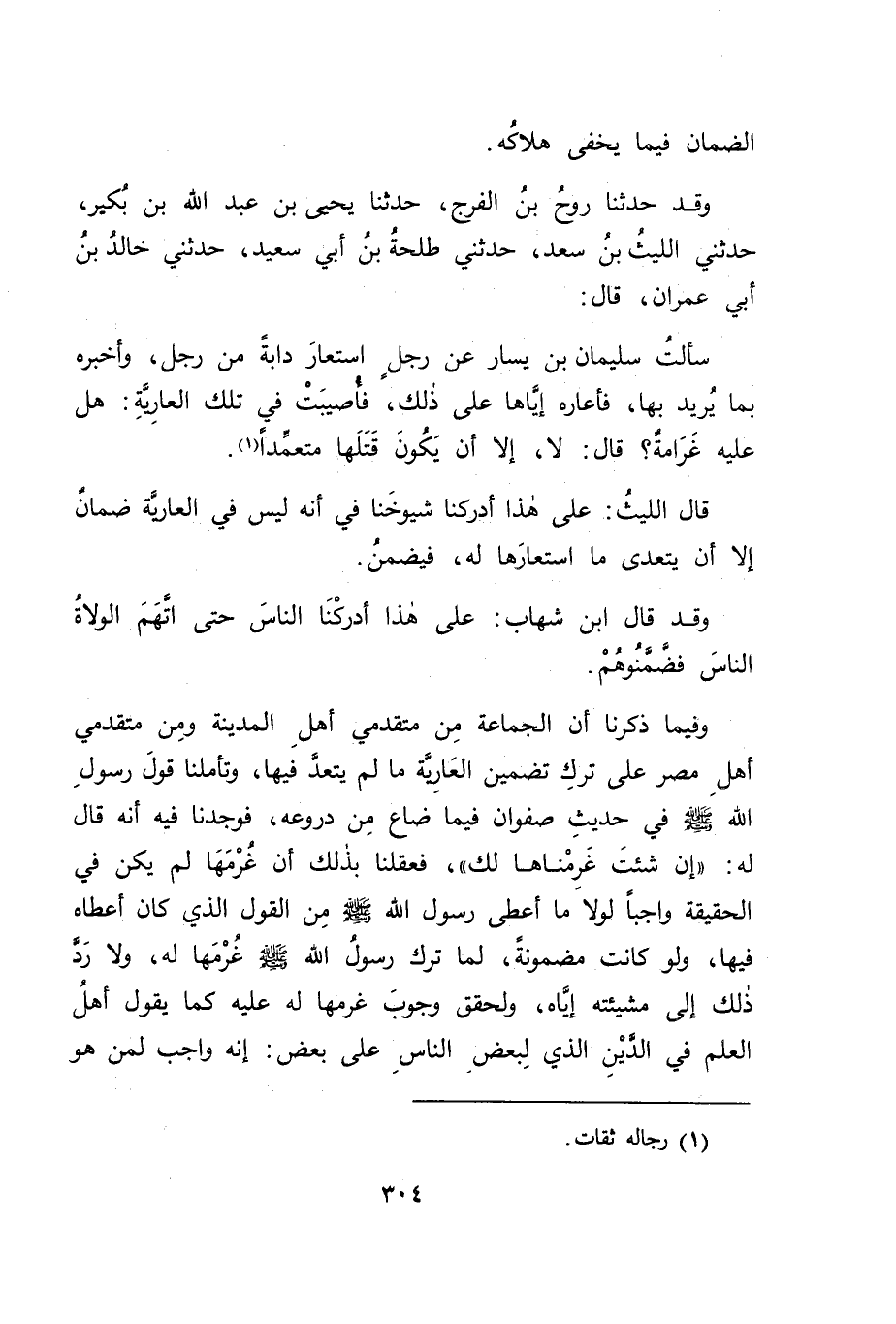 وَقَدْ حَدَّثَنَا رَوْحُ بْنُ الْفَرَجِ، حَدَّثَنَا يَحْيَى بْنُ عَبْدِ اللهِ بْنِ بُكَيْرٍ، حَدَّثَنِي اللَّيْثُ بْنُ سَعْدٍ، حَدَّثَنِي طَلْحَةُ بْنُ أَبِي سَعِيدٍ، حَدَّثَنِي خَالِدُ بْنُ أَبِي عِمْرَانَ، قَالَ: سَأَلْتُ سُلَيْمَانَ بْنَ يَسَارٍ: عَنْ رَجُلٍ اسْتَعَارَ دَابَّةً مِنْ رَجُلٍ، وَأَخْبَرَهُ بِمَا يُرِيدُ بِهَا، فَأَعَارَهُ إِيَّاهَا عَلَى ذَلِكَ، فَأُصِيبَتْ فِي تِلْكَ الْعَارِيَةِ: هَلْ عَلَيْهِ غَرَامَةٌ؟ قَالَ: " لَا، إِلَّا أَنْ يَكُونَ قَتَلَهَا مُتَعَمِّدًا " قَالَ اللَّيْثُ: عَلَى هَذَا أَدْرَكْنَا شُيُوخَنَا فِي أَنَّهُ لَيْسَ فِي الْعَارِيَةِ ضَمَانٌ إِلَّا أَنْ يَتَعَدَّى مَا اسْتَعَارَهَا لَهُ، فَيَضْمَنُ وَقَدْ قَالَ ابْنُ شِهَابٍ: عَلَى هَذَا أَدْرَكْنَا النَّاسَ حَتَّى اتَّهَمَ الْوُلَاةُ النَّاسَ فَضَمَّنُوهُمْ، وَفِيمَا ذَكَرْنَا أَنَّ الْجَمَاعَةَ مِنْ مُتَقَدِّمِي أَهْلِ الْمَدِينَةِ، وَمِنْ مُتَقَدِّمِي أَهْلِ مِصْرَ عَلَى تَرْكِ تَضْمِينِ الْعَارِيَةِ مَا لَمْ يُتَعَدَّ فِيهَا، وتَأَمَّلْنَا قَوْلَ رَسُولِ اللهِ صَلَّى اللَّهُ عَلَيْهِ وَسَلَّمَ فِي حَدِيثِ صَفْوَانَ فِيمَا ضَاعَ مِنْ دُرُوعِهِ، فَوَجَدْنَا فِيهِ أَنَّهُ قَالَ لَهُ: " إِنْ شِئْتَ غَرَمْنَاهَا لَكَ "، فَعَقَلْنَا بِذَلِكَ أَنَّ غُرْمَهَا لَمْ يَكُنْ فِي الْحَقِيقَةِ وَاجِبًا لَوْلَا مَا أَعْطَى رَسُولُ اللهِ صَلَّى اللَّهُ عَلَيْهِ وَسَلَّمَ مِنَ الْقَوْلِ الَّذِي كَانَ أَعْطَاهُ فِيهَا، وَلَوْ كَانَتْ مَضْمُونَةً، لَمَا تَرَكَ رَسُولُ اللهِ صَلَّى اللَّهُ عَلَيْهِ وَسَلَّمَ غُرْمَهَا لَهُ، وَلَا رَدَّ ذَلِكَ إِلَى مَشِيئَتِهِ إِيَّاهُ، وَلَحَقَّقَ وُجُوبَ غُرْمِهَا لَهُ عَلَيْهِ كَمَا يَقُولُ أَهْلُ الْعِلْمِ فِي الدَّيْنِ الَّذِي لِبَعْضِ النَّاسِ عَلَى بَعْضٍ: إِنَّهُ وَاجِبٌ لِمَنْ هُوَ -[305]- عَلَيْهِ مُطَالَبَةُ مَنْ هُوَ لَهُ عَلَيْهِ يَأْخُذُهُ مِنْهُ حَتَّى تَبْرَأَ ذِمَّتُهُ، وَرَسُولُ اللهِ صَلَّى اللَّهُ عَلَيْهِ وَسَلَّمَ أَوْلَى النَّاسِ بِذَلِكَ وَأَشَدُّهُمْ تَمَسُّكًا بِهِ، وَفِي جَوَابِ صَفْوَانَ لِرَسُولِ اللهِ صَلَّى اللَّهُ عَلَيْهِ وَسَلَّمَ بِقَوْلِهِ: " إِنَّ فِي قَلْبِي الْيَوْمَ مِنَ الْإِيمَانِ مَا لَمْ يَكُنْ يَوْمَئِذٍ " دَلِيلٌ عَلَى أَنَّ الَّذِيَ كَانَ اشْتَرَطَهُ عَلَيْهِ مِنَ الضَّمَانِ لَمَّا أَعَارَهُ إِيَّاهُ كَانَ عَلَى حُكْمٍ غَيْرِ الْإِيمَانِ، كَمَا قَالَ مُحَمَّدُ بْنُ الْحَسَنِ مِمَّا ذَكَرْنَاهُ مِنْ رِوَايَةِ مُحَمَّدِ بْنِ الْعَبَّاسِ، وَفِي ذَلِكَ مَا قَدْ دَلَّ عَلَى أَنَّ حُكْمَ الْعَارِيَةِ بَيْنَ أَهْلِ الْإِيمَانِ بِخِلَافِ ذَلِكَ مِنَ انْتِفَاءِ الضَّمَانِ عَنْهَا، وَبِاللهِ التَّوْفِيقُ.