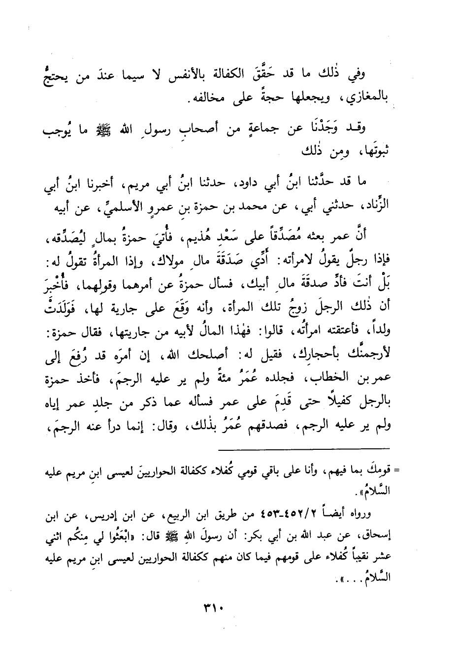 مَا قَدْ حَدَّثَنَا ابْنُ أَبِي دَاوُدَ، حَدَّثَنَا ابْنُ أَبِي مَرْيَمَ، أَخْبَرَنَا ابْنُ أَبِي الزِّنَادِ، حَدَّثَنِي أَبِي، عَنْ مُحَمَّدِ بْنِ حَمْزَةَ بْنِ عَمْرٍو الْأَسْلَمِيِّ، عَنْ أَبِيهِ: أَنَّ عُمَرَ بَعَثَهُ مُصَدِّقًا عَلَى سَعْدِ هُذَيْمٍ، فَأُتِيَ حَمْزَةُ بِمَالٍ لِيُصَدِّقَهُ، فَإِذَا رَجُلٌ يَقُولُ لِامْرَأَتِهِ: أَدِّي صَدَقَةَ مَالِ مَوْلَاكِ، وَإِذَا الْمَرْأَةُ تَقُولُ لَهُ: بَلْ أَنْتَ فَأَدِّ صَدَقَةَ مَالِ أَبِيكَ، فَسَأَلَ حَمْزَةُ عَنْ أَمْرِهِمَا وَقَوْلِهِمَا، فَأُخْبِرَ أَنَّ ذَلِكَ الرَّجُلَ زَوْجُ تِلْكَ الْمَرْأَةِ، وَأَنَّهُ وَقَعَ عَلَى جَارِيَةٍ لَهَا فَوَلَدَتْ وَلَدًا فَأَعْتَقَتْهُ امْرَأَتُهُ، قَالُوا: فَهَذَا الْمَالُ لِأَبِيهِ مِنْ جَارِيتِهَا، فَقَالَ حَمْزَةُ: لَأَرْجُمَنَّكَ بِأَحْجَارِكَ، فَقِيلَ لَهُ: أَصْلَحَكَ اللهُ، إِنْ أَمْرَهُ قَدْ رُفِعَ إِلَى عُمَرَ بْنِ الْخَطَّابِ، فَجَلَدَهُ عُمَرُ مِائَةً وَلَمْ يَرَ عَلَيْهِ الرَّجْمَ، فَأَخَذَ حَمْزَةُ بِالرَّجُلِ كَفِيلًا حَتَّى قَدِمَ عَلَى عُمَرَ فَسَأَلَهُ عَمَّا ذَكَرَ مِنْ جَلْدِ عُمَرَ إِيَّاهُ وَلَمْ يَرَ عَلَيْهِ الرَّجْمَ، فَصَدَّقَهُمْ عُمَرُ بِذَلِكَ، وَقَالَ: " إِنَّمَا دَرَأَ عَنْهُ الرَّجْمَ؛ -[311]- لِأَنَّهُ عَذَرَهُ بِالْجَهَالَةِ "