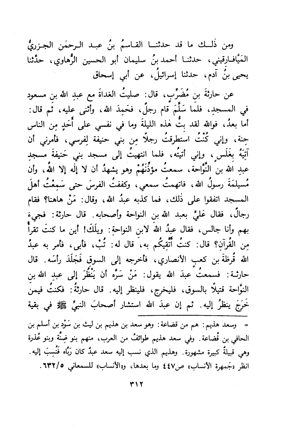 وَمِنْ ذَلِكَ: مَا قَدْ حَدَّثَنَا الْقَاسِمُ بْنُ عَبْدِ الرَّحْمَنِ الْجَزَرِيُّ الْمَيَافَارِقِينِيُّ، حَدَّثَنَا أَحْمَدُ بْنُ سُلَيْمَانَ أَبُو الْحُسَيْنِ الرَّهَاوِيُّ، حَدَّثَنَا يَحْيَى بْنُ آدَمَ، حَدَّثَنَا إِسْرَائِيلُ، عَنْ أَبِي إِسْحَاقَ، عَنْ حَارِثَةَ بْنِ مُضَرِّبٍ، قَالَ: صَلَّيْتُ الْغَدَاةَ مَعَ عَبْدِ اللهِ بْنِ مَسْعُودٍ فِي الْمَسْجِدِ، فَلَمَّا سَلَّمَ قَامَ رَجُلٌ فَحَمِدَ اللهَ وَأَثْنَى عَلَيْهِ، ثُمَّ قَالَ: " أَمَّا بَعْدُ، فَوَاللهِ لَقَدْ بِتُّ هَذِهِ اللَّيْلَةَ وَمَا فِي نَفْسِي عَلَى أَحَدٍ مِنَ النَّاسِ حَنَّةٌ، وَإِنِّي كُنْتُ اسْتَطْرَقْتُ رَجُلًا مِنْ بَنِي حَنِيفَةَ لِفَرَسِي، فَأَمَرَنِي أَنْ آتِيَهُ بِغَلَسٍ، وَإِنِّي أَتَيْتُهُ، فَلَمَّا انْتَهَيْتُ إِلَى مَسْجِدِ بَنِي حَنِيفَةَ مَسْجِدِ عَبْدِ اللهِ بْنِ النَّوَّاحَةِ، سَمِعْتُ مُؤَذِّنَهُمْ وَهُوَ يَشْهَدُ أَنْ لَا إِلَهَ إِلَّا اللهُ، وَأَنَّ مُسَيْلِمَةَ رَسُولُ اللهِ، فَاتَّهَمْتُ سَمْعِي، وَكَفَفْتُ الْفَرَسَ حَتَّى سَمِعْتُ أَهْلَ الْمَسْجِدِ اتَّفَقُوا عَلَى ذَلِكَ " فَمَا كَذَّبَهُ عَبْدُ اللهِ، وَقَالَ: مَنْ هَاهُنَا؟ فَقَامَ رِجَالٌ، فَقَالَ: " عَلَيَّ بِعَبْدِ اللهِ بْنِ النَّوَّاحَةِ وَأَصْحَابِهِ، قَالَ حَارِثَةُ: فَجِيءَ بِهِمْ وَأَنَا جَالِسٌ، فَقَالَ عَبْدُ اللهِ لِابْنِ النَّوَّاحَةِ: " وَيْلَكَ، أَيْنَ مَا كُنْتَ تَقْرَأُ مِنَ الْقُرْآنِ؟ " قَالَ: كُنْتُ أَتَّقِيكُمْ بِهِ، قَالَ لَهُ: " تُبْ "، فَأَبَى فَأَمَرَ بِهِ عَبْدُ اللهِ قَرَظَةَ بْنَ كَعْبٍ الْأَنْصَارِيَّ، فَأَخْرَجَهُ إِلَى السُّوقِ فَجَلَدَ رَأْسَهُ، قَالَ حَارِثَةُ: فَسَمِعْتُ عَبْدَ اللهِ يَقُولُ: " مَنْ سَرَّهُ أَنْ يَنْظُرَ إِلَى عَبْدِ اللهِ بْنِ النَّوَّاحَةِ قَتِيلًا بِالسُّوقِ، فَلْيَخْرُجْ، فَلْيَنْظُرْ إِلَيْهِ "، قَالَ حَارِثَةُ: فَكُنْتُ فِيمَنْ خَرَجَ يَنْظُرُ إِلَيْهِ، ثُمَّ إِنَّ عَبْدَ اللهِ اسْتَشَارَ أَصْحَابَ النَّبِيِّ صَلَّى اللَّهُ عَلَيْهِ وَسَلَّمَ فِي بَقِيَّةِ -[313]- النَّفَرِ فَقَامَ عَدِيُّ بْنُ حَاتِمٍ الطَّائِيُّ، فَحَمِدَ اللهَ، وَأَثْنَى عَلَيْهِ، ثُمَّ قَالَ: " أَمَّا بَعْدُ، فَثُؤْلُولٌ مِنَ الْكُفْرِ أَطْلَعَ رَأْسَهُ فَاحْسِمْهُ، فَلَا يَكُونُ بَعْدَهُ شَيْءٌ "، وَقَامَ الْأَشْعَثُ بْنُ قَيْسٍ، وَجَرِيرُ بْنُ عَبْدِ اللهِ، فَقَالَا: بَلِ اسْتَتِبْهُمْ، وَكَفِّلْهُمْ عَشَائِرَهُمْ، فَاسْتَتَابَهُمْ فَتَابُوا، وَكَفَّلَهُمْ عَشَائِرَهُمْ، وَنَفَاهُمْ إِلَى الشَّامِ فَفِي هَذَيْنِ الْحَدِيثَيْنِ اسْتِعْمَالُ عَبْدِ اللهِ الْكَفَالَةَ بِالْأَنْفُسِ بِمَشُورَةِ مَنْ أَشَارَ عَلَيْهِ بِهَا، وَبِحُضُورِ مَنْ حَضَرَهَا، فَلَمْ يُنْكَرْ عَلَيْهِ ذَلِكَ، وَلَمْ يُخَالِفْهُ فِيهِ، فَدَلَّ ذَلِكَ عَلَى مُتَابَعَتِهِمْ إِيَّاهُ عَلَيْهِ، وَمَا جَاءَ هَذَا الْمَجِيءَ كَانَ بِالْقُوَّةِ أَوْلَى، وَبِنَفْيِ الضَّعْفِ عَنْهُ أَحْرَى، وَاللهُ أَعْلَمُ.