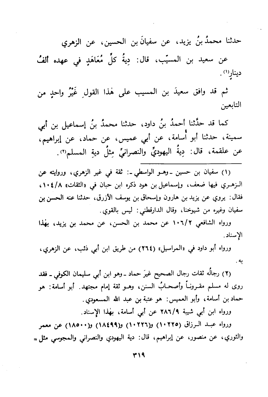 كَمَا قَدْ حَدَّثَنَا أَحْمَدُ بْنُ دَاوُدَ، حَدَّثَنَا مُحَمَّدُ بْنُ إِسْمَاعِيلَ بْنِ أَبِي سَمِينَةَ، حَدَّثَنَا أَبُو أُسَامَةَ، عَنْ أَبِي عُمَيْسٍ، عَنْ حَمَّادٍ، عَنْ إِبْرَاهِيمَ، عَنْ عَلْقَمَةَ قَالَ: " دِيَةُ الْيَهُودِيِّ وَالنَّصْرَانِيِّ مِثْلُ دِيَةِ الْمُسْلِمِ "
