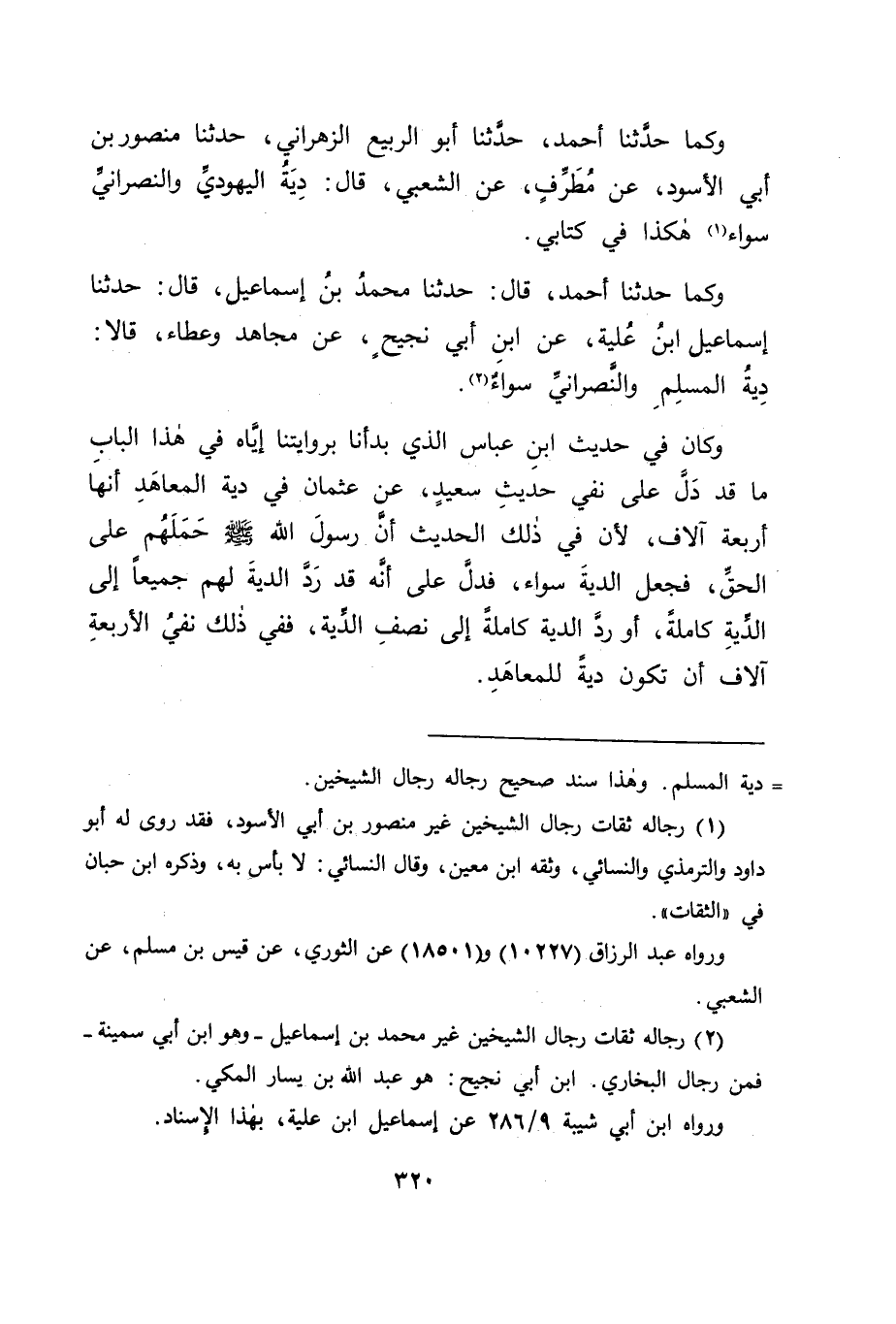 وَكَمَا حَدَّثَنَا أَحْمَدُ، حَدَّثَنَا أَبُو الرَّبِيعِ الزَّهْرَانِيُّ، حَدَّثَنَا مَنْصُورُ بْنُ أَبِي الْأَسْوَدِ، عَنْ مُطَرِّفٍ، عَنِ الشَّعْبِيِّ قَالَ: " دِيَةُ الْيَهُودِيِّ وَالنَّصْرَانِيِّ سَوَاءٌ " هَكَذَا فِي كِتَابِي