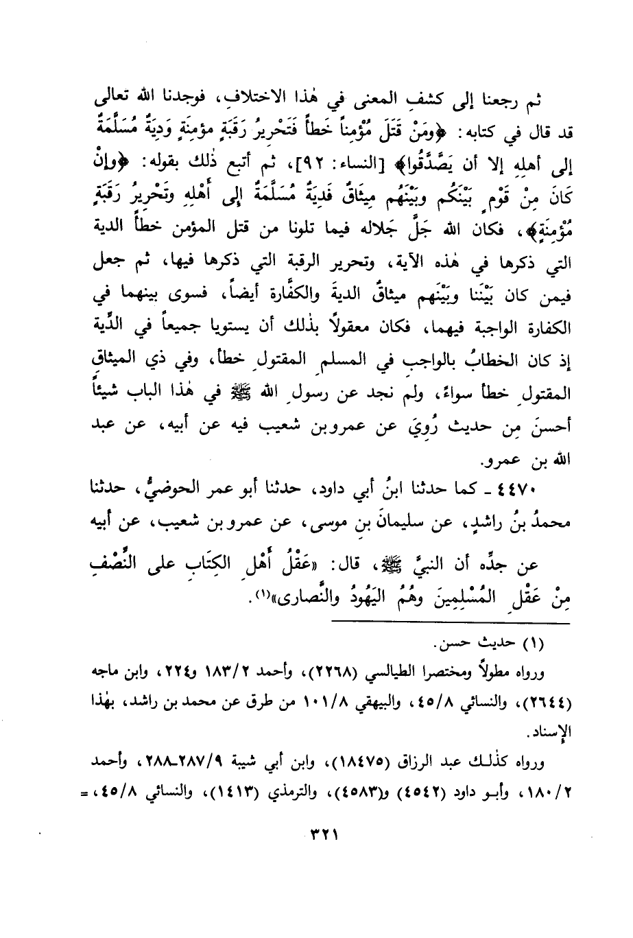 4470 - كَمَا حَدَّثَنَا ابْنُ أَبِي دَاوُدَ، حَدَّثَنَا أَبُو عُمَرَ الْحَوْضِيُّ، حَدَّثَنَا مُحَمَّدُ بْنُ رَاشِدٍ، عَنْ سُلَيْمَانَ بْنِ مُوسَى، عَنْ عَمْرِو بْنِ شُعَيْبٍ، عَنْ أَبِيهِ، عَنْ جَدِّهِ: أَنَّ النَّبِيَّ صَلَّى اللَّهُ عَلَيْهِ وَسَلَّمَ، قَالَ: " عَقْلُ أَهْلِ الْكِتَابِ عَلَى النِّصْفِ مِنْ عَقْلِ الْمُسْلِمِينَ، وَهُمُ الْيَهُودُ وَالنَّصَارَى " -[322]- فَإِنْ كَانَ هَذَا الْحَدِيثُ ثَابِتًا فَإِنَّ رَسُولَ اللهِ صَلَّى اللَّهُ عَلَيْهِ وَسَلَّمَ هُوَ الْمُبَيِّنُ عَنِ اللهِ تَعَالَى الدِّيَةَ الَّتِي ذَكَرَهَا فِي ذِي الْمِيثَاقِ مَا هِيَ؟ وَإِنْ كَانَ بِخِلَافِ ذَلِكَ كَانَ ظَاهِرُ الْقُرْآنِ يَدُلُّ عَلَى تُسَاوِي الْمُسْلِمِينَ وَذَوِي الْعُهُودِ فِي الدِّيَاتِ، وَمِنَ الْقَائِلِينَ بِالتَّسَاوِي فِي ذَلِكَ أَبُو حَنِيفَةَ وَأَصْحَابُهُ، وَمِنَ الْقَائِلِينَ بِأَنَّ الْوَاجِبَ فِيهِمْ نِصْفُ الدِّيَةِ مَالِكٌ وَأَصْحَابُهُ، وَمِنَ الْقَائِلِينَ فِي دِيَاتِهِمْ أَنَّهَا أَرْبَعَةُ آلَافٍ الشَّافِعِيُّ، غَيْرَ أَنَّهُ قَدْ رُوِيَ عَنِ الزُّهْرِيِّ فِي ذَلِكَ: