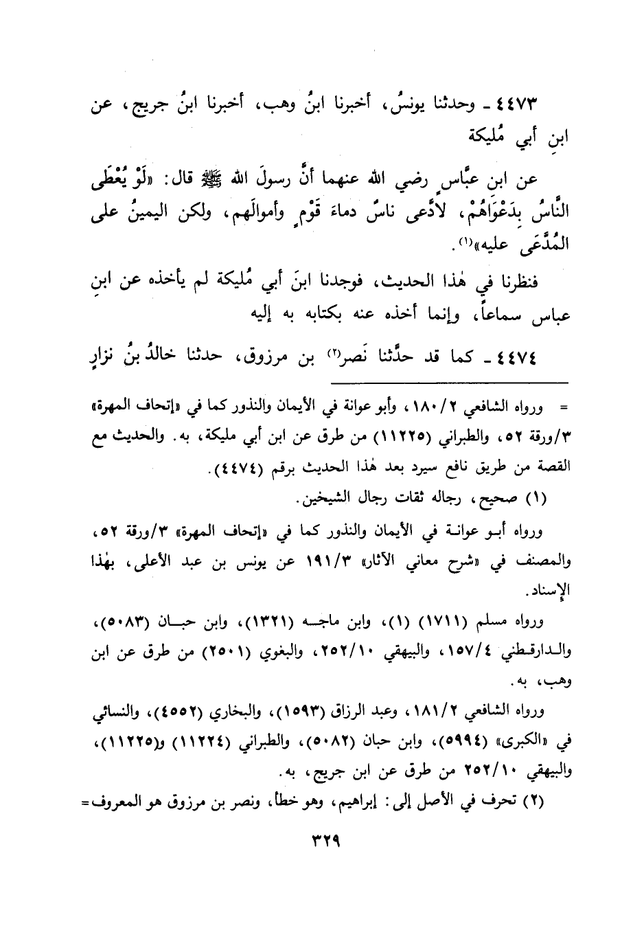 4473 - وَحَدَّثَنَا يُونُسُ، أَخْبَرَنَا ابْنُ وَهْبٍ، أَخْبَرَنَا ابْنُ جُرَيْجٍ، عَنِ ابْنِ أَبِي مُلَيْكَةَ، عَنِ ابْنِ عَبَّاسٍ، رَضِيَ اللهُ عَنْهُمَا أَنَّ رَسُولَ اللهِ صَلَّى اللَّهُ عَلَيْهِ وَسَلَّمَ قَالَ: " لَوْ يُعْطَى النَّاسُ بِدَعْوَاهُمْ، لَادَّعَى نَاسٌ دِمَاءَ قَوْمٍ وَأَمْوَالَهُمْ، وَلَكِنَّ الْيَمِينَ عَلَى الْمُدَّعَى عَلَيْهِ " فَنَظَرْنَا فِي هَذَا الْحَدِيثِ، فَوَجَدْنَا ابْنَ أَبِي مُلَيْكَةَ لَمْ يَأْخُذْهُ عَنِ ابْنِ عَبَّاسٍ سَمَاعًا، وَإِنَّمَا أَخَذَهُ عَنْهُ بِكِتَابِهِ بِهِ إِلَيْهِ.
