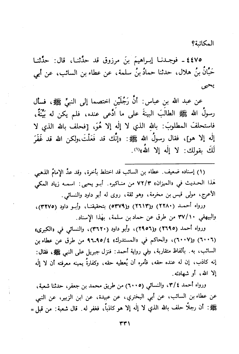4475 - فَوَجَدْنَا إِبْرَاهِيمَ بْنَ مَرْزُوقٍ قَدْ حَدَّثَنَا، قَالَ: حَدَّثَنَا حِبَّانُ بْنُ هِلَالٍ، حَدَّثَنَا حَمَّادُ بْنُ سَلَمَةَ، عَنْ عَطَاءِ بْنِ السَّائِبِ، عَنْ أَبِي يَحْيَى، عَنْ عَبْدِ اللهِ بْنِ عَبَّاسٍ: أَنَّ رَجُلَيْنِ اخْتَصَمَا إِلَى النَّبِيِّ صَلَّى اللَّهُ عَلَيْهِ وَسَلَّمَ، فَسَأَلَ رَسُولُ اللهِ صَلَّى اللَّهُ عَلَيْهِ وَسَلَّمَ الطَّالِبَ الْبَيِّنَةَ عَلَى مَا ادَّعَى عِنْدَهُ، فَلَمْ يَكُنْ لَهُ بَيِّنَةٌ، فَاسْتَحْلَفَ الْمَطْلُوبَ بِاللهِ الَّذِي لَا إِلَهَ إِلَّا هُوَ، فَحَلَفَ بِاللهِ الَّذِي لَا إِلَهَ إِلَّا هُوَ، فَقَالَ رَسُولُ اللهِ صَلَّى اللَّهُ عَلَيْهِ وَسَلَّمَ: " إِنَّكَ قَدْ فَعَلْتَ، وَلَكِنَّ اللهَ قَدْ غَفَرَ لَكَ بِقَوْلِكَ: لَا إِلَهَ إِلَّا اللهُ " -[332]- فَوَقَفْنَا بِهَذَا الْحَدِيثِ عَلَى سُؤَالِ رَسُولِ اللهِ صَلَّى اللَّهُ عَلَيْهِ وَسَلَّمَ الطَّالِبَ الْبَيِّنَةَ عَلَى مَا ادَّعَاهُ عِنْدَهُ، وَأَنَّهُ لَمَّا لَمْ يَكُنْ لَهُ بَيِّنَةٌ، اسْتَحْلَفَ لَهُ الْمَطْلُوبَ عَلَى مَا اسْتَحْلَفَهُ لَهُ عَلَيْهِ، فَكَانَ هَذَا عَنِ ابْنِ عَبَّاسٍ أَقْوَى مِنَ الْحَدِيثِ الْأَوَّلِ، وَكَانَ فِيهِ مَا يَدُلُّ عَلَى أَنَّ مَا فِي الْحَدِيثِ الْأَوَّلِ مَأْثُورٌ عَنْ رَسُولِ اللهِ صَلَّى اللَّهُ عَلَيْهِ وَسَلَّمَ، وَفِيهِ أَيْضًا سُؤَالُ رَسُولِ اللهِ صَلَّى اللَّهُ عَلَيْهِ وَسَلَّمَ الطَّالِبَ الْبَيِّنَةَ، فَدَلَّ ذَلِكَ عَلَى أَنَّ الْبَيِّنَةَ مَطْلُوبَةٌ مِنَ الطَّالِبِ كَالْيَمِينِ مَطْلُوبَةٌ مِنَ الْمَطْلُوبِ، قَدْ رُوِيَ هَذَا الْمَعْنَى أَيْضًا عَنْ رَسُولِ اللهِ صَلَّى اللَّهُ عَلَيْهِ وَسَلَّمَ مِنْ غَيْرِ طَرِيقِ ابْنِ عَبَّاسٍ.