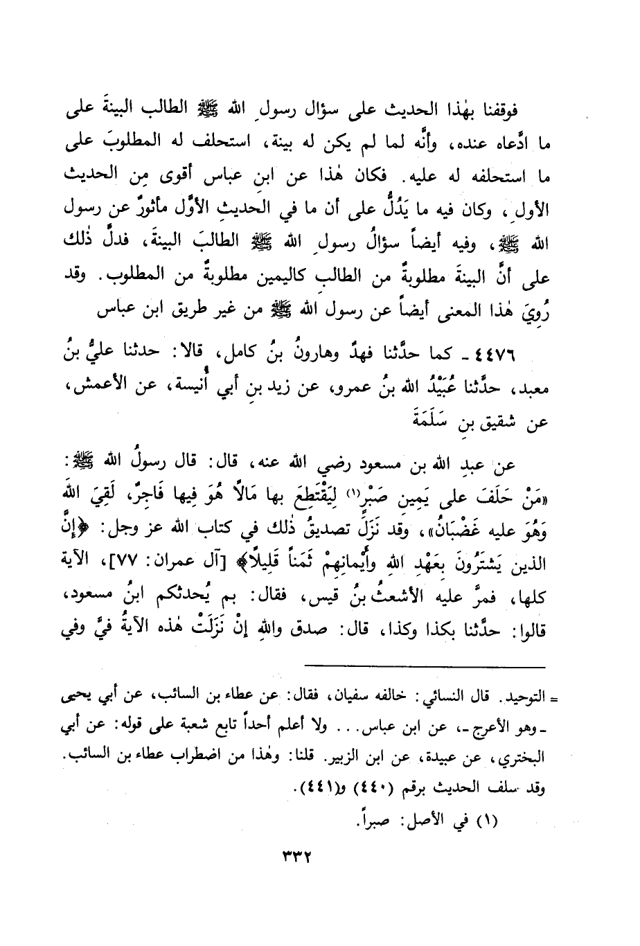 4476 - كَمَا حَدَّثَنَا فَهْدٌ، وَهَارُونُ بْنُ كَامِلٍ، قَالَا: حَدَّثَنَا عَلِيُّ بْنُ مَعْبَدٍ، حَدَّثَنَا عُبَيْدُ اللهِ بْنُ عَمْرٍو، عَنْ زَيْدِ بْنِ أَبِي أُنَيْسَةَ، عَنِ الْأَعْمَشِ، عَنْ شَقِيقِ بْنِ سَلَمَةَ، عَنْ عَبْدِ اللهِ بْنِ مَسْعُودٍ، رَضِيَ اللهُ عَنْهُ، قَالَ: قَالَ رَسُولُ اللهِ صَلَّى اللَّهُ عَلَيْهِ وَسَلَّمَ: " مَنْ حَلَفَ عَلَى يَمِينِ صَبْرٍ لِيَقْتَطِعَ بِهَا مَالًا هُوَ فِيهَا فَاجِرٌ، لَقِيَ اللهَ وَهُوَ عَلَيْهِ غَضْبَانُ " وَقَدْ نَزَلَ تَصْدِيقُ ذَلِكَ فِي كِتَابِ اللهِ عَزَّ وَجَلَّ: {إِنَّ الَّذِينَ يَشْتَرُونَ بِعَهْدِ اللهِ وَأَيْمَانِهِمْ ثَمَنًا قَلِيلًا} [آل عمران: 77] ، الْآيَةَ كُلَّهَا، فَمَرَّ عَلَيْهِ الْأَشْعَثُ بْنُ قَيْسٍ، فَقَالَ: بِمَ يُحَدِّثُكُمُ ابْنُ مَسْعُودٍ؟ قَالُوا: حَدَّثَنَا بِكَذَا وَكَذَا، قَالَ: صَدَقَ، وَاللهِ إِنْ نَزَلَتْ هَذِهِ الْآيَةُ فِيَّ وَفِي -[333]- صَاحِبٍ لِي كَانَ بَيْنِي وَبَيْنَهُ بِئْرٌ فِي أَرْضٍ، فَقَالَ: هِيَ لِي، فَأَتَيْنَا رَسُولَ اللهِ صَلَّى اللَّهُ عَلَيْهِ وَسَلَّمَ، فَاخْتَصَمْنَا إِلَيْهِ، فَقَالَ لِي رَسُولُ اللهِ صَلَّى اللَّهُ عَلَيْهِ وَسَلَّمَ: " هَلْ لَكَ مِنْ شُهُودٍ؟ " فَقُلْتُ: لَا، فَقَالَ لِصَاحِبِي: " احْلِفْ " فَحَلَفَ، فَعِنْدَ ذَلِكَ نَزَلَتْ هَذِهِ الْآيَةُ