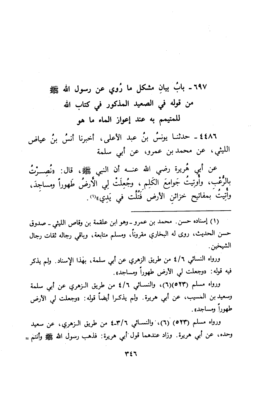 4486 - حَدَّثَنَا يُونُسُ بْنُ عَبْدِ الْأَعْلَى، أَخْبَرَنَا أَنَسُ بْنُ عِيَاضٍ اللَّيْثِيُّ، عَنْ مُحَمَّدِ بْنِ عَمْرٍو، عَنْ أَبِي سَلَمَةَ، عَنْ أَبِي هُرَيْرَةَ، رَضِيَ اللهُ عَنْهُ أَنَّ النَّبِيَّ صَلَّى اللَّهُ عَلَيْهِ وَسَلَّمَ، قَالَ: " نُصِرْتُ بِالرُّعْبِ، وَأُوتِيتُ جَوَامِعَ الْكَلِمِ، وَجُعِلَتْ لِيَ الْأَرْضُ طَهُورًا وَمَسَاجِدَ، وَأُوتِيتُ بِمَفَاتِيحِ خَزَائِنِ الْأَرْضِ فَتُلَّتْ فِي يَدِي "
