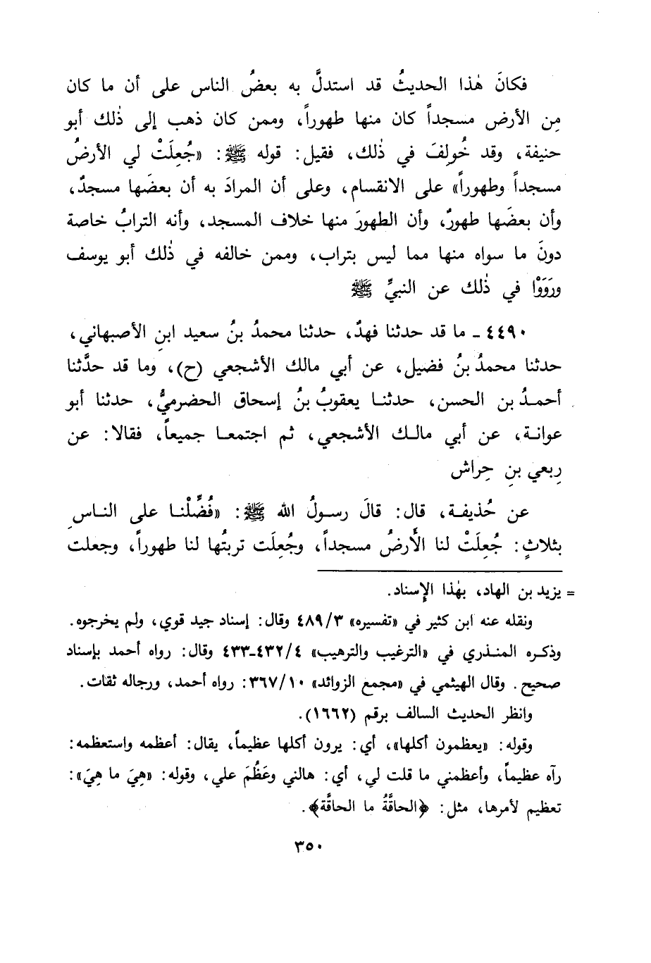 4490 - مَا قَدْ حَدَّثَنَا فَهْدٌ، حَدَّثَنَا مُحَمَّدُ بْنُ سَعِيدِ بْنِ الْأَصْبَهَانِيِّ، حَدَّثَنَا مُحَمَّدُ بْنُ فُضَيْلٍ، عَنْ أَبِي مَالِكٍ الْأَشْجَعِيِّ، ح وَمَا قَدْ حَدَّثَنَا أَحْمَدُ بْنُ الْحَسَنِ، حَدَّثَنَا يَعْقُوبُ بْنُ إِسْحَاقَ الْحَضْرَمِيُّ، حَدَّثَنَا أَبُو عَوَانَةَ، عَنْ أَبِي مَالِكٍ الْأَشْجَعِيِّ، ثُمَّ اجْتَمَعَا جَمِيعًا، فَقَالَا: عَنْ رِبْعِيِّ بْنِ حِرَاشٍ، عَنْ حُذَيْفَةَ، قَالَ: قَالَ رَسُولُ اللهِ صَلَّى اللَّهُ عَلَيْهِ وَسَلَّمَ: " فُضِّلْنَا عَلَى النَّاسِ بِثَلَاثٍ: جُعِلَتْ لَنَا الْأَرْضُ مَسْجِدًا، وَجُعِلَتْ تُرْبَتُهَا لَنَا طَهُورًا، وَجُعِلَتْ -[351]- صُفُوفُنَا كَصُفُوفِ الْمَلَائِكَةِ، وَأُعْطِيتُ الْآيَاتِ مِنْ آخِرِ سُورَةِ الْبَقَرَةِ مِنْ تَحْتِ الْعَرْشِ، لَمْ يُعْطَ مِنْهُ أَحَدٌ قَبْلِي، وَلَا يُعْطَى مِنْهُ أَحَدٌ بَعْدِي " فَدَلَّ مَا فِي هَذَا الْحَدِيثِ عَلَى أَنَّ مَعْنَى قَوْلِهِ فِيمَا قَدْ ذَكَرْنَاهُ قَبْلَهُ " جُعِلَتْ لِيَ الْأَرْضُ مَسْجِدًا وَطَهُورًا " أَنَّ ذَلِكَ عَلَى الِانْقِسَامِ الَّذِي يُوجِبُ -[352]- بَعْضَهَا مَسْجِدًا، وَبَعْضَهَا طَهُورًا، لَا عَلَى الْجُمْلَةِ الَّتِي تُوجِبُ كُلَّهَا مَسْجِدًا وَكُلَّهَا طَهُورًا كَمَا قَالَ أَبُو يُوسُفَ، وَاللهَ نَسْأَلُهُ التَّوْفِيقَ.