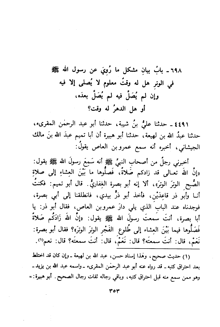 4491 - حَدَّثَنَا عَلِيُّ بْنُ شَيْبَةَ، حَدَّثَنَا أَبُو عَبْدِ الرَّحْمَنِ الْمُقْرِئُ، حَدَّثَنَا عَبْدُ اللهِ بْنُ لَهِيعَةَ، حَدَّثَنَا أَبُو هُبَيْرَةَ، أَنَّ أَبَا تَمِيمٍ عَبْدَ اللهِ بْنَ مَالِكٍ الْجَيْشَانِيَّ، أَخْبَرَهُ أَنَّهُ سَمِعَ عَمْرَو بْنَ الْعَاصِ يَقُولُ: أَخْبَرَنِي رَجُلٌ مِنْ أَصْحَابِ النَّبِيِّ صَلَّى اللَّهُ عَلَيْهِ وَسَلَّمَ أَنَّهُ سَمِعَ رَسُولَ اللهِ صَلَّى اللَّهُ عَلَيْهِ وَسَلَّمَ يَقُولُ: " إِنَّ اللهَ تَعَالَى قَدْ زَادَكُمْ صَلَاةً، فَصَلُّوهَا مَا بَيْنَ الْعِشَاءِ إِلَى صَلَاةِ الصُّبْحِ، الْوِتْرَ الْوِتْرَ " أَلَا إِنَّهُ أَبُو بَصْرَةَ الْغِفَارِيُّ. قَالَ أَبُو تَمِيمٍ: فَكُنْتُ أَنَا وَأَبُو ذَرٍّ قَاعِدَيْنِ، فَأَخَذَ أَبُو ذَرٍّ بِيَدِي، فَانْطَلَقْنَا إِلَى أَبِي بَصْرَةَ، فَوَجَدْنَاهُ عِنْدَ الْبَابِ الَّذِي يَلِي دَارَ عَمْرِو بْنِ الْعَاصِ، فَقَالَ أَبُو ذَرٍّ: يَا أَبَا بَصْرَةَ، أَنْتَ سَمِعْتَ رَسُولَ اللهِ صَلَّى اللَّهُ عَلَيْهِ وَسَلَّمَ يَقُولُ: " إِنَّ اللهَ زَادَكُمْ صَلَاةً فَصَلُّوهَا فِيمَا بَيْنَ الْعِشَاءِ إِلَى طُلُوعِ الْفَجْرِ، الْوِتْرَ الْوِتْرَ؟ " فَقَالَ أَبُو بَصْرَةَ: نَعَمْ، قَالَ: أَنْتَ سَمِعْتَهُ؟ قَالَ: نَعَمْ، قَالَ: أَنْتَ سَمِعْتَهُ؟ قَالَ: نَعَمْ -[354]- فَتَأَمَّلْنَا هَذَا الْحَدِيثَ، فَوَجَدْنَا فِيهِ مِمَّا حَكَاهُ عَمْرُو بْنُ الْعَاصِ عَنِ الرَّجُلِ الَّذِي حَكَاهُ عَنْهُ أَنَّهُ سَمِعَ رَسُولَ اللهِ صَلَّى اللَّهُ عَلَيْهِ وَسَلَّمَ يَقُولُ: " إِنَّ اللهَ عَزَّ وَجَلَّ قَدْ زَادَكُمْ صَلَاةً فَصَلُّوهَا مَا بَيْنَ الْعِشَاءِ إِلَى صَلَاةِ الصُّبْحِ، الْوِتْرَ الْوِتْرَ "، فَاحْتُمِلَ قَوْلُهُ: " إِلَى صَلَاةِ الصُّبْحِ " أَنْ يَكُونَ أَرَادَ بِذَلِكَ نَفْسَ الصَّلَاةِ، وَبَيْنَ الصَّلَاةِ وَبَيْنَ طُلُوعِ الْفَجْرِ مُدَّةٌ مِنَ الزَّمَانِ، وَاحْتَمَلَ أَنْ يَكُونَ ذَلِكَ إِلَى وَقْتِ صَلَاةِ الصُّبْحِ الَّذِي هُوَ بِعَقِبِ صَلَاةِ الْعِشَاءِ، ثُمَّ كَانَ مَا خَاطَبَ بِهِ أَبُو ذَرٍّ أَبَا بَصْرَةَ: أَنْتَ سَمِعْتَ رَسُولَ اللهِ صَلَّى اللَّهُ عَلَيْهِ وَسَلَّمَ يَقُولُ: " إِنَّ اللهَ قَدْ زَادَكُمْ صَلَاةً فَصَلُّوهَا فِيمَا بَيْنَ الْعِشَاءِ إِلَى طُلُوعِ الْفَجْرِ، الْوِتْرَ الْوِتْرَ "، وَكَانَ فِي ذَلِكَ مَا قَدْ كَشَفَ الْمَعْنَى الَّذِي احْتَمَلَ كُلُّ وَاحِدٍ مِنَ الْوَجْهَيْنِ الْأَوَّلَيْنِ، وَأَنَّهُ عَلَى طُلُوعِ الْفَجْرِ، لَا عَلَى نَفْسِ صَلَاةِ الصُّبْحِ، ثُمَّ نَظَرْنَا: هَلْ نَجْدُ هَذَا الْحَدِيثَ عَنْ عَبْدِ اللهِ بْنِ هُبَيْرَةَ مِنْ غَيْرِ هَذَا الْوَجْهِ الَّذِي جِئْنَا بِهِ مِنْهُ