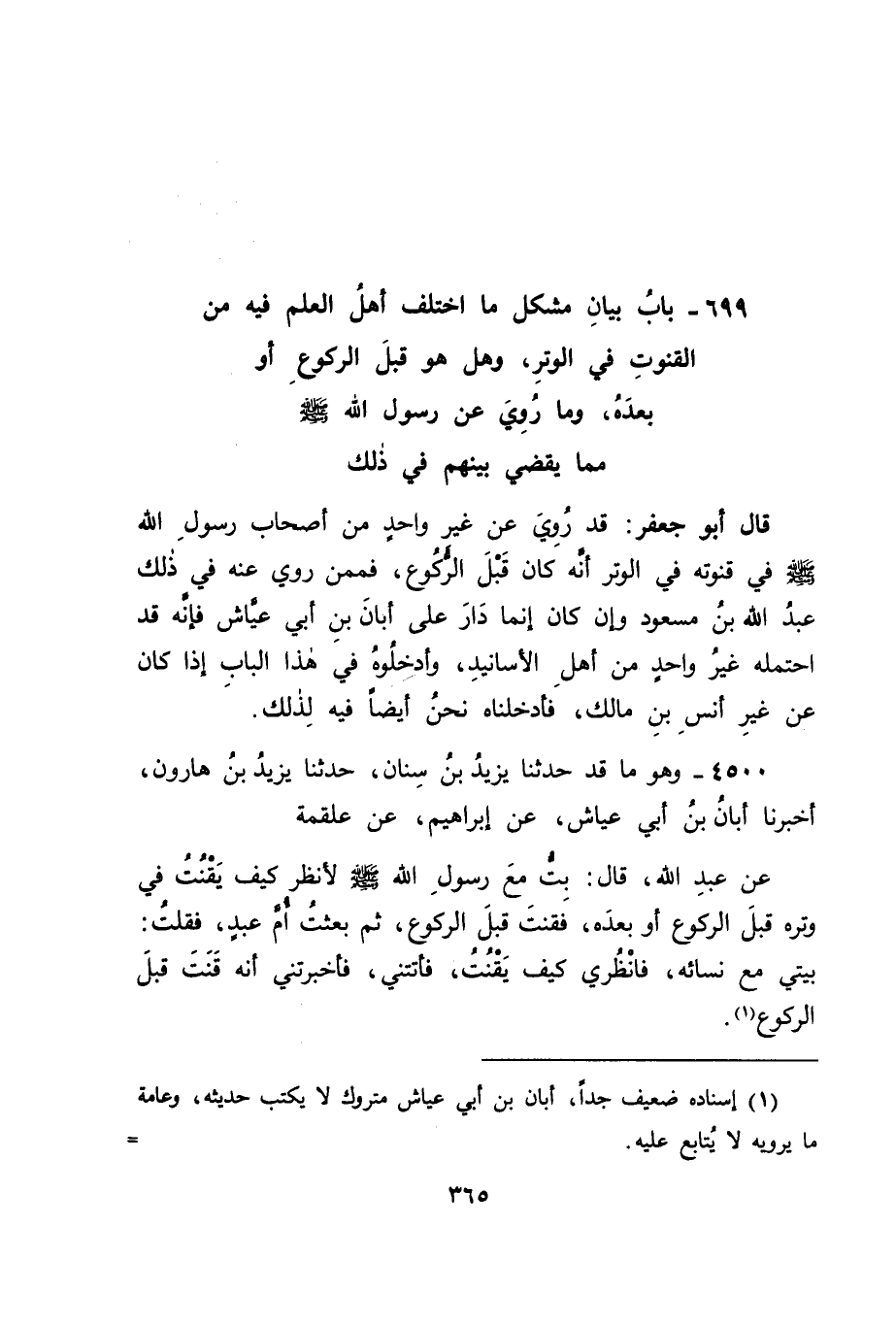 بَابُ بَيَانِ مُشْكِلِ مَا اخْتَلَفَ أَهْلُ الْعِلْمِ فِيهِ مِنَ الْقُنُوتِ فِي الْوِتْرِ، وَهَلْ هُوَ قَبْلَ الرُّكُوعِ أَوْ بَعْدَهُ؟ وَمَا رُوِيَ عَنْ رَسُولِ اللهِ صَلَّى اللَّهُ عَلَيْهِ وَسَلَّمَ مِمَّا يَقْضِي بَيْنَهُمْ فِي ذَلِكَ قَالَ أَبُو جَعْفَرٍ: قَدْ رُوِيَ عَنْ غَيْرِ وَاحِدٍ مِنْ أَصْحَابِ رَسُولِ اللهِ صَلَّى اللَّهُ عَلَيْهِ وَسَلَّمَ فِي قُنُوتِهِ فِي الْوِتْرِ أَنَّهُ كَانَ قَبْلَ الرُّكُوعِ، فَمِمَّنْ رُوِيَ عَنْهُ فِي ذَلِكَ عَبْدُ اللهِ بْنُ مَسْعُودٍ، وَإِنْ كَانَ إِنَّمَا دَارَ عَلَى أَبَانَ بْنِ أَبِي عَيَّاشٍ فَإِنَّهُ قَدِ احْتَمَلَهُ غَيْرُ وَاحِدٍ مِنْ أَهْلِ الْأَسَانِيدِ، وَأَدْخَلُوهُ فِي هَذَا الْبَابِ إِذَا كَانَ عَنْ غَيْرِ أَنَسِ بْنِ مَالِكٍ، فَأَدْخَلْنَاهُ نَحْنُ أَيْضًا فِيهِ لِذَلِكَ.