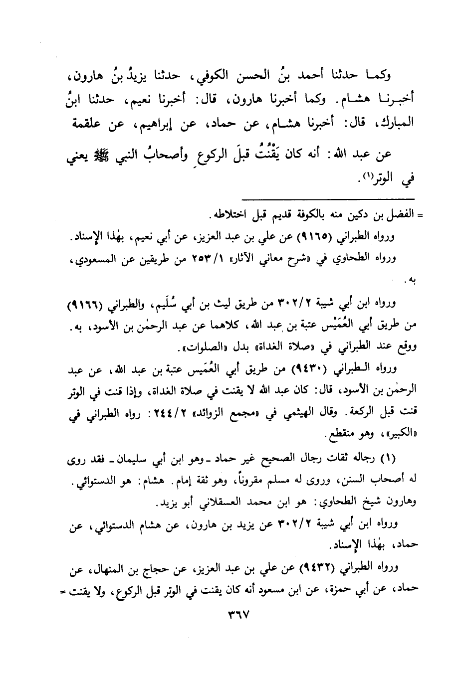 وَكَمَا حَدَّثَنَا أَحْمَدُ بْنُ الْحَسَنِ الْكُوفِيُّ، حَدَّثَنَا يَزِيدُ بْنُ هَارُونَ، أَخْبَرَنَا هِشَامٌ وَكَمَا أَخْبَرَنَا هَارُونُ، قَالَ: أَخْبَرَنَا نُعَيْمٌ، حَدَّثَنَا ابْنُ الْمُبَارَكِ، قَالَ: أَخْبَرَنَا هِشَامٌ، عَنْ حَمَّادٍ، عَنْ إِبْرَاهِيمَ، عَنْ عَلْقَمَةَ، عَنْ عَبْدِ اللهِ: " أَنَّهُ كَانَ يَقْنُتُ قَبْلَ الرُّكُوعِ وَأَصْحَابُ النَّبِيِّ صَلَّى اللَّهُ عَلَيْهِ وَسَلَّمَ، يَعْنِي فِي الْوِتْرِ " -[368]- وَقَدْ رُوِيَ هَذَا الْمَعْنَى أَيْضًا عَنْ أُبَيِّ بْنِ كَعْبٍ.