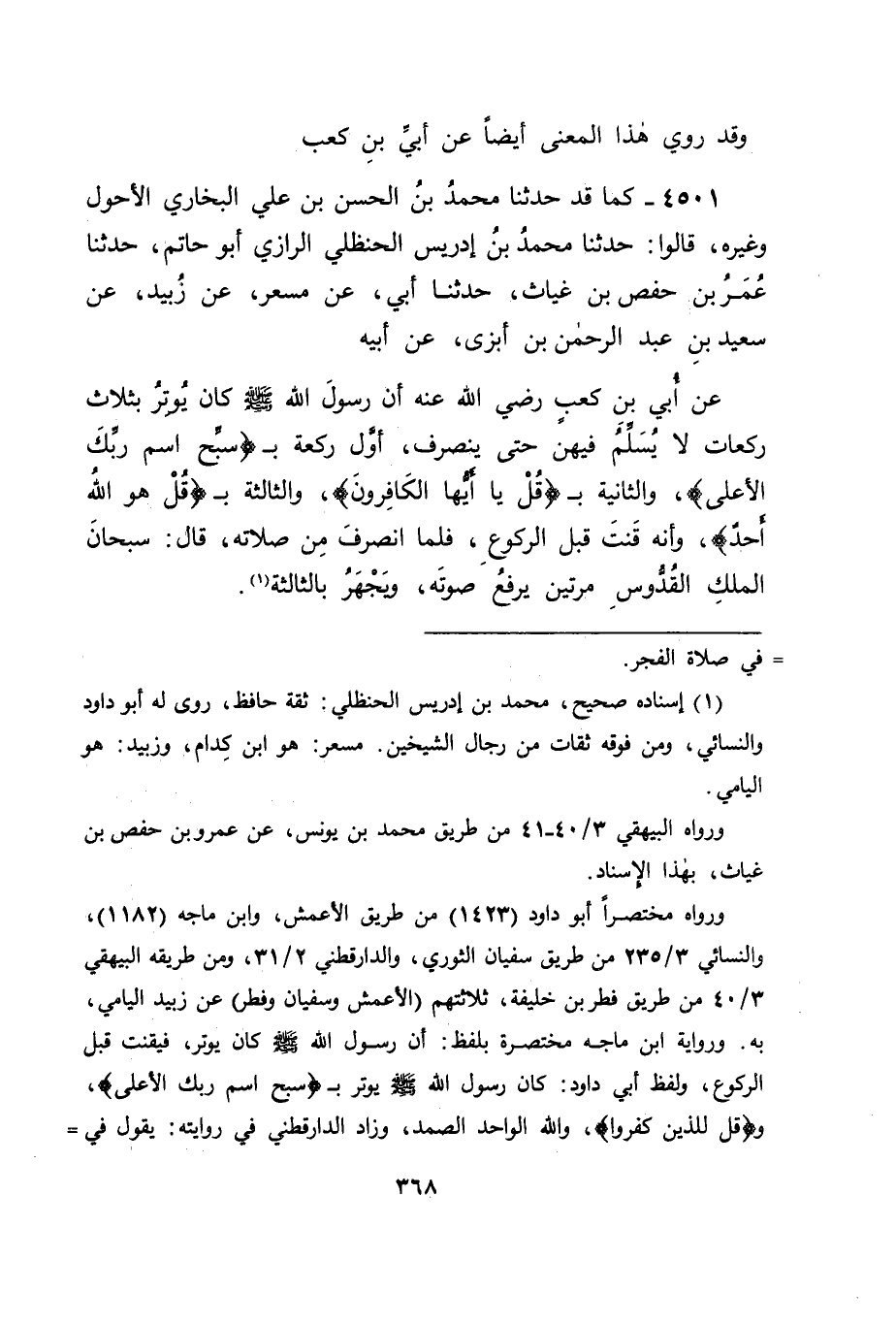 4501 - كَمَا قَدْ حَدَّثَنَا مُحَمَّدُ بْنُ الْحَسَنِ بْنِ عَلِيٍّ الْبُخَارِيُّ الْأَحْوَلُ وَغَيْرُهُ، قَالُوا: حَدَّثَنَا مُحَمَّدُ بْنُ إِدْرِيسَ الْحَنْظَلِيُّ الرَّازِيُّ أَبُو حَاتِمٍ، حَدَّثَنَا عُمَرُ بْنُ حَفْصِ بْنِ غِيَاثٍ، حَدَّثَنَا أَبِي، عَنْ مِسْعَرٍ، عَنْ زُبَيْدٍ، عَنْ سَعِيدِ بْنِ عَبْدِ الرَّحْمَنِ بْنِ أَبْزَى، عَنْ أَبِيهِ، عَنْ أُبَيِّ بْنِ كَعْبٍ، رَضِيَ اللهُ عَنْهُ أَنَّ رَسُولَ اللهِ صَلَّى اللَّهُ عَلَيْهِ وَسَلَّمَ كَانَ يُوتِرُ ثَلَاثَ رَكَعَاتٍ لَا يُسَلِّمُ فِيهِنَّ حَتَّى يَنْصَرِفَ، أَوَّلُ رَكْعَةٍ بِ سَبِّحِ اسْمَ رَبِّكَ الْأَعْلَى، وَالثَّانِيَةُ بِ قُلْ يَا أَيُّهَا الْكَافِرُونَ، وَالثَّالِثَةُ بِ قُلْ هُوَ اللهُ أَحَدٌ، وَأَنَّهُ قَنَتَ قَبْلَ الرُّكُوعِ، فَلَمَّا انْصَرَفَ مِنْ صَلَاتِهِ، قَالَ: " سُبْحَانَ الْمَلِكِ الْقُدُّوسِ، مَرَّتَيْنِ يَرْفَعُ صَوْتَهُ، وَيَجْهَرُ بِالثَّالِثَةِ " -[369]- وَمِنْهُمْ: عَبْدُ اللهِ بْنُ عَبَّاسٍ.