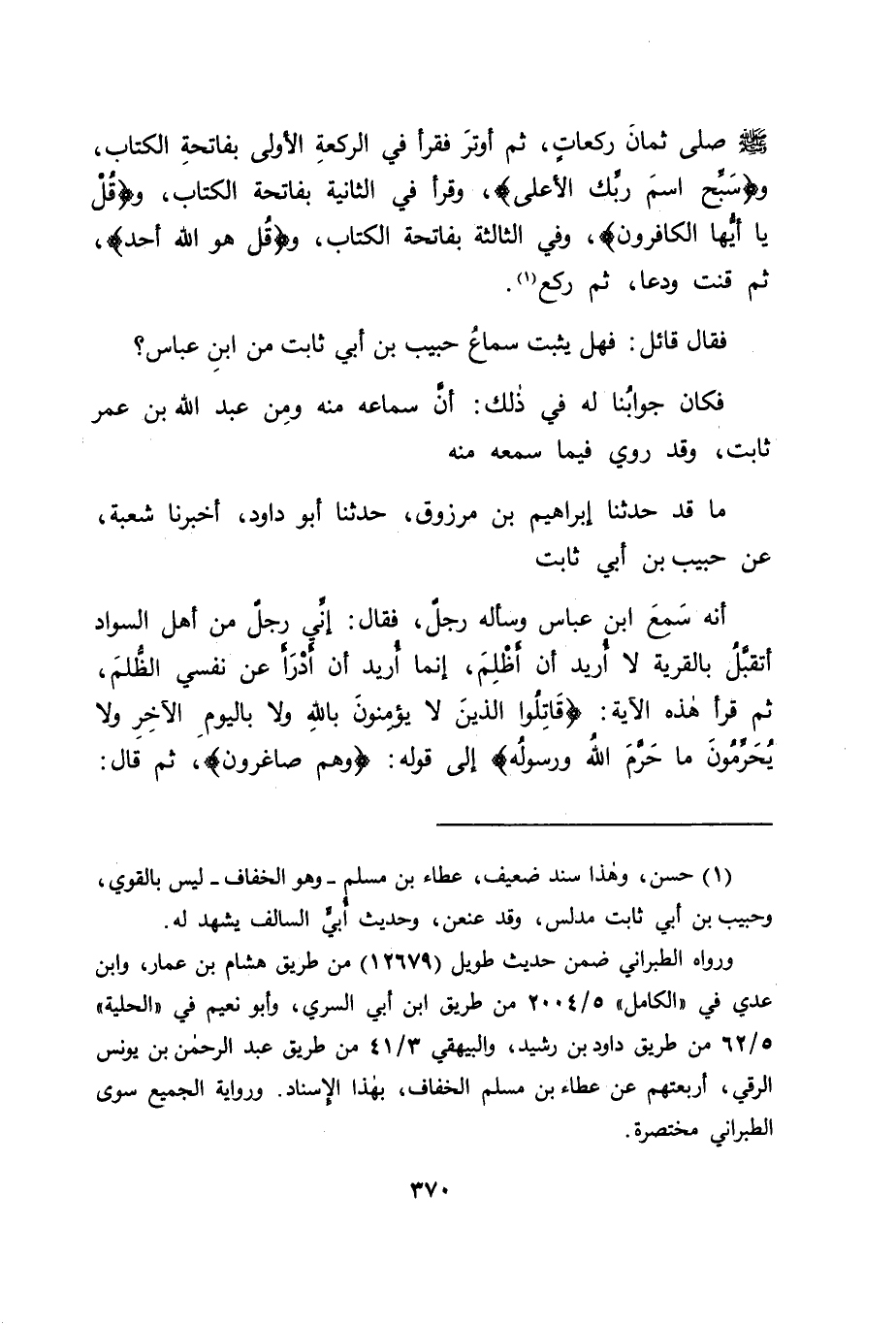 مَا قَدْ حَدَّثَنَا إِبْرَاهِيمُ بْنُ مَرْزُوقٍ، حَدَّثَنَا أَبُو دَاوُدَ، أَخْبَرَنَا شُعْبَةُ، عَنْ حَبِيبِ بْنِ أَبِي ثَابِتٍ أَنَّهُ سَمِعَ ابْنَ عَبَّاسٍ وَسَأَلَهُ رَجُلٌ، فَقَالَ: إِنِّي رَجُلٌ مِنْ أَهْلِ السَّوَادِ، أَتَقَبَّلُ بِالْقَرْيَةِ لَا أُرِيدُ أَنْ أَظْلِمَ، إِنَّمَا أُرِيدُ أَنْ أَدْرَأَ عَنْ نَفْسِيَ الظُّلْمَ، ثُمَّ قَرَأَ هَذِهِ الْآيَةَ: {قَاتِلُوا الَّذِينَ لَا يُؤْمِنُونَ بِاللهِ وَلَا بِالْيَوْمِ الْآخِرِ وَلَا يُحَرِّمُونَ مَا حَرَّمَ اللهُ وَرَسُولُهُ} [التوبة: 29] ، إِلَى قَوْلِهِ: {وَهُمْ صَاغِرُونَ} [التوبة: 29] ، ثُمَّ قَالَ: " -[371]- يَنْزِعُ الصَّغَارَ مِنْ أَعْنَاقِهِمْ، وَيَضَعُهُ فِي عُنُقِكَ " قَالَ أَبُو جَعْفَرٍ: ثُمَّ عُدْنَا إِلَى حَدِيثِ أُبَيٍّ، وَهَلْ نَجِدُهُ مِنْ غَيْرِ حَدِيثِ مِسْعَرٍ، كَمَا رَوَاهُ حَفْصٌ عَنْ مِسْعَرٍ؟