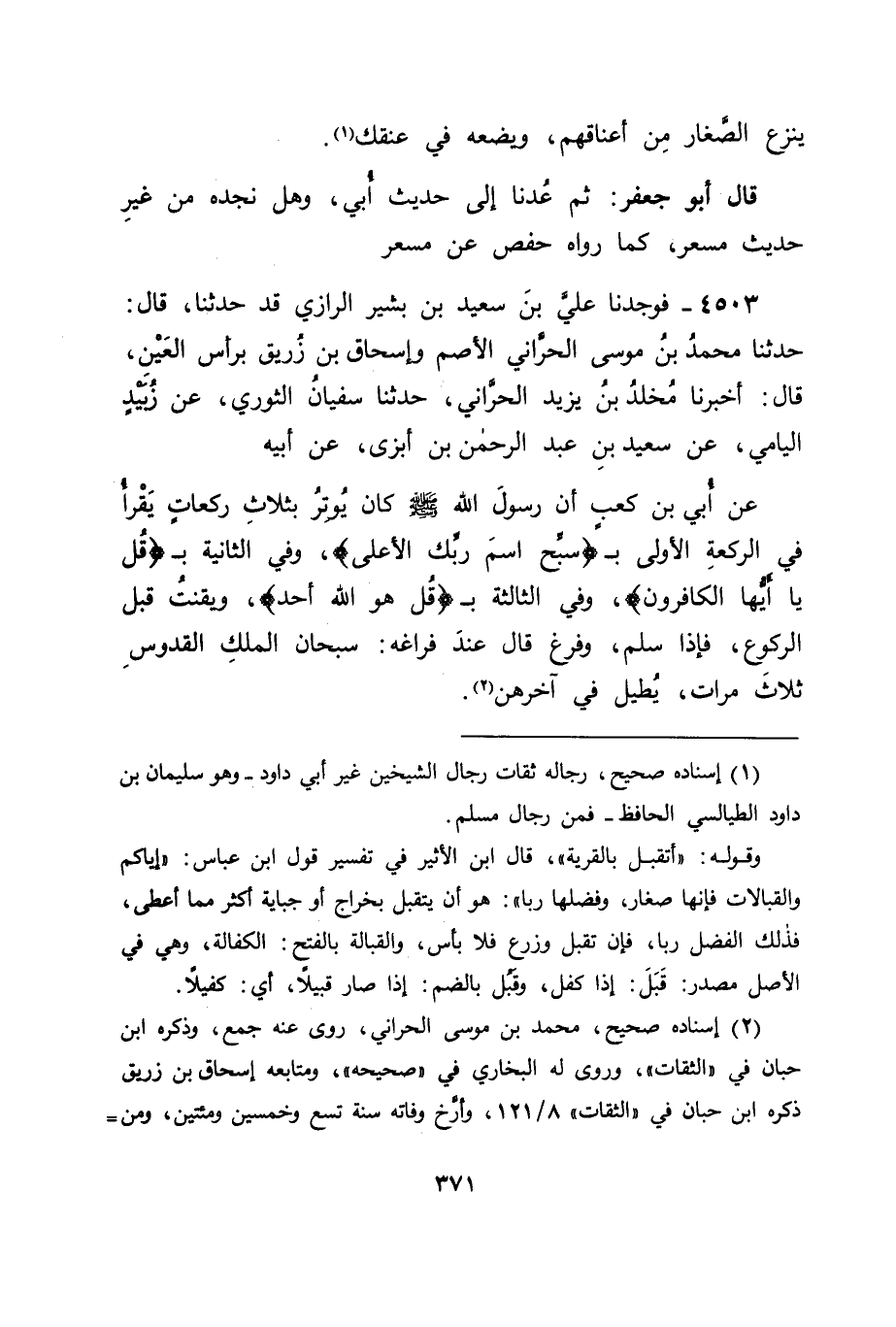 4503 - فَوَجَدْنَا عَلِيَّ بْنَ سَعِيدِ بْنِ بَشِيرٍ الرَّازِيَّ قَدْ حَدَّثَنَا، قَالَ: حَدَّثَنَا مُحَمَّدُ بْنُ مُوسَى الْحَرَّانِيُّ الْأَصَمُّ، وَإِسْحَاقُ بْنُ زُرَيْقٍ بِرَأْسِ الْعَيْنِ، قَالَ: أَخْبَرَنَا مَخْلَدُ بْنُ يَزِيدَ الْحَرَّانِيُّ، حَدَّثَنَا سُفْيَانُ الثَّوْرِيُّ، عَنْ زُبَيْدٍ الْيَامِيِّ، عَنْ سَعِيدِ بْنِ عَبْدِ الرَّحْمَنِ بْنِ أَبْزَى، عَنْ أَبِيهِ، عَنْ أُبَيِّ بْنِ كَعْبٍ: " أَنَّ رَسُولَ اللهِ صَلَّى اللَّهُ عَلَيْهِ وَسَلَّمَ كَانَ يُوتِرُ بِثَلَاثِ رَكَعَاتٍ يَقْرَأُ فِي الرَّكْعَةِ الْأُولَى بِ سَبِّحِ اسْمَ رَبِّكَ الْأَعْلَى، وَفِي الثَّانِيَةِ بِ قُلْ يَا أَيُّهَا الْكَافِرُونَ، وَفِي الثَّالِثَةِ بِ قُلْ هُوَ اللهُ أَحَدٌ، وَيَقْنُتُ قَبْلَ الرُّكُوعِ، فَإِذَا سَلَّمَ وَفَرَغَ قَالَ عِنْدَ فَرَاغِهِ: " سُبْحَانَ الْمَلِكِ الْقُدُّوسِ " ثَلَاثَ مَرَّاتٍ، يُطِيلُ فِي آخِرِهِنَّ "
