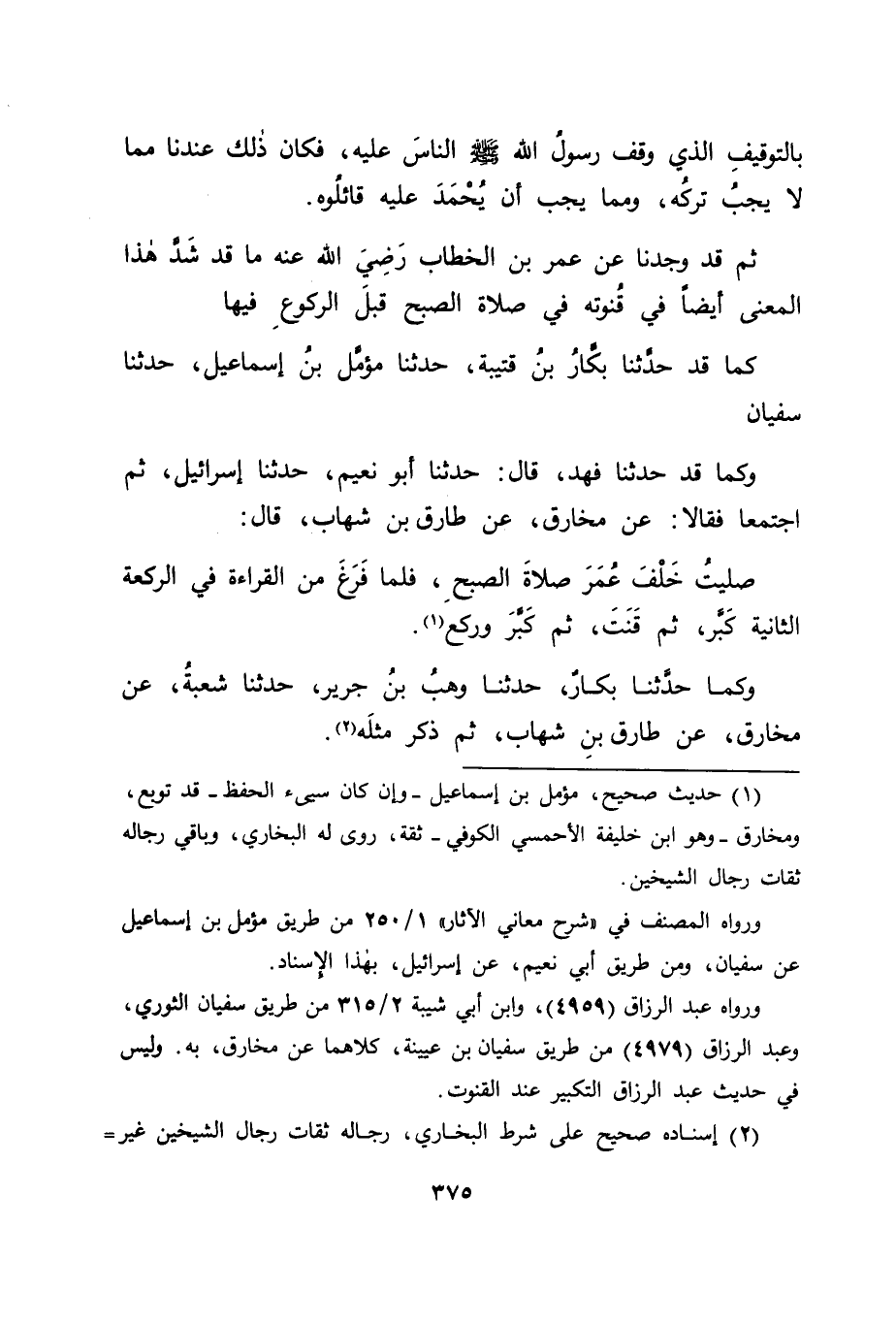 كَمَا قَدْ حَدَّثَنَا بَكَّارُ بْنُ قُتَيْبَةَ، حَدَّثَنَا مُؤَمَّلُ بْنُ إِسْمَاعِيلَ، حَدَّثَنَا سُفْيَانُ وَكَمَا قَدْ حَدَّثَنَا فَهْدٌ، قَالَ: حَدَّثَنَا أَبُو نُعَيْمٍ، حَدَّثَنَا إِسْرَائِيلُ، ثُمَّ اجْتَمَعَا فَقَالَا: عَنْ مُخَارِقٍ، عَنْ طَارِقِ بْنِ شِهَابٍ، قَالَ: " صَلَّيْتُ خَلْفَ عُمَرَ صَلَاةَ الصُّبْحِ، فَلَمَّا فَرَغَ مِنَ الْقِرَاءَةِ فِي الرَّكْعَةِ الثَّانِيَةِ كَبَّرَ، ثُمَّ قَنَتَ، ثُمَّ كَبَّرَ وَرَكَعَ "، وَكَمَا حَدَّثَنَا بَكَّارٌ، حَدَّثَنَا وَهْبُ بْنُ جَرِيرٍ، حَدَّثَنَا شُعْبَةُ، عَنْ مُخَارِقٍ، عَنْ طَارِقِ بْنِ شِهَابٍ ثُمَّ ذَكَرَ مِثْلَهُ -[376]- قَالَ أَبُو جَعْفَرٍ: فَهَذَا عُمَرُ أَيْضًا قَدْ كَبَّرَ لِلْقُنُوتِ قَبْلَ الرُّكُوعِ، فَشَدَّ ذَلِكَ مَا قَدْ رُوِّينَاهُ قَبْلَهُ عَنْ عَلِيٍّ، وَعَبْدِ اللهِ، وَكَانَ هَذَا مِمَّا يَجِبُ أَنْ يُحْمَدَ عَلَيْهِ قَائِلُوهُ. فَقَالَ قَائِلٌ: فَقَدْ رَوَى الْحَسَنُ بْنُ عَلِيٍّ فِي حَدِيثِ ابْنِ أَبِي فُدَيْكٍ الَّذِي رَوَاهُ عَنْ إِسْمَاعِيلَ بْنِ إِبْرَاهِيمَ بْنِ عُقْبَةَ، عَنْ عَمِّهِ، عَنْ هِشَامِ بْنِ عُرْوَةَ، عَنْ أَبِيهِ، عَنْ عَائِشَةَ رَضِيَ اللهُ عَنْهَا، قَالَتْ: " عَلَّمَنِي الْحَسَنُ بْنُ عَلِيٍّ أَنَّ رَسُولَ اللهِ صَلَّى اللَّهُ عَلَيْهِ وَسَلَّمَ كَانَ إِذَا فَرَغَ مِنَ الْقِرَاءَةِ فِي الرَّكْعَةِ الثَّالِثَةِ مِنَ الْوِتْرِ، وَلَمْ يَبْقَ إِلَّا الرُّكُوعُ، قَالَ قَبْلَ أَنْ يَرْكَعَ: " اللهُمَّ اهْدِنِي فِيمَنْ هَدَيْتَ " فَذَكَرَ تَمَامَ الْحَدِيثِ. قَالَ: فَفِي ذَلِكَ مَا قَدْ دَلَّ عَلَى أَنَّهُ لَمْ يَكُنْ -[377]- يَفْصِلُ -[378]- بَيْنَ الْقِرَاءَةِ وَبَيْنَ الْقُنُوتِ بِتَكْبِيرٍ وَلَا بِغَيْرِهِ. فَكَانَ جَوَابَنَا لَهُ فِي ذَلِكَ: أَنَّ الَّذِيَ قَدْ ذَكَرْنَاهُ عَنْ عَلِيٍّ، وَعَبْدِ اللهِ، وَشَدَّهُ مَا رُوِّينَاهُ بَعْدَهُ عَنْ عُمَرَ، لَمَّا كَانَ لَمْ يُقَلِ اسْتِنْبَاطًا وَلَا وَاسْتِخْرَاجًا قَدْ صَارَ فِي حُكْمِ الْمَحْكِيِّ عَنْ رَسُولِ اللهِ صَلَّى اللَّهُ عَلَيْهِ وَسَلَّمَ، وَمَنْ حَكَى شَيْئًا حَفِظَهُ كَانَ أَوْلَى مِمَّنْ قَصُرَ عَنْهُ. وَاللهَ نَسْأَلُهُ التَّوْفِيقَ.