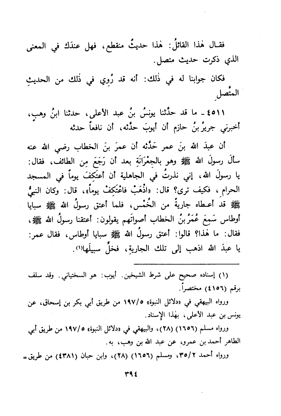 4511 - مَا قَدْ حَدَّثَنَا يُونُسُ بْنُ عَبْدِ الْأَعْلَى، حَدَّثَنَا ابْنُ وَهْبٍ، أَخْبَرَنِي جَرِيرُ بْنُ حَازِمٍ، أَنَّ أَيُّوبَ، حَدَّثَهُ أَنَّ نَافِعًا حَدَّثَهُ أَنَّ عَبْدَ اللهِ بْنَ عُمَرَ حَدَّثَهُ: أَنَّ عُمَرَ بْنَ الْخَطَّابِ رَضِيَ اللهُ عَنْهُ سَأَلَ رَسُولَ اللهِ صَلَّى اللَّهُ عَلَيْهِ وَسَلَّمَ وَهُوَ بِالْجِعْرَانَةِ بَعْدَ أَنْ رَجَعَ مِنَ الطَّائِفِ، فَقَالَ: يَا رَسُولَ اللهِ، إِنِّي نَذَرْتُ فِي الْجَاهِلِيَّةِ أَنْ أَعْتَكِفَ يَوْمًا فِي الْمَسْجِدِ الْحَرَامِ، فَكَيْفَ تَرَى؟ قَالَ: " اذْهَبْ فَاعْتَكِفْ يَوْمًا " قَالَ: وَكَانَ النَّبِيُّ صَلَّى اللَّهُ عَلَيْهِ وَسَلَّمَ قَدْ أَعْطَاهُ جَارِيَةً مِنَ الْخُمُسِ، فَلَمَّا أَعْتَقَ رَسُولُ اللهِ صَلَّى اللَّهُ عَلَيْهِ وَسَلَّمَ سَبَايَا أَوْطَاسٍ سَمِعَ عُمَرُ بْنُ الْخَطَّابِ أَصْوَاتَهُمْ يَقُولُونَ: أَعْتَقَنَا رَسُولُ اللهِ صَلَّى اللَّهُ عَلَيْهِ وَسَلَّمَ، فَقَالَ: مَا هَذَا؟ قَالُوا: أَعْتَقَ رَسُولُ اللهِ صَلَّى اللَّهُ عَلَيْهِ وَسَلَّمَ سَبَايَا أَوْطَاسٍ، فَقَالَ عُمَرُ: يَا عَبْدَ اللهِ، اذْهَبْ إِلَى تِلْكَ الْجَارِيَةِ، فَخَلِّ سَبِيلَهَا -[395]- قَالَ أَبُو جَعْفَرٍ: وَهَذَا الْحَدِيثُ، فَفِي سَبْيِ هَوَازِنَ وَإِنَّ ذَلِكَ لَمْ يُذْكَرْ فِي هَذَا الْحَدِيثِ؛ لِأَنَّ ذَلِكَ إِنَّمَا كَانَ بِالْجِعْرَانَةِ، وَكَانَتِ الْجِعْرَانَةُ فِي سَنَةِ ثَمَانٍ مِنَ الْهِجْرَةِ، وَفِيهَا كَانَتْ غَزْوَةُ هَوَازِنَ، وَقَدْ دَلَّ عَلَى مَا ذَكَرْنَا مِنْ هَذَا الْمَعْنَى:
