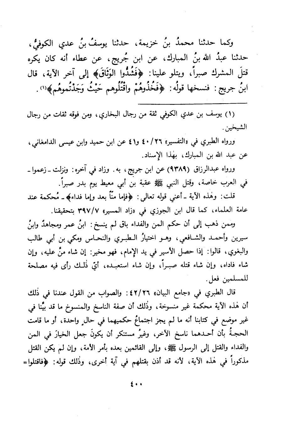 وَكَمَا حَدَّثَنَا مُحَمَّدُ بْنُ خُزَيْمَةَ، حَدَّثَنَا يُوسُفُ بْنُ عَدِيٍّ الْكُوفِيُّ، حَدَّثَنَا عَبْدُ اللهِ بْنُ الْمُبَارَكِ، عَنِ ابْنِ جُرَيْجٍ، عَنْ عَطَاءٍ: " أَنَّهُ كَانَ يَكْرَهُ قَتْلَ الْمُشْرِكِ صَبْرًا، وَيَتْلُو عَلَيْنَا: {فَشُدُّوا الْوَثَاقَ} [محمد: 4] إِلَى آخِرِ الْآيَةِ، قَالَ ابْنُ جُرَيْجٍ: فَنَسَخَهَا قَوْلُهُ: {فَخُذُوهُمْ وَاقْتُلُوهُمْ حَيْثُ وَجَدْتُمُوهُمْ} [النساء: 89] " -[401]- قَالَ أَبُو جَعْفَرٍ: فَتَأَمَّلْنَا مَا قَالَ عَطَاءٌ مِمَّا ذَكَرْنَاهُ عَنْهُ، فَوَجَدْنَا اللهَ قَدْ ذَكَرَ هَذَا الْمَعْنَى فِي مَوْضِعَيْنِ مِنْ كِتَابِهِ، أَحَدُهُمَا: الْمَوْضِعُ الْمَذْكُورُ فِي حَدِيثِهِ، وَالْآخَرُ الْمَذْكُورُ فِي سُورَةِ الْأَنْفَالِ، وَهُوَ قَوْلُهُ عَزَّ وَجَلَّ: (مَا كَانَ لِنَبِيٍّ أَنْ تَكُونَ لَهُ أَسْرَى حَتَّى يُثْخِنَ فِي الْأَرْضِ تُرِيدُونَ عَرَضَ الدُّنْيَا وَاللهُ يُرِيدُ الْآخِرَةَ وَاللهُ عَزِيزٌ حَكِيمٌ) ، إِلَى قَوْلِهِ: {عَذَابٌ عَظِيمٌ} [الأنفال: 68] ، فَكَانَ فِي هَذِهِ الْآيَةِ إِعْلَامُ اللهِ رَسُولَهُ وَالْمُؤْمِنِينَ أَنَّهُ لَا يَنْبَغِي لِنَبِيٍّ أَنْ تَكُونَ لَهُ أَسْرَى مِنَ الْمُشْرِكِينَ حَتَّى يُثْخِنَ الْقَتْلَ فِيهِمْ، وَمَعْقُولٌ أَنَّ الْقَتْلَ فِيهِمْ بِمَا فِي هَذِهِ الْآيَةِ أَوْلَى مِنَ الْأَسْرِ لَهُمْ، وَفِي ذَلِكَ مَا قَدْ دَلَّ عَلَى إِطْلَاقِهِ لَهُمْ قَتْلَهُمْ، وَاسْتِعْمَالُ الَّذِي هُوَ أَوْلَى بِهِمْ مِنَ الْأَسْرِ الَّذِي هُمْ فِيهِ، وَهَذَا فَقَدْ دَلَّ عَلَى إِبَاحَةِ قَتْلِ الْأَسْرَى لَا عَلَى الْمَنْعِ مِنْ قَتْلِهِمْ، وَكَانَتِ الْآيَةُ الَّتِي تَلَاهَا عَطَاءٌ فِي حَدِيثِهِ كَانَ نُزُولُهَا بَعْدَ -[402]- إِحْلَالِ اللهِ لَهُمُ الْغَنَائِمَ الَّتِي قَدْ كَانَتْ قَبْلَ ذَلِكَ حَرَامًا عَلَيْهِمْ، أَلَا تَرَاهُ عَزَّ وَجَلَّ يَقُولُ: {تُرِيدُونَ عَرَضَ الدُّنْيَا} [الأنفال: 67] أَيْ: مَنَافِعَهَا بِالْأَسْرِ الَّذِي فَعَلْتُمُوهُ حَتَّى تَأْخُذُوا الْفِدَاءَ مِمَّنْ أَسَرْتُمُوهُ، {وَاللهُ يُرِيدُ الْآخِرَةَ، وَاللهُ عَزِيزٌ حَكِيمٌ} [الأنفال: 67] ، ثُمَّ أَتْبَعَ ذَلِكَ بِالْوَعِيدِ الَّذِي أَتْبَعَهُ بِهِ مِنْ قَوْلِهِ: {لَوْلَا كِتَابٌ مِنَ اللهِ سَبَقَ لَمَسَّكُمْ فِيمَا أَخَذْتُمْ عَذَابٌ عَظِيمٌ} [الأنفال: 68] ، وَقَدْ ذَكَرْنَا ذَلِكَ وَمَا قَدْ رُوِيَ فِيهِ، وَمَا قَدْ تَأَوَّلَ عَلَيْهِ فِيمَا تَقَدَّمَ مِنَّا فِي كِتَابِنَا هَذَا، وَكَانَ الْأَخْذُ الْمُرَادُ فِي ذَلِكَ، وَاللهُ أَعْلَمُ، هُوَ الْأَسْرُ الَّذِي يَكُونُ سَبَبًا لِذَلِكَ، وَلَمْ نَكُنْ بَيِّنًا ذَلِكَ هَذَا الْبَيَانَ فِي ذَلِكَ الْمَوْضِعِ مِنْ كِتَابِنَا هَذَا فِي كِتَابِنَا هَذَا، فَذَكَرْنَاهُ هَاهُنَا لِنَقِفَ عَلَيْهِ. وَقَدْ رُوِيَ عَنْ رَسُولِ اللهِ صَلَّى اللَّهُ عَلَيْهِ وَسَلَّمَ فِي قَتْلِ الْأَسْرَى: