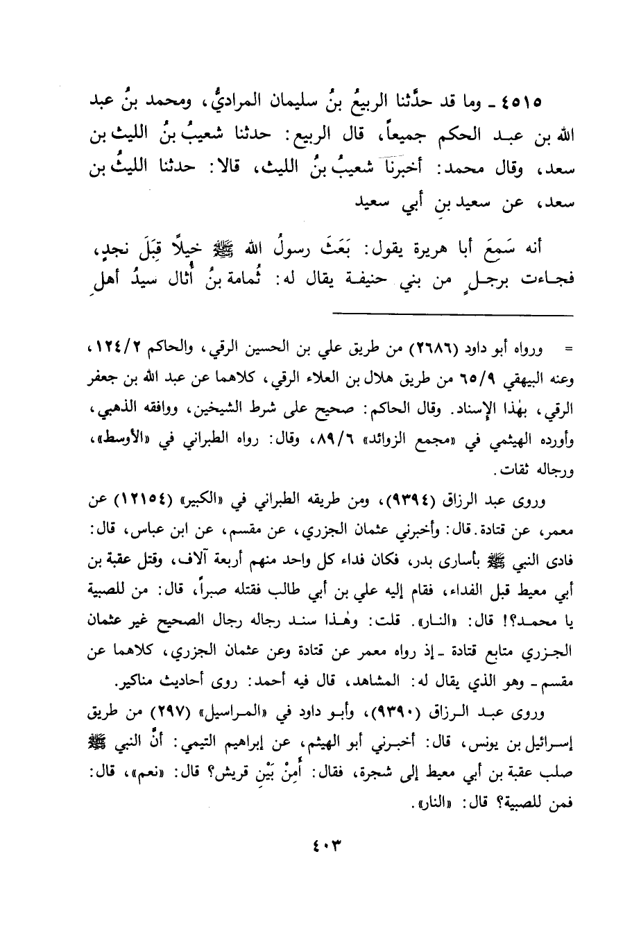 4515 - وَمَا قَدْ حَدَّثَنَا الرَّبِيعُ بْنُ سُلَيْمَانَ الْمُرَادِيُّ، وَمُحَمَّدُ بْنُ عَبْدِ اللهِ بْنِ عَبْدِ الْحَكَمِ، جَمِيعًا، قَالَ الرَّبِيعُ: حَدَّثَنَا شُعَيْبُ بْنُ اللَّيْثِ بْنِ سَعْدٍ، وَقَالَ مُحَمَّدٌ: أَخْبَرَنَا شُعَيْبُ بْنُ اللَّيْثِ، قَالَا: حَدَّثَنَا اللَّيْثُ بْنُ سَعْدٍ، عَنْ سَعِيدِ بْنِ أَبِي سَعِيدٍ، أَنَّهُ سَمِعَ أَبَا هُرَيْرَةَ، يَقُولُ: بَعَثَ رَسُولُ اللهِ صَلَّى اللَّهُ عَلَيْهِ وَسَلَّمَ خَيْلًا قِبَلَ نَجْدٍ، فَجَاءَتْ بِرَجُلٍ مِنْ بَنِي حَنِيفَةَ يُقَالُ لَهُ ثُمَامَةُ بْنُ أُثَالٍ سَيِّدُ أَهْلِ -[404]- الْيَمَامَةِ، فَرَبَطُوهُ بِسَارِيَةٍ مِنْ سَوَارِي الْمَسْجِدِ، فَخَرَجَ إِلَيْهِ رَسُولُ اللهِ صَلَّى اللَّهُ عَلَيْهِ وَسَلَّمَ، فَقَالَ: " مَا عِنْدَكَ يَا ثُمَامَةُ؟ " قَالَ: عِنْدِي يَا رَسُولَ اللهِ خَيْرٌ، إِنْ تَقْتُلْ تَقْتُلْ ذَا دَمٍ، وَإِنْ تُنْعِمْ تُنْعِمْ عَلَى شَاكِرٍ، وَإِنْ تُرِدِ الْمَالَ فَسَلْ تُعْطَ مِنْهُ مَا شِئْتَ، فَتَرَكَهُ رَسُولُ اللهِ صَلَّى اللَّهُ عَلَيْهِ وَسَلَّمَ حَتَّى كَانَ الْغَدُ، فَقَالَ: " مَا عِنْدَكَ يَا ثُمَامَةُ؟ " قَالَ: عِنْدِي مَا قُلْتُ لَكَ، ثُمَّ أَعَادَ مِثْلَ كَلَامِهِ الْأَوَّلِ، فَتَرَكَهُ رَسُولُ اللهِ صَلَّى اللَّهُ عَلَيْهِ وَسَلَّمَ حَتَّى كَانَ بَعْدَ الْغَدِ، قَالَ: " مَا عِنْدَكَ يَا ثُمَامَةُ؟ " قَالَ: عِنْدِي مَا قُلْتُ لَكَ، ثُمَّ أَعَادَ مِثْلَ كَلَامِهِ الْأَوَّلِ، فَقَالَ رَسُولُ اللهِ صَلَّى اللَّهُ عَلَيْهِ وَسَلَّمَ: " أَطْلِقُوا ثُمَامَةَ " فَانْطَلَقَ إِلَى نَخْلٍ قَرِيبٍ مِنَ الْمَسْجِدِ فَاغْتَسَلَ، ثُمَّ دَخَلَ الْمَسْجِدَ، فَقَالَ: أَشْهَدُ أَنْ لَا إِلَهَ إِلَّا اللهُ، وَأَنَّ مُحَمَّدًا رَسُولُ اللهِ، يَا مُحَمَّدُ، مَا كَانَ عَلَى الْأَرْضِ وَجْهٌ أَبْغَضَ إِلَيَّ مِنْ وَجْهِكَ، فَقَدْ أَصْبَحَ وَجْهُكَ أَحَبَّ الْوُجُوهِ كُلِّهَا إِلَيَّ، وَاللهِ مَا كَانَ دِينٌ أَبْغَضَ إِلَيَّ مِنْ دِينِكَ، فَأَصْبَحَ دِينُكَ أَحَبَّ الدِّينِ إِلَيَّ، وَاللهِ مَا كَانَ بَلَدٌ أَبْغَضَ إِلَيَّ مِنْ بَلَدِكَ، فَأَصْبَحَ أَحَبَّ الْبِلَادِ إِلَيَّ، وَإِنَّ خَيْلَكَ أَخَذَتْنِي وَأَنَا أُرِيدُ الْعُمْرَةَ، فَمَاذَا تَرَى؟ فَبَشَّرَهُ رَسُولُ اللهِ صَلَّى اللَّهُ عَلَيْهِ وَسَلَّمَ، وَأَمَرَهُ أَنْ يَعْتَمِرَ، فَلَمَّا قَدِمَ مَكَّةَ، قَالَ لَهُ قَائِلٌ: أَصَبَوْتَ يَا ثُمَامَةُ؟ قَالَ: لَا، وَلَكِنْ أَسْلَمْتُ مَعَ مُحَمَّدٍ رَسُولِ اللهِ، وَوَاللهِ لَا يَأْتِيكُمْ مِنَ الْيَمَامَةِ حَبَّةُ حِنْطَةٍ حَتَّى يَأْذَنَ فِيهَا رَسُولُ اللهِ صَلَّى اللَّهُ عَلَيْهِ وَسَلَّمَ -[405]-
