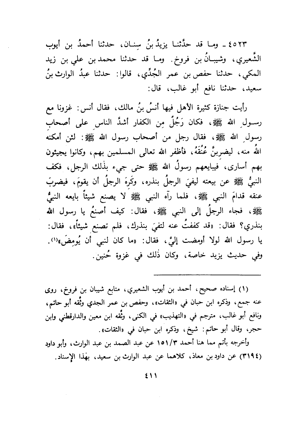 4523 - وَمَا قَدْ حَدَّثَنَا يَزِيدُ بْنُ سِنَانٍ، حَدَّثَنَا أَحْمَدُ بْنُ أَيُّوبَ الشَّعِيرِيُّ، وَشَيْبَانُ بْنُ فَرُّوخٍ وَمَا قَدْ حَدَّثَنَا مُحَمَّدُ بْنُ عَلِيِّ بْنِ زَيْدٍ الْمَكِّيُّ، حَدَّثَنَا حَفْصُ بْنُ عُمَرَ الْجُدِّيُّ، قَالُوا: حَدَّثَنَا عَبْدُ الْوَارِثِ بْنُ سَعِيدٍ، حَدَّثَنَا نَافِعٌ أَبُو غَالِبٍ، قَالَ: رَأَيْتُ جَنَازَةً كَثِيرَةَ الْأَهْلِ، فِيهَا أَنَسُ بْنُ مَالِكٍ، فَقَالَ أَنَسٌ: غَزَوْنَا مَعَ رَسُولِ اللهِ صَلَّى اللَّهُ عَلَيْهِ وَسَلَّمَ، فَكَانَ رَجُلٌ مِنَ الْكُفَّارِ أَشَدَّ النَّاسِ عَلَى أَصْحَابِ رَسُولِ اللهِ صَلَّى اللَّهُ عَلَيْهِ وَسَلَّمَ، فَقَالَ رَجُلٌ مِنْ أَصْحَابِ رَسُولِ اللهِ صَلَّى اللَّهُ عَلَيْهِ وَسَلَّمَ: لَئِنْ أَمْكَنَهُ اللهُ مِنْهُ لَيَضْرِبَنَّ عُنُقَهُ، فَأَظْفَرَ اللهُ تَعَالَى الْمُسْلِمِينَ بِهِمْ، وَكَانُوا يَجِيئُونَ بِهِمْ أُسَارَى فَيُبَايِعُهُمْ رَسُولُ اللهِ صَلَّى اللَّهُ عَلَيْهِ وَسَلَّمَ حَتَّى جِيءَ بِذَلِكَ الرَّجُلِ، فَكَفَّ النَّبِيُّ صَلَّى اللَّهُ عَلَيْهِ وَسَلَّمَ عَنْ بَيْعَتِهِ لِيَفِيَ الرَّجُلُ بِنَذْرِهِ، وَكَرِهَ الرَّجُلُ أَنْ يَقُومَ فَيَضْرِبَ عُنُقَهُ قُدَّامَ النَّبِيِّ صَلَّى اللَّهُ عَلَيْهِ وَسَلَّمَ، فَلَمَّا رَآهُ النَّبِيُّ صَلَّى اللَّهُ عَلَيْهِ وَسَلَّمَ لَا يَصْنَعُ شَيْئًا بَايَعَهُ النَّبِيُّ صَلَّى اللَّهُ عَلَيْهِ وَسَلَّمَ، فَجَاءَ الرَّجُلُ إِلَى النَّبِيِّ صَلَّى اللَّهُ عَلَيْهِ وَسَلَّمَ، فَقَالَ: كَيْفَ أَصْنَعُ يَا رَسُولَ اللهِ بِنَذْرِي؟ فَقَالَ: " قَدْ كَفَفْتُ عَنْهُ لِتَفِيَ بِنَذْرِكَ، فَلَمْ تَصْنَعْ شَيْئًا " فَقَالَ: يَا رَسُولَ اللهِ لَوْلَا أَوْمَضْتَ إِلَيَّ؟ فَقَالَ: " مَا كَانَ لِنَبِيٍّ أَنْ يُومِضَ " وَفِي حَدِيثِ يَزِيدَ خَاصَّةً: وَكَانَ ذَلِكَ فِي غَزْوَةِ حُنَيْنٍ -[412]- فَفِي هَذَا الْحَدِيثِ أَيْضًا مِثْلُ مَا فِي الْحَدِيثِ الَّذِي قَبْلَهُ.